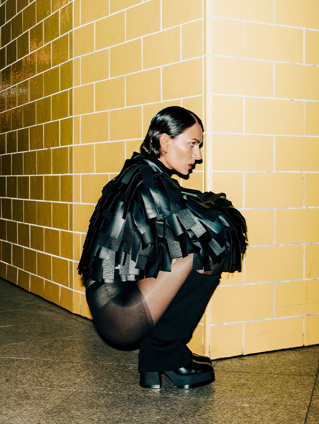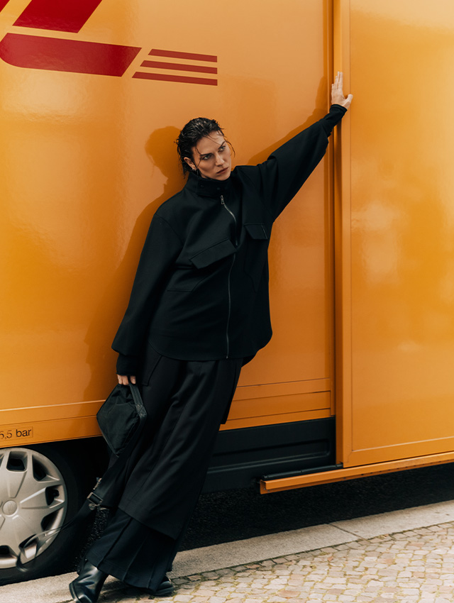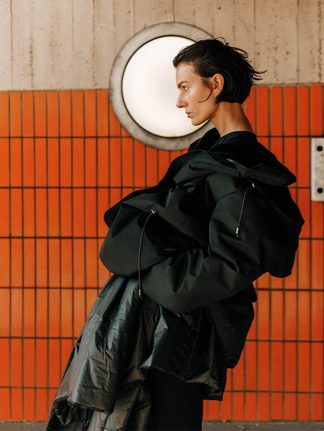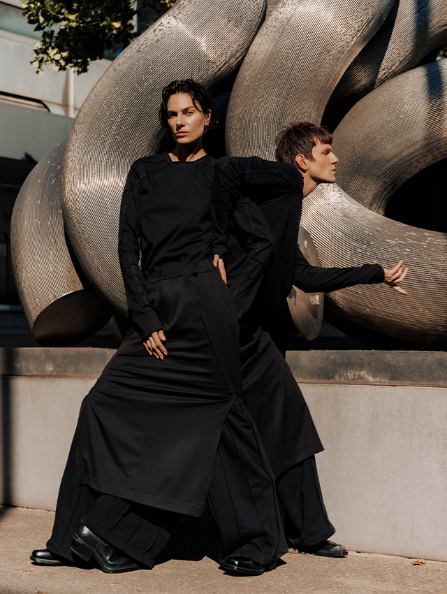 W większości czarne stylizacje są eksploracją czystej formy - odwróceniem uwagi od nadruków czy kolorów będących w pewnym sensie ponad projektem. Dzięki temu akcent przesuwa się na kształt, fakturę i to jak dany model zachowuje się w przestrzeni. Chcemy, by nasze ubrania odnajdywały się na każdej sylwetce, komplementując ją i uzupełniając się wzajemnie - poprzez silną geometryczną formę kroju, która dzięki modalnym materiałom może być stylizowana przybierając różne formy w zależności od budowy ciała.