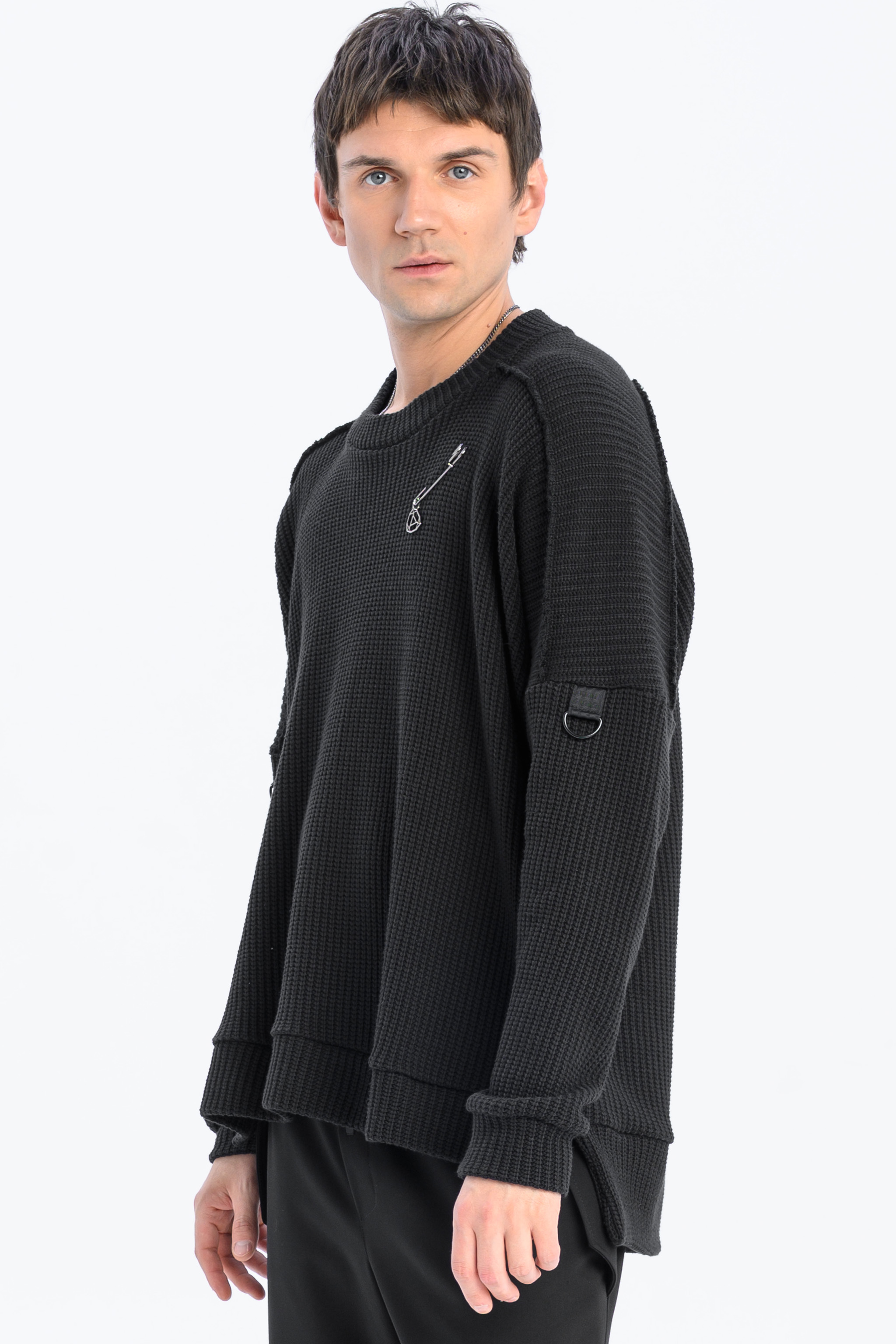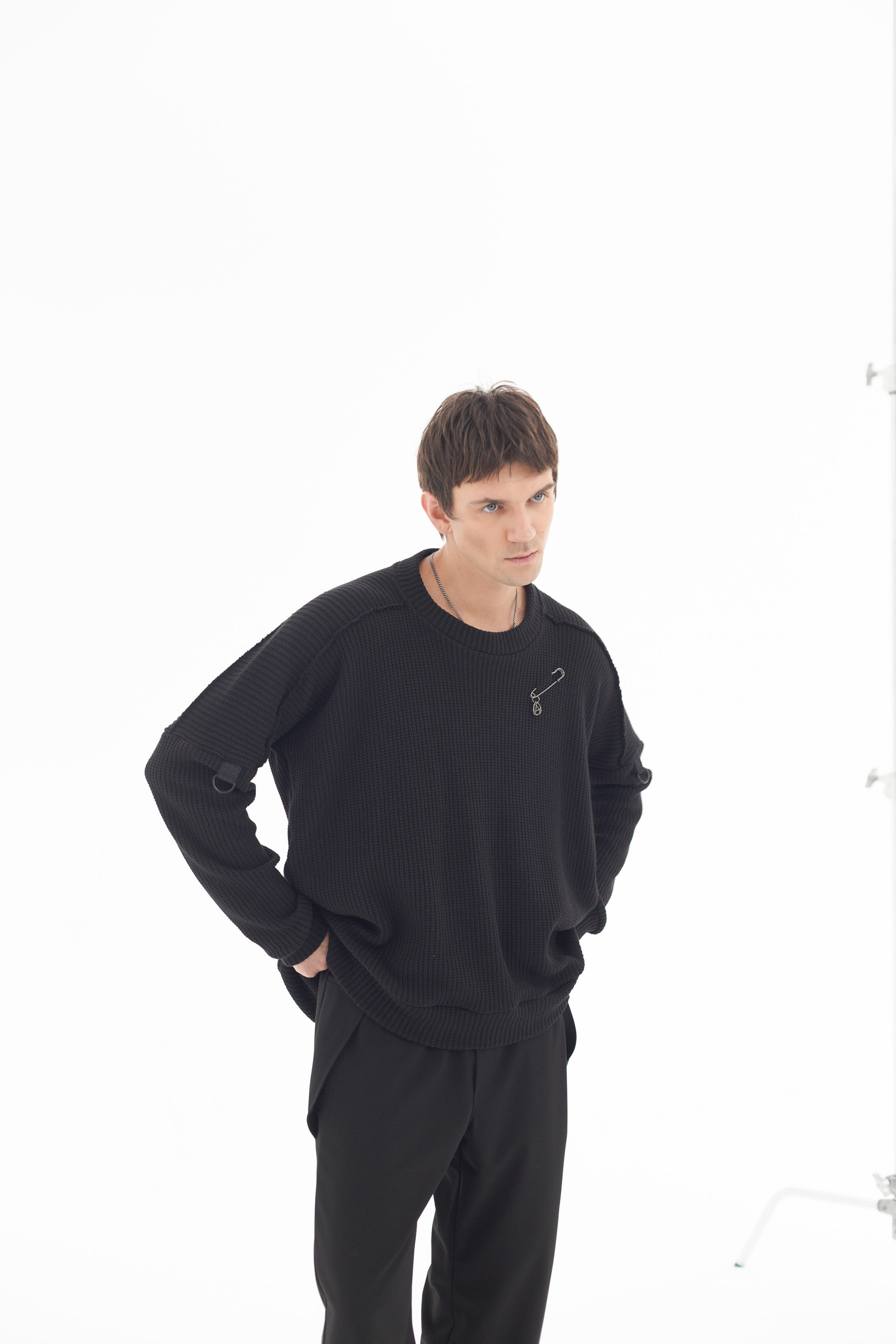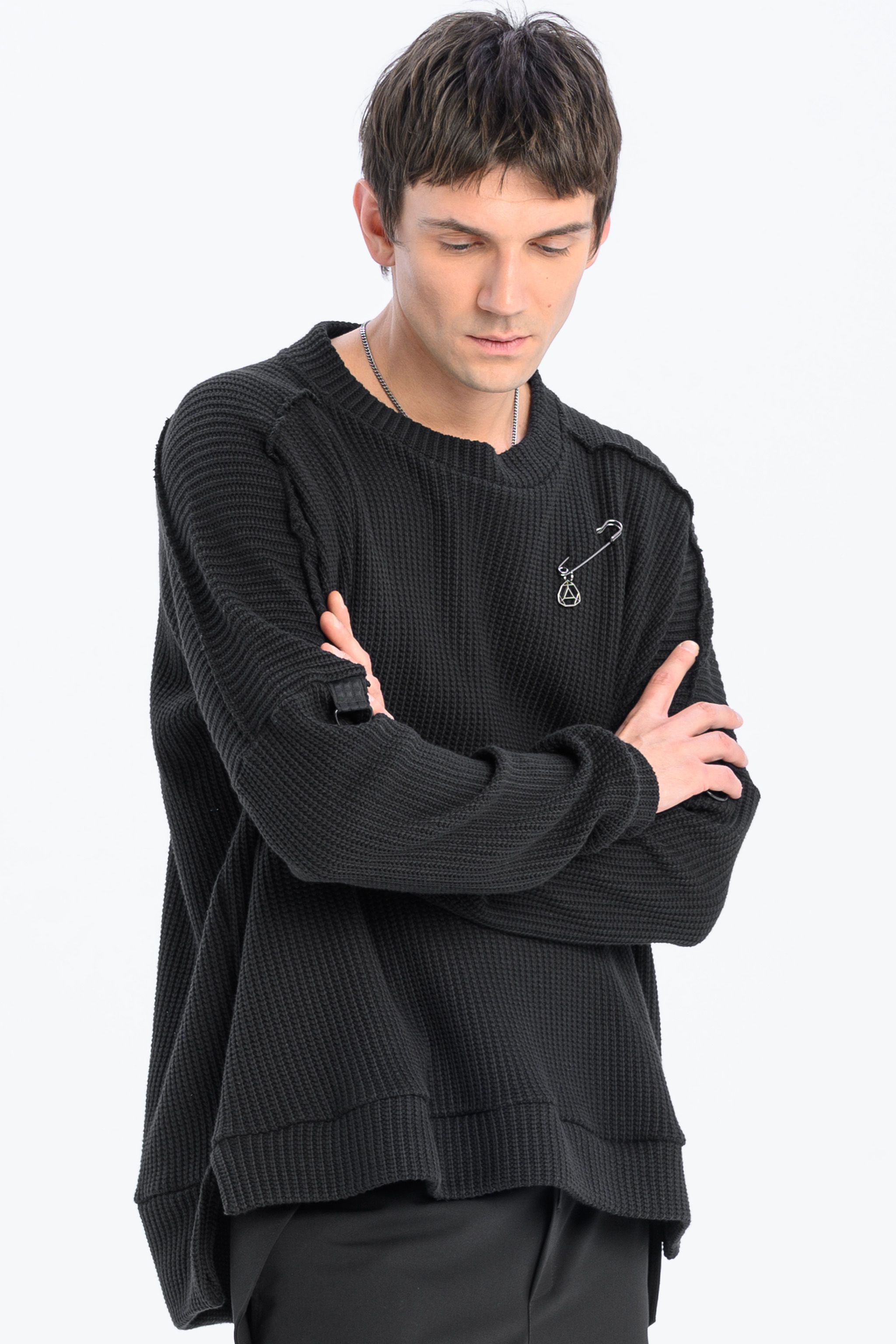 The oversized cut, geometric design and texture of the fabric further emphasise the strong form of the jumper