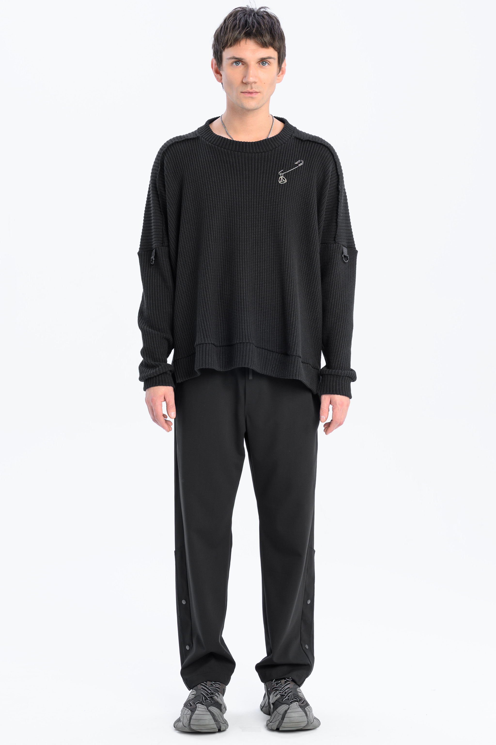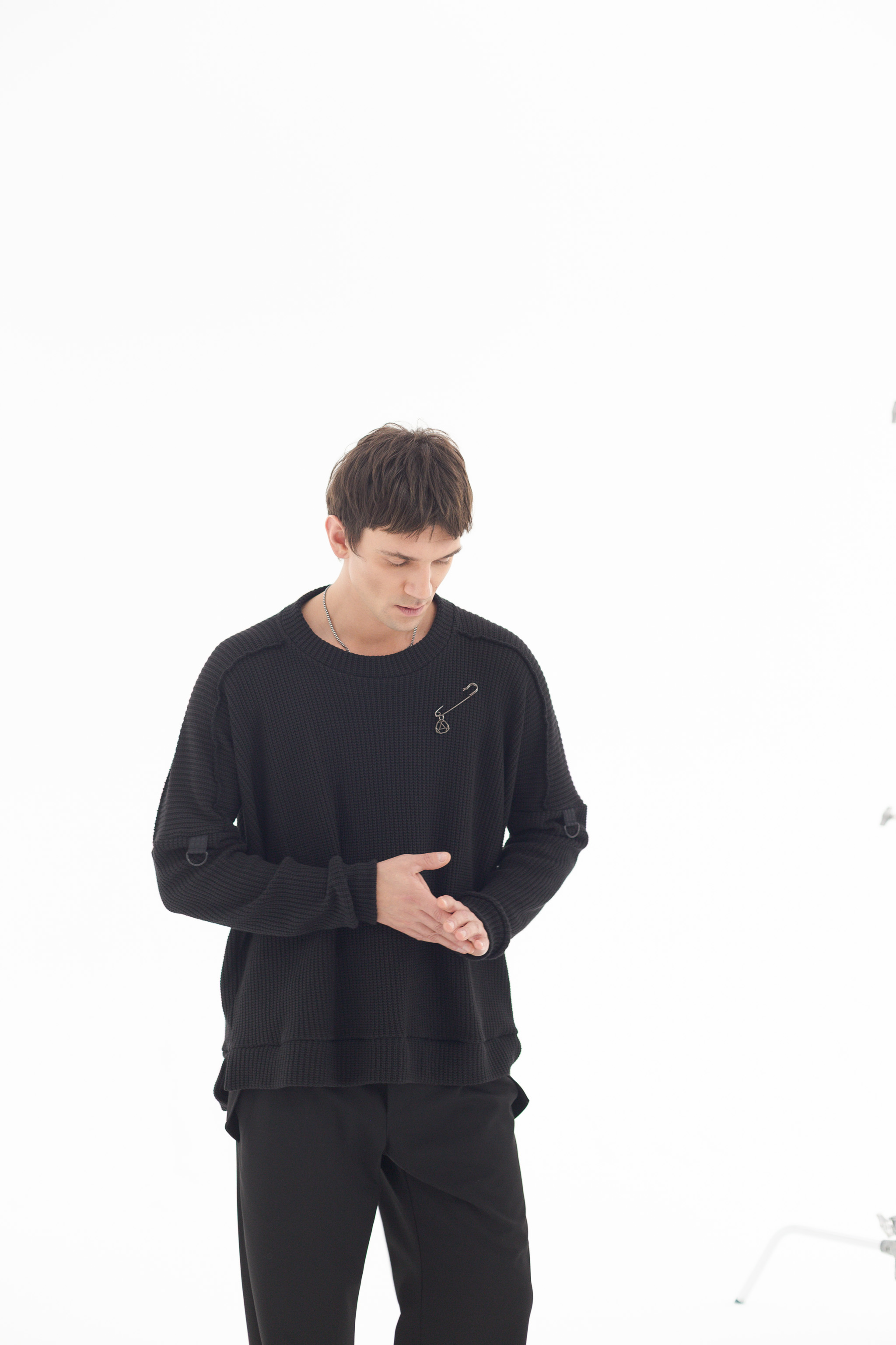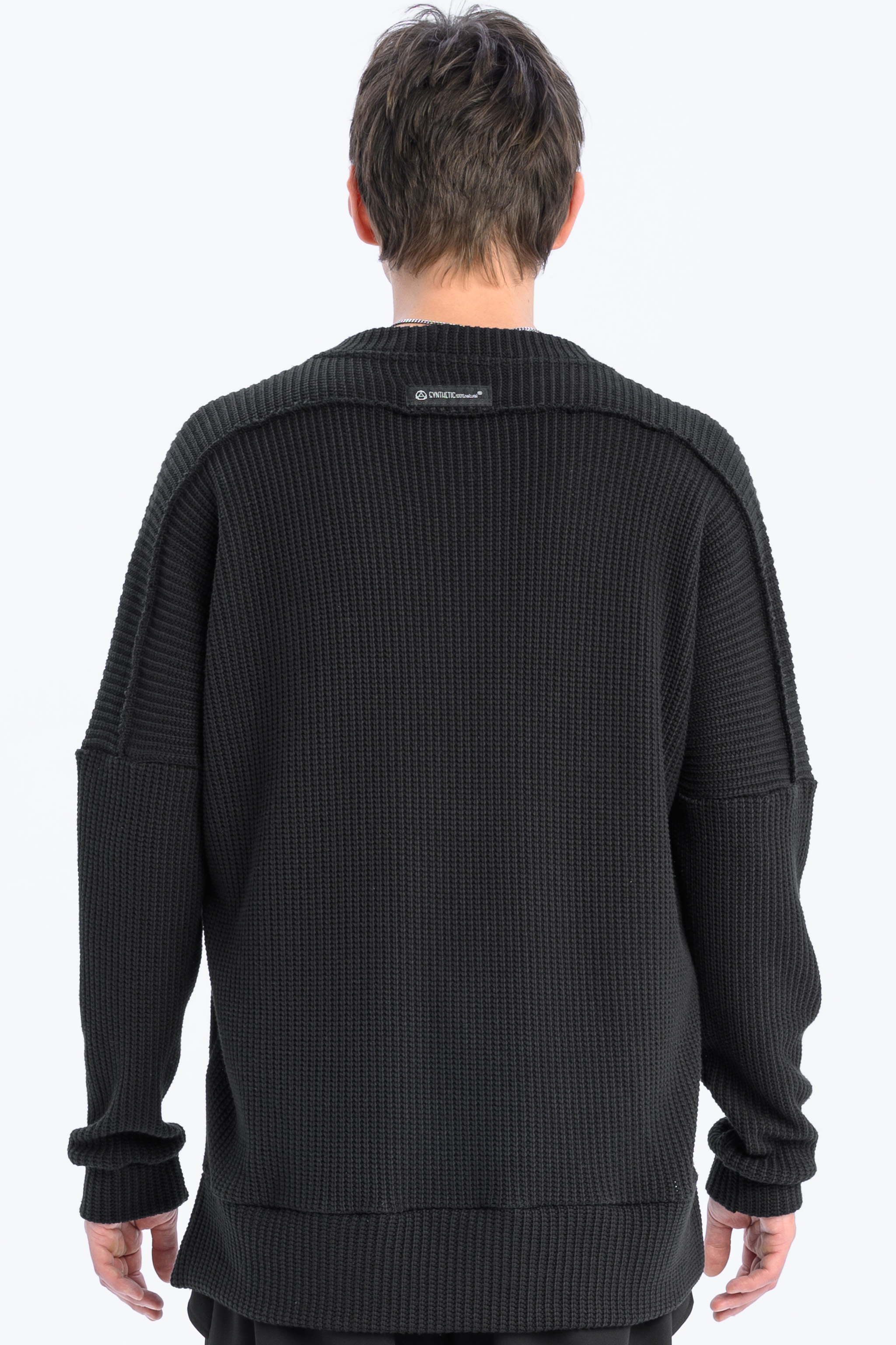 The oversized cut, geometric design and texture of the fabric further emphasise the strong form of the jumper