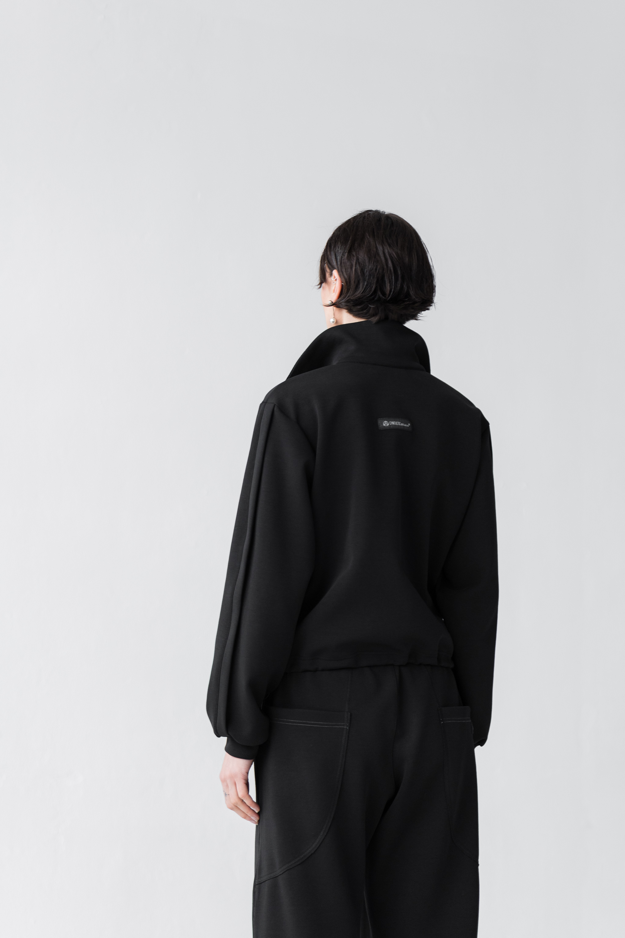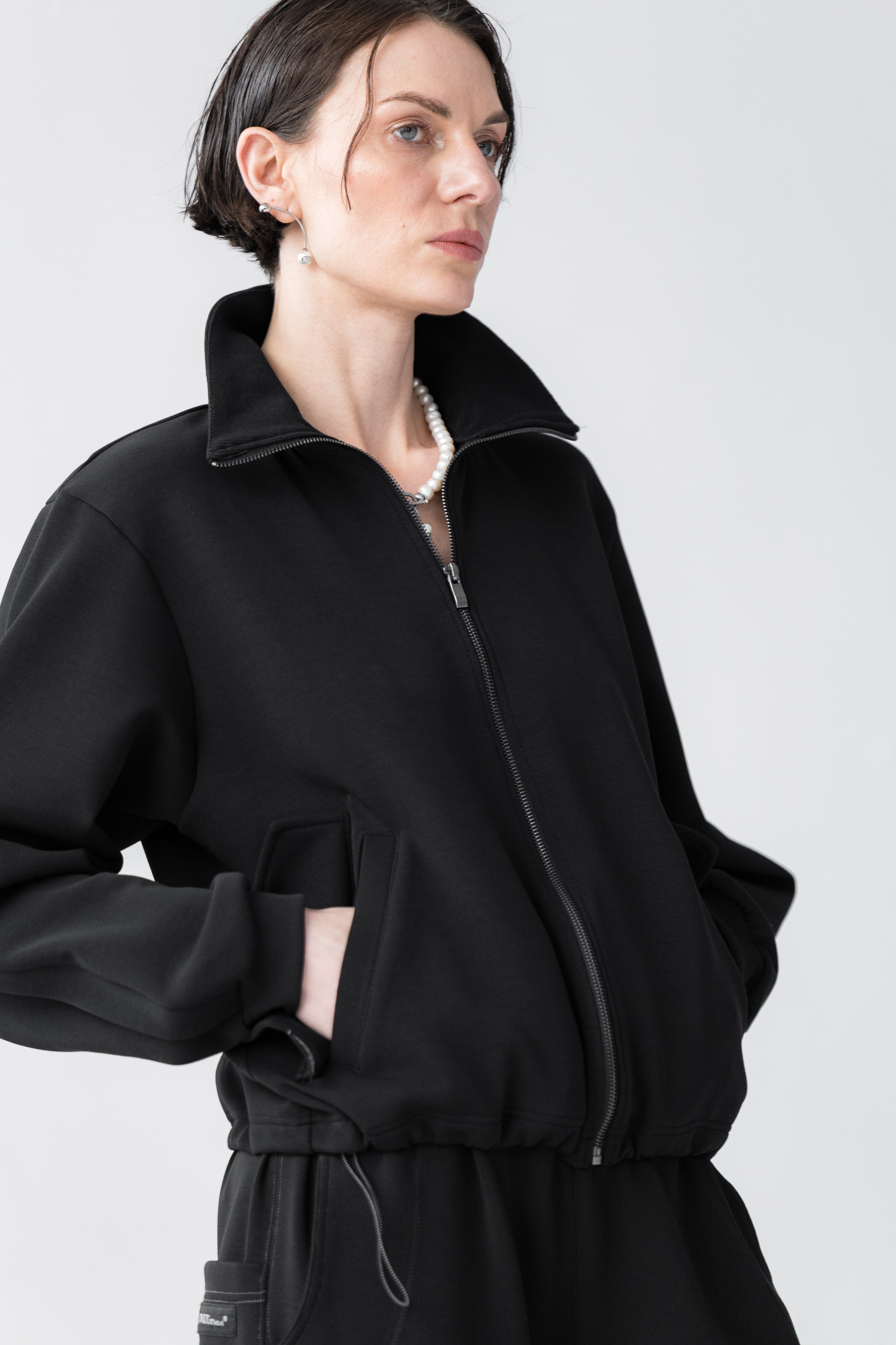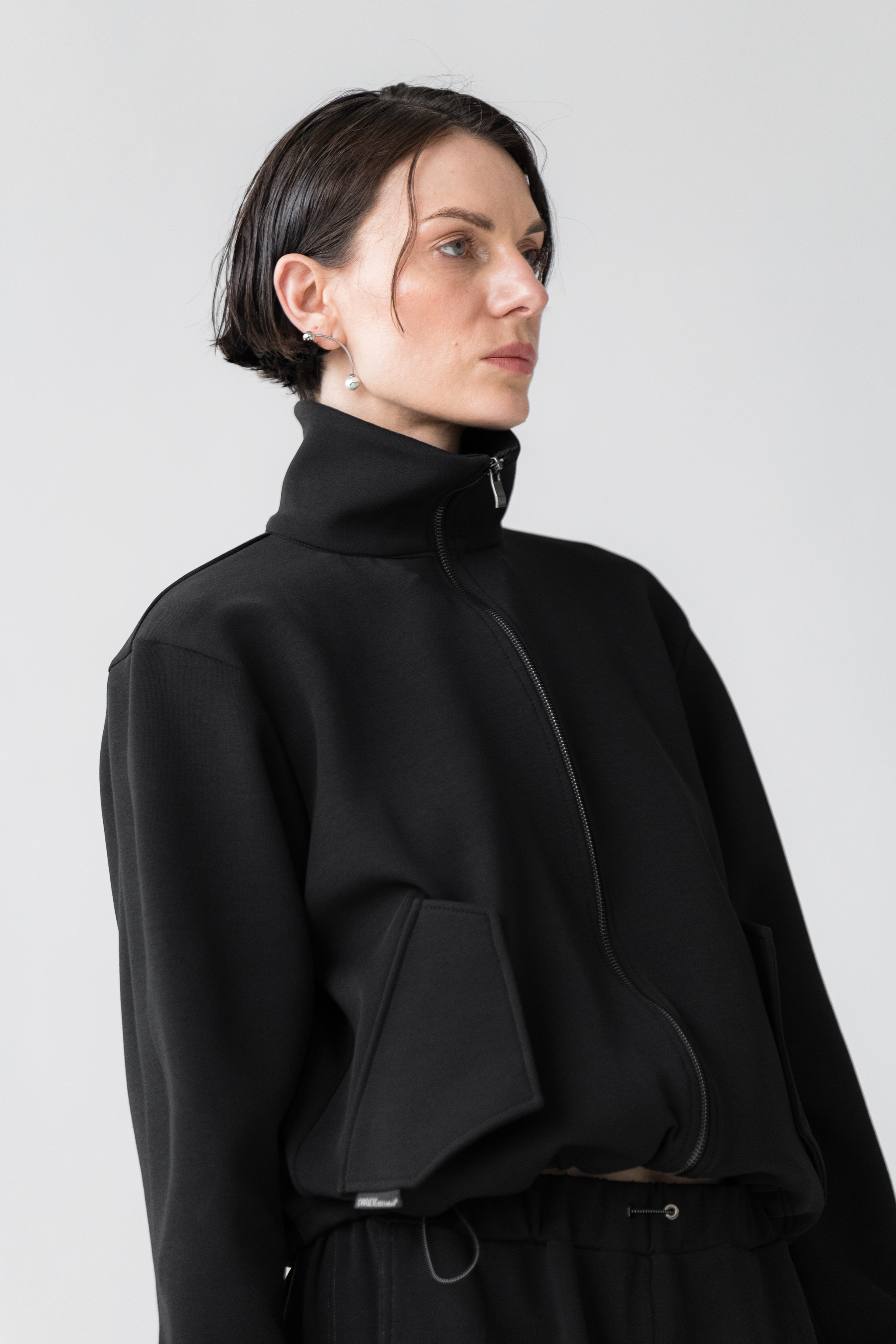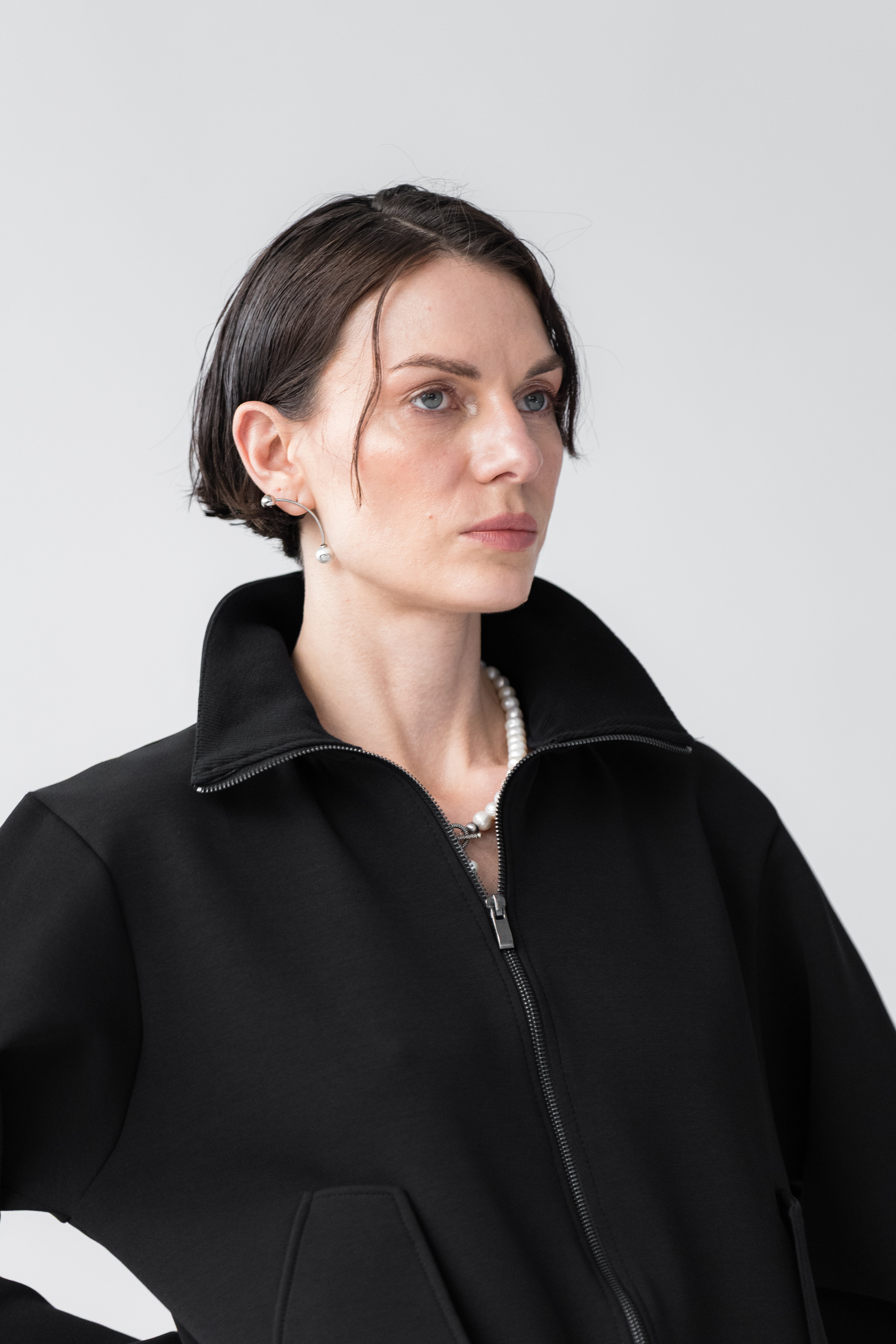 - Podwójna warstwa stójki od środka wykończona ściągaczem, wprowadzającym do projektu dodatkową teksturę