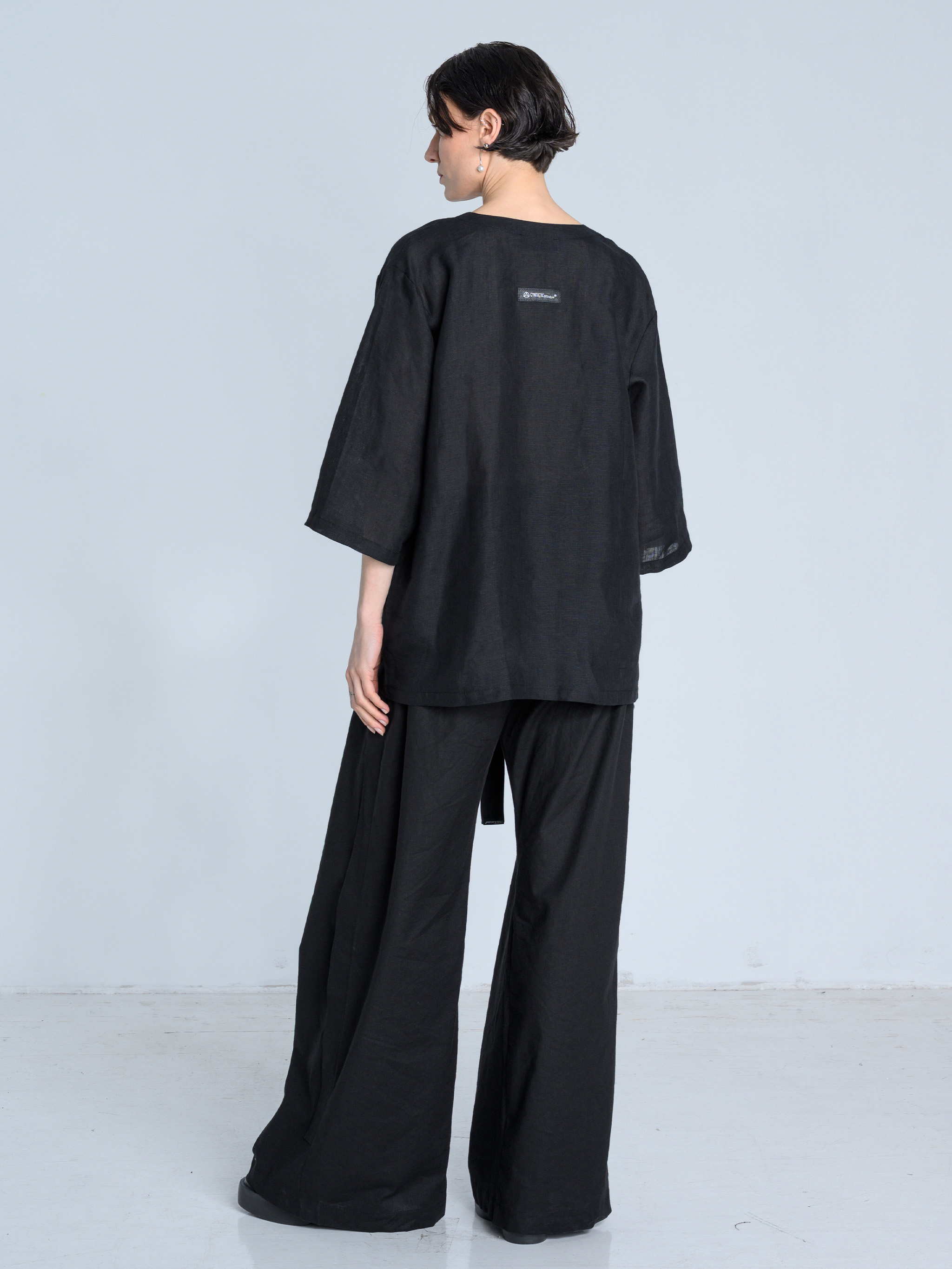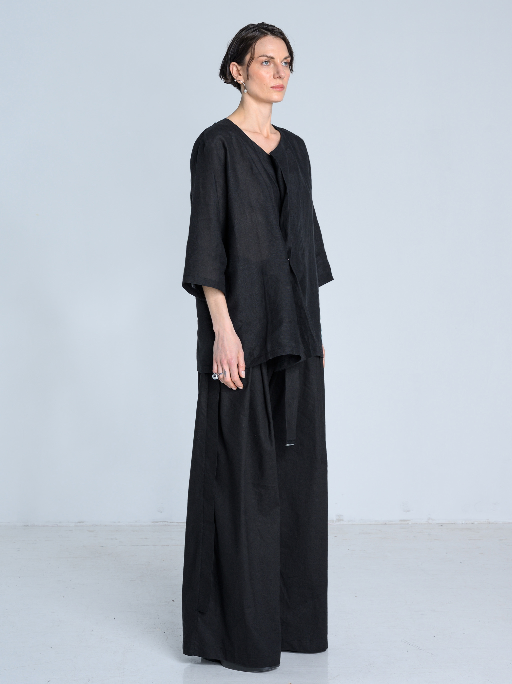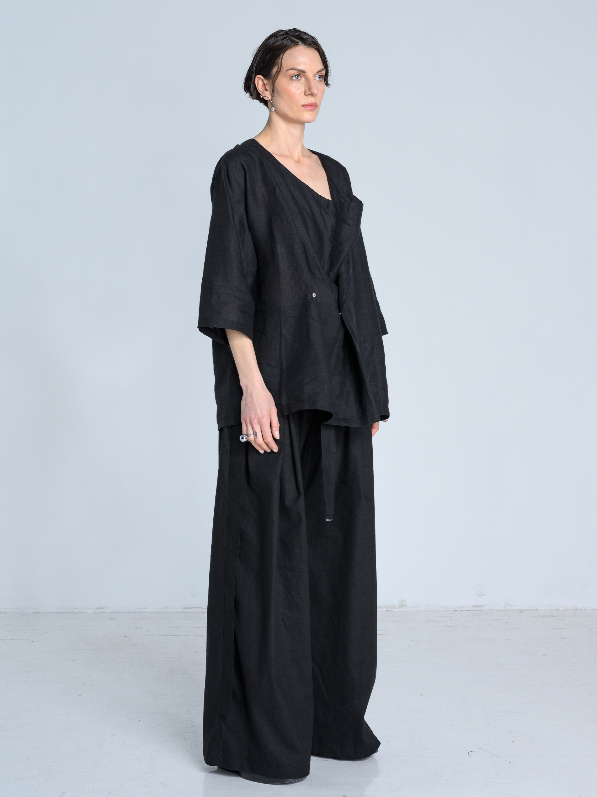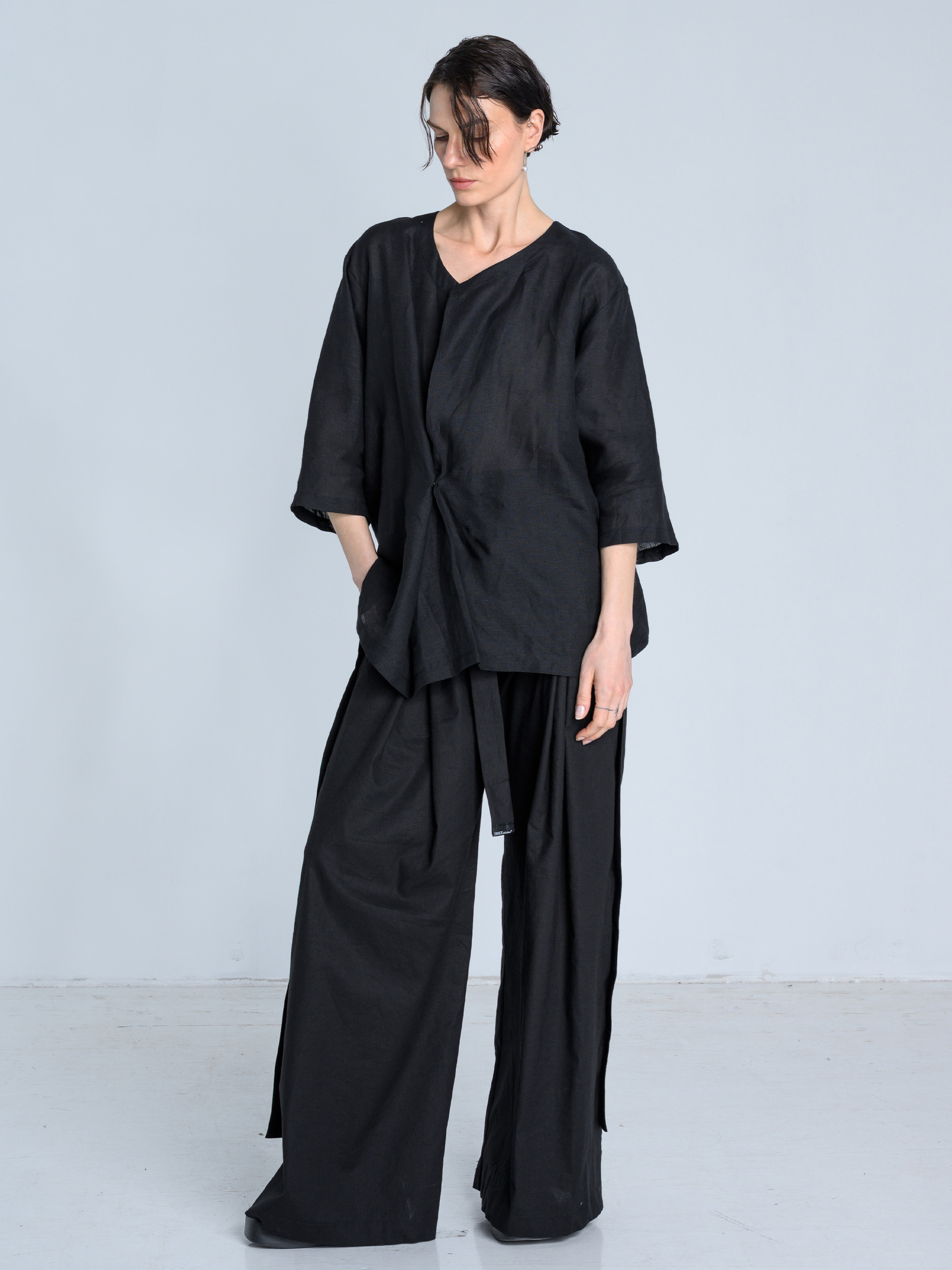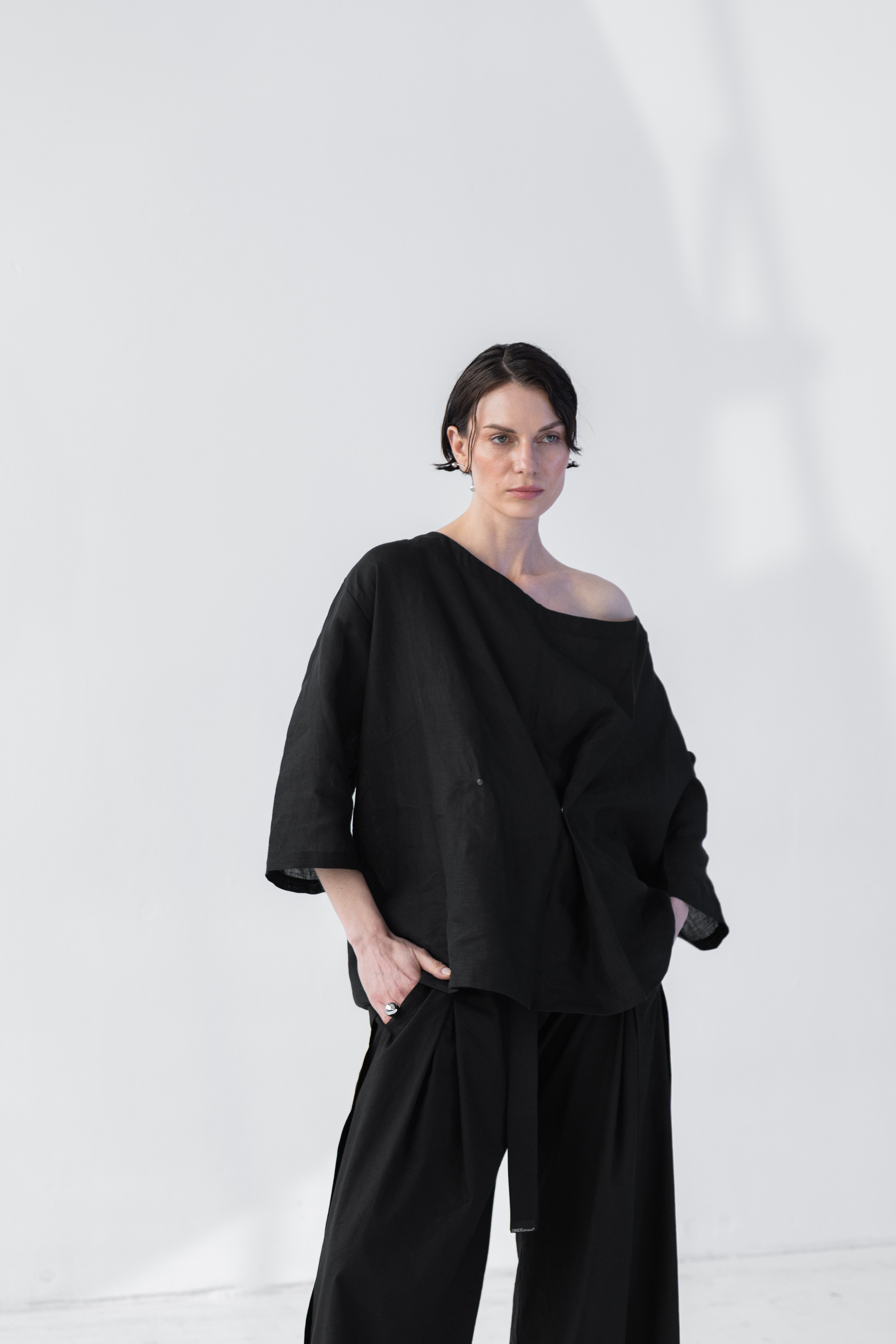 - Dekolt bluzki można nosić kopertowo założony lub swobodnie puszczony wydobywając różną geometrię projektu