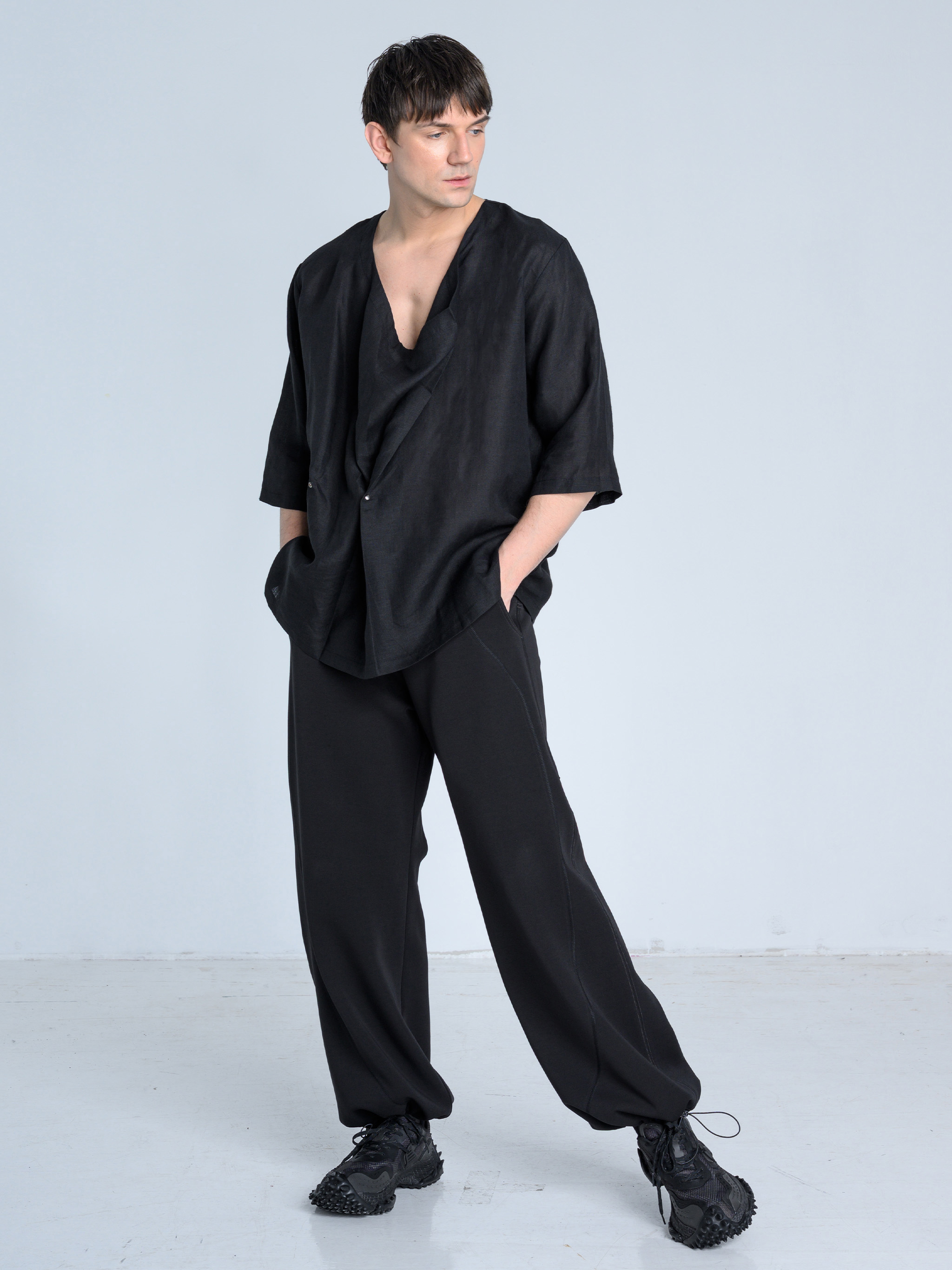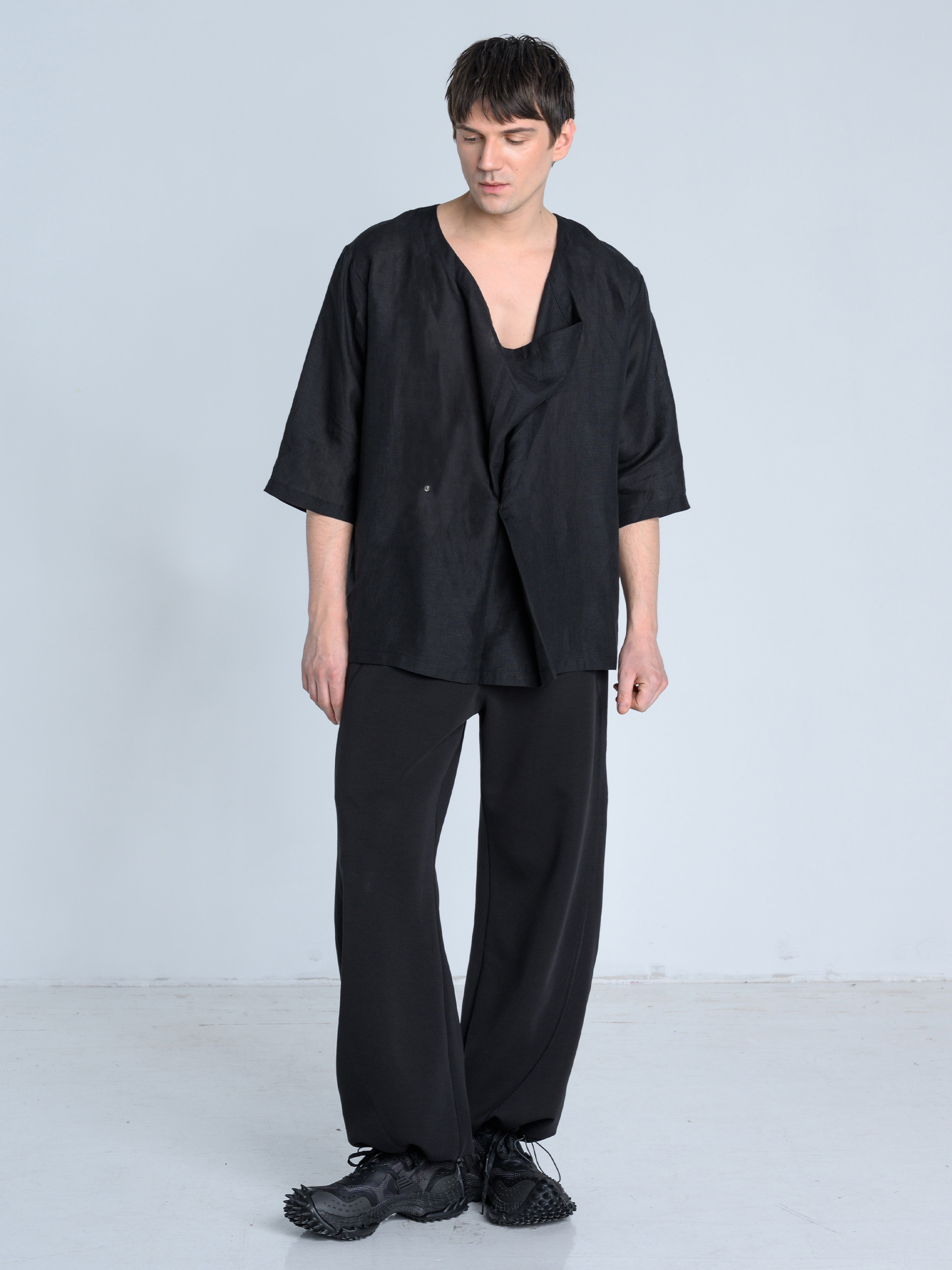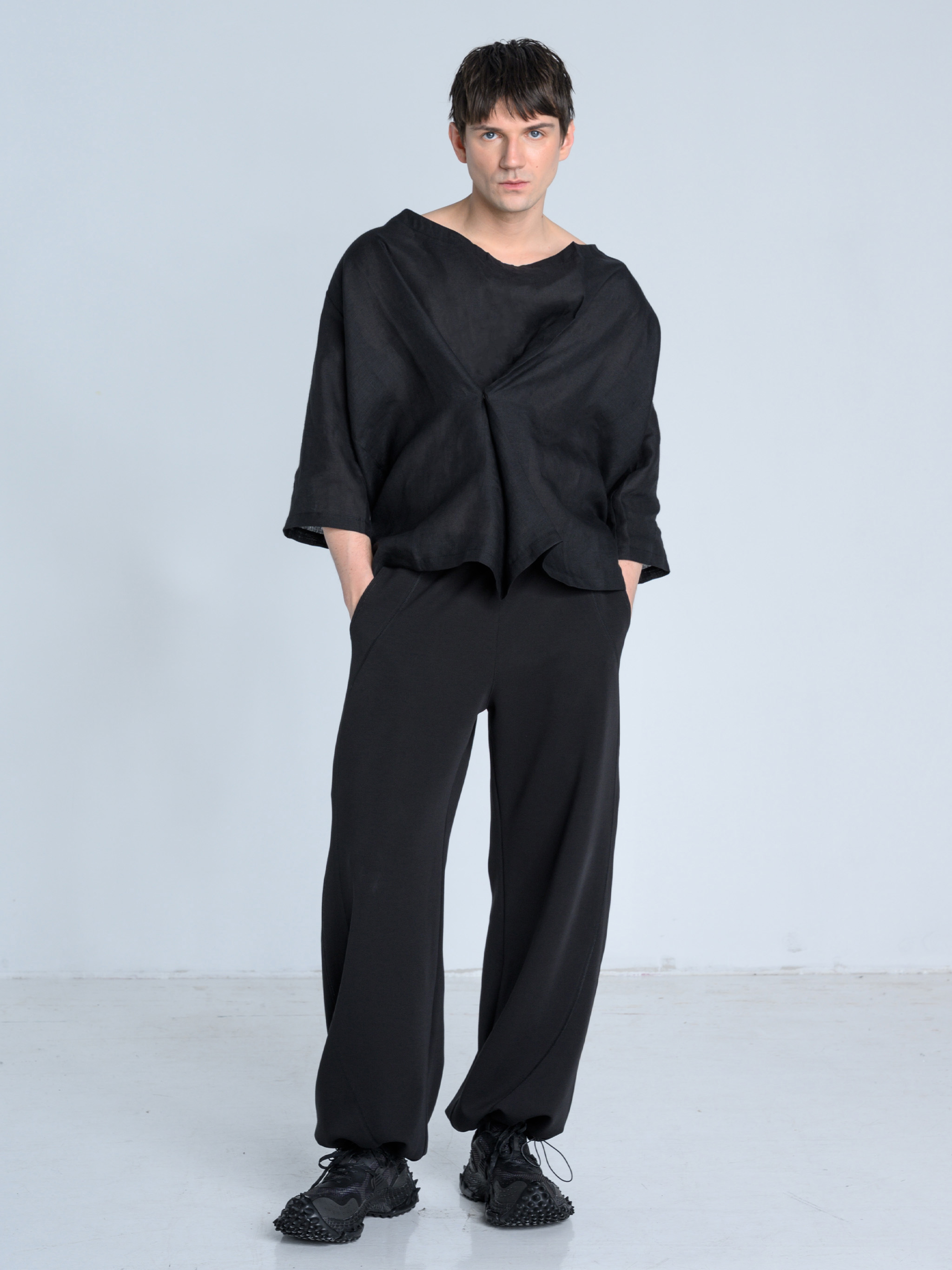 - Dekolt bluzki można nosić kopertowo założony lub swobodnie puszczony wydobywając różną geometrię projektu