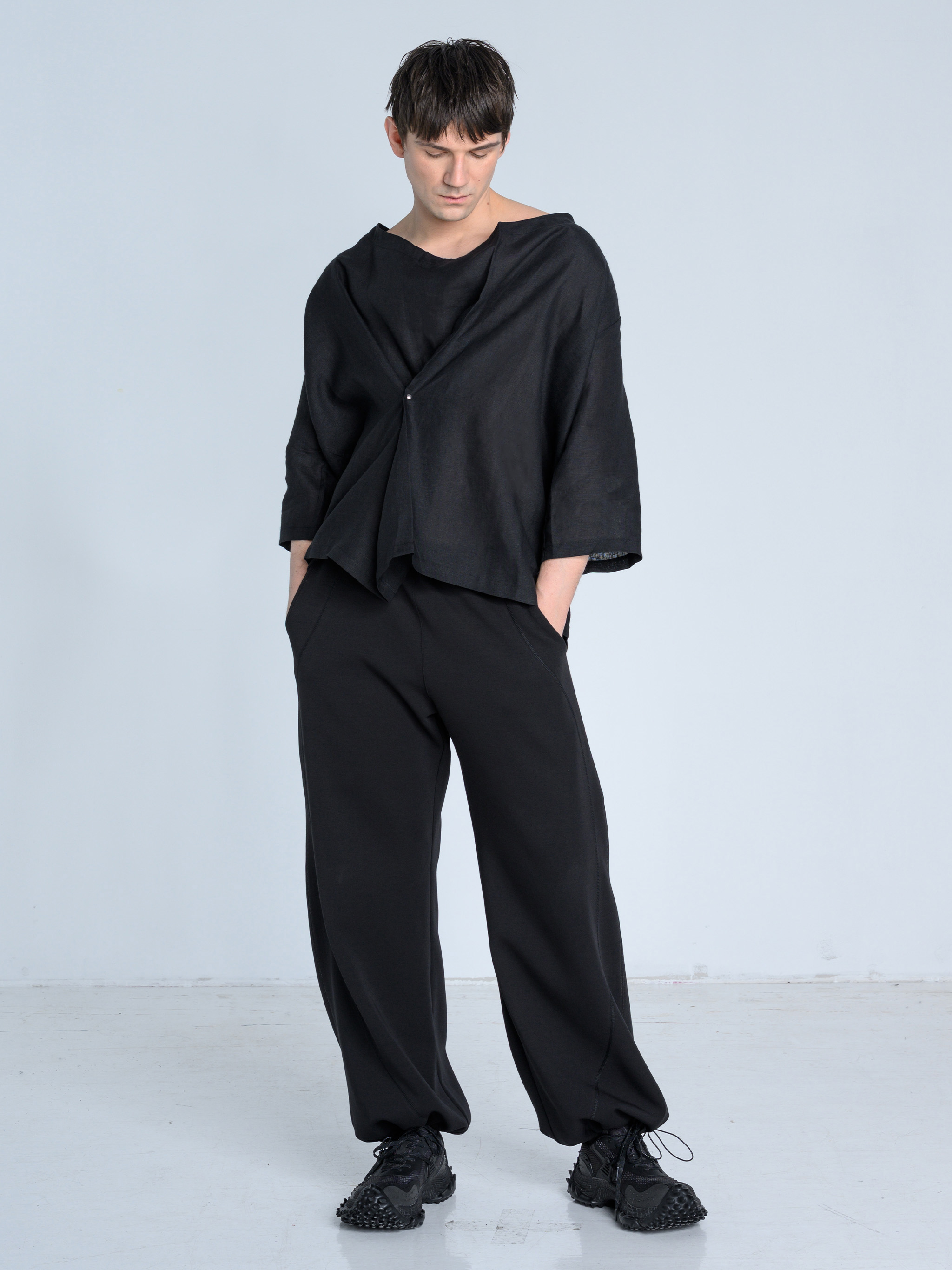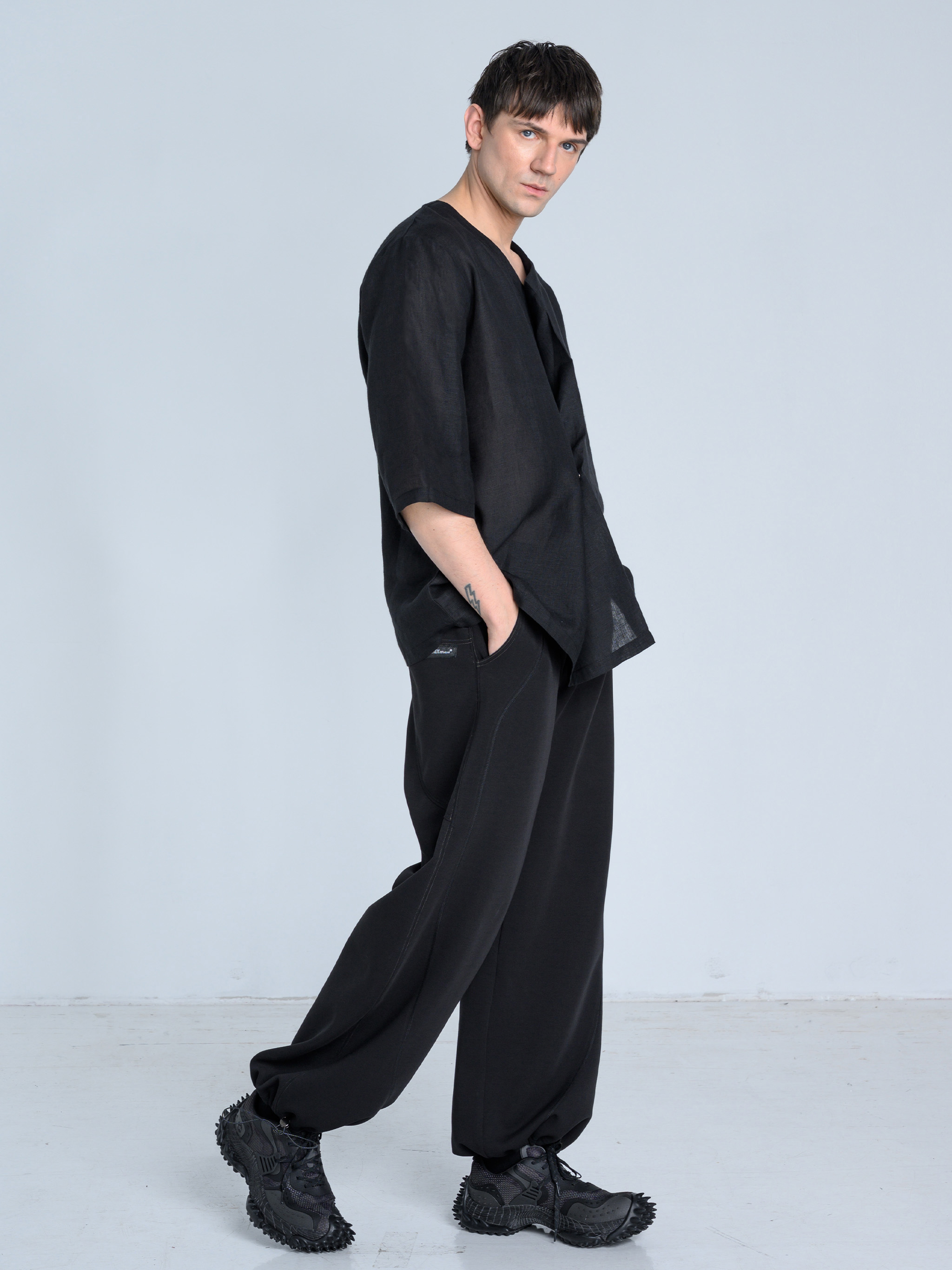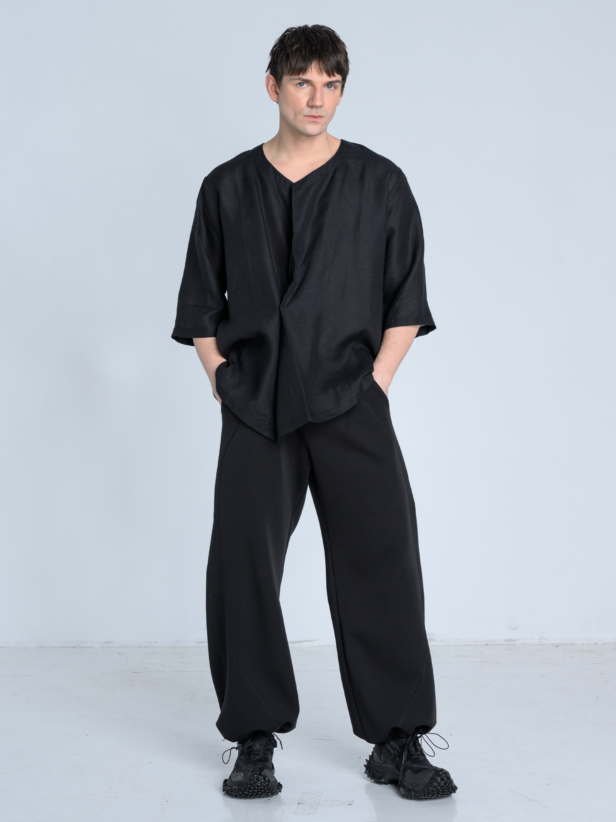 - Dekolt bluzki można nosić kopertowo założony lub swobodnie puszczony wydobywając różną geometrię projektu
