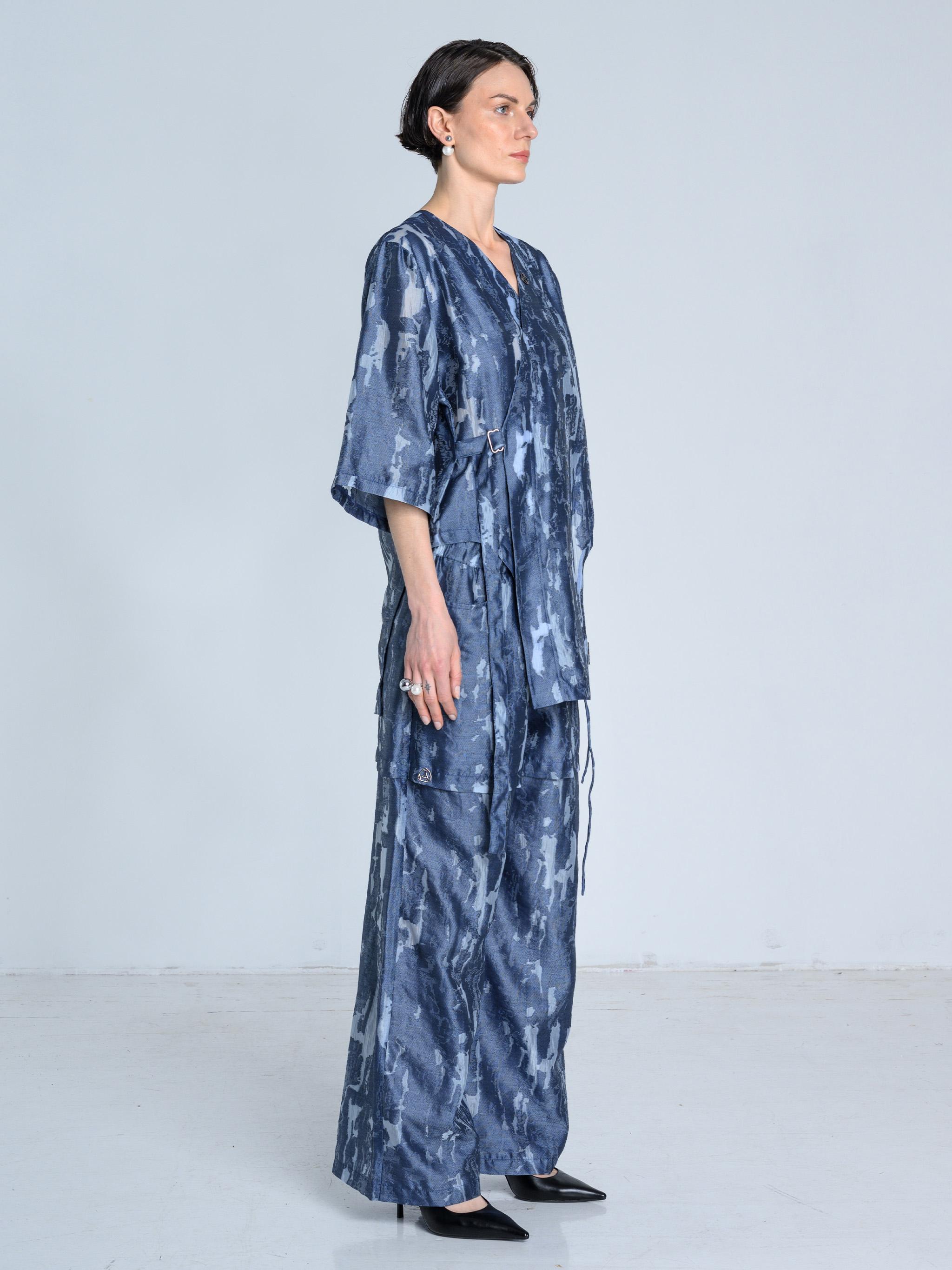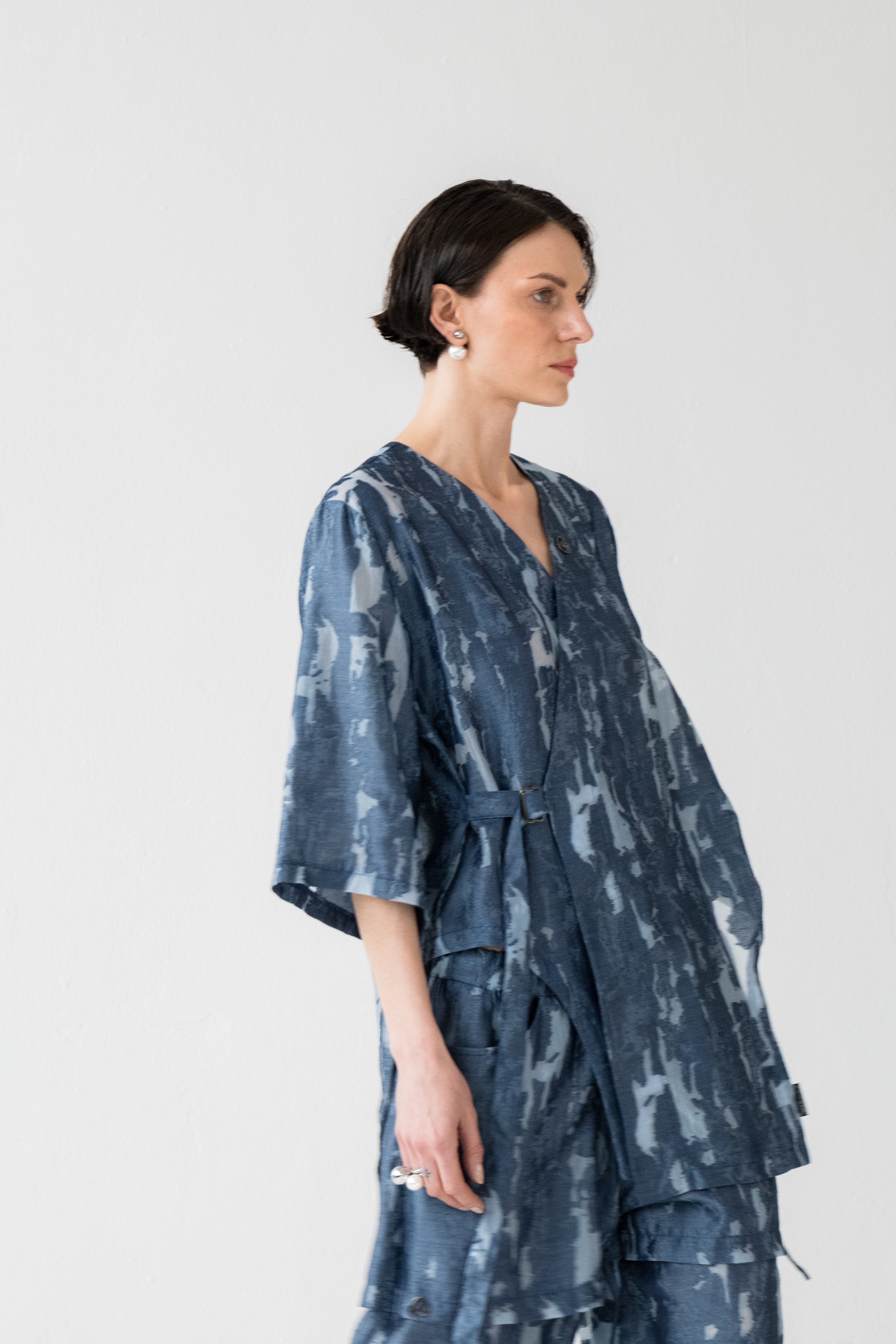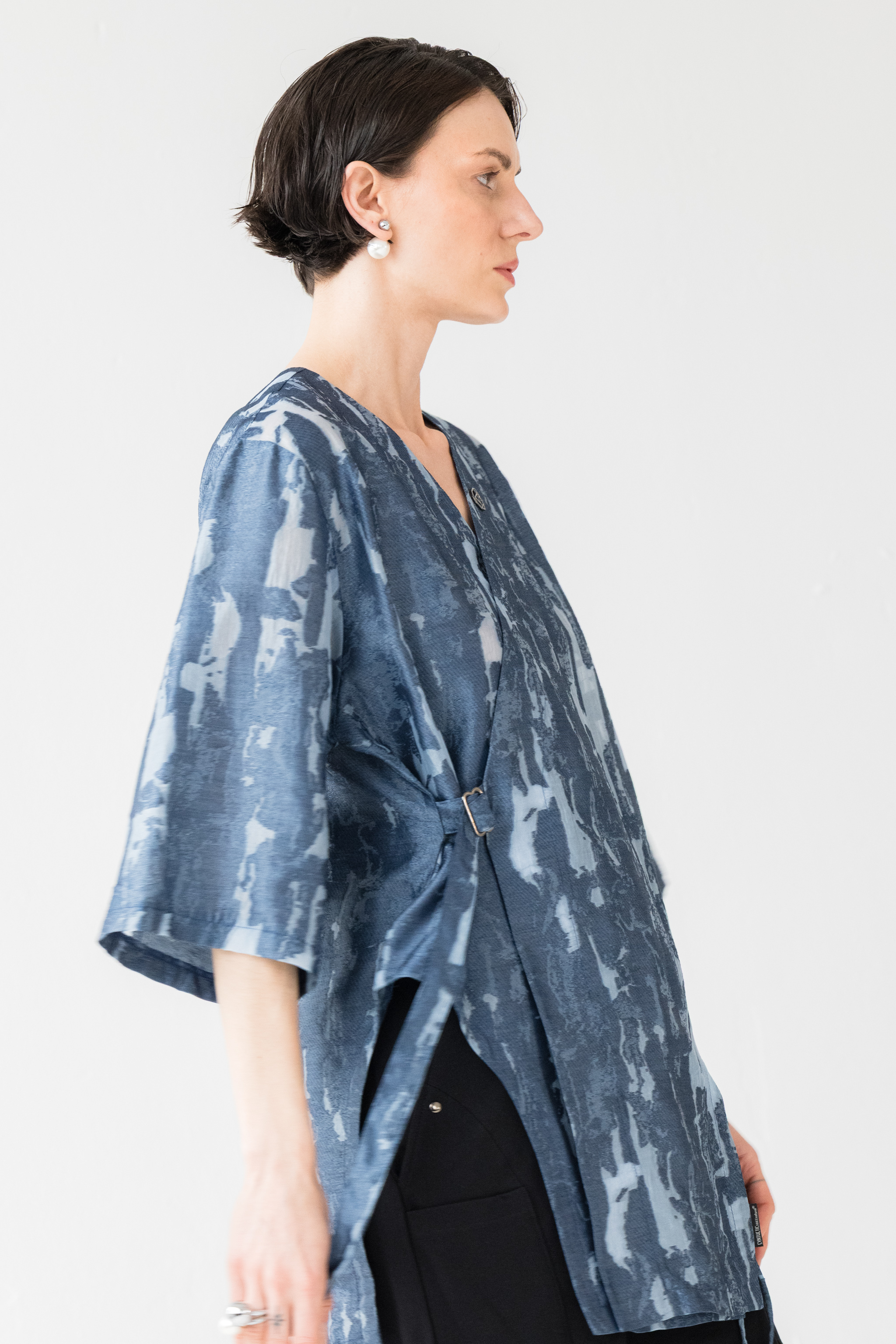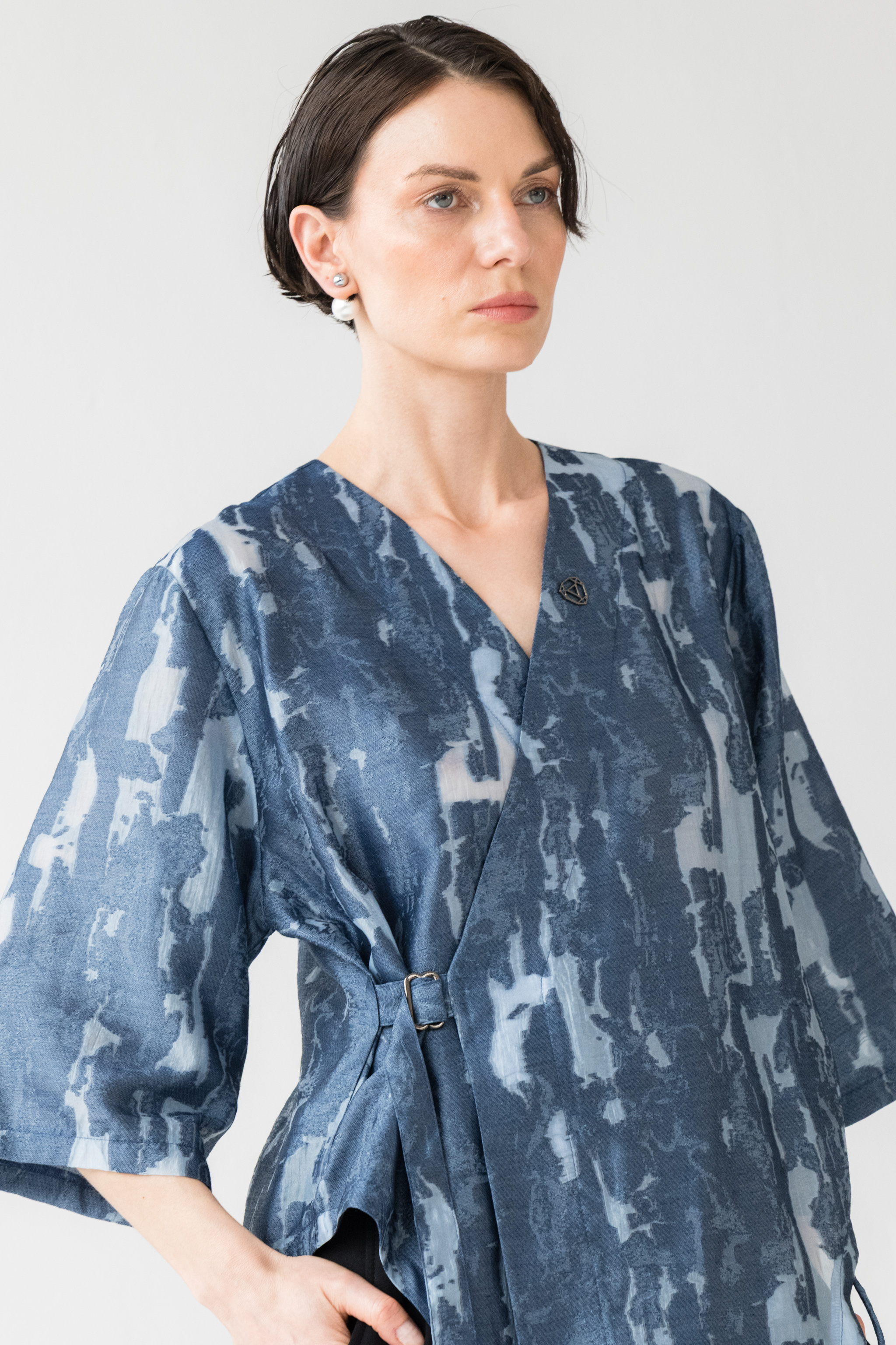 - Koszula wiązana kopertowo od środka oraz na zewnątrz za pomocą paska i metalowej klamry w kolorze ciemnego grafitu