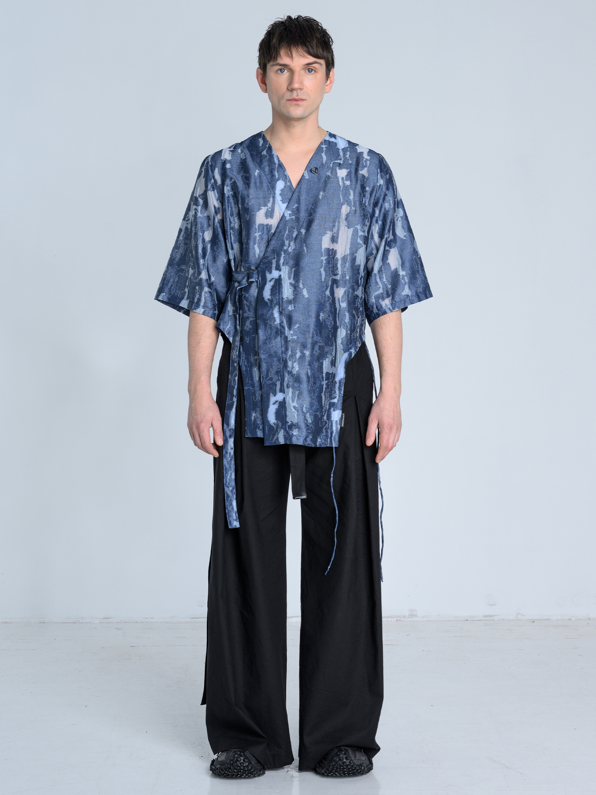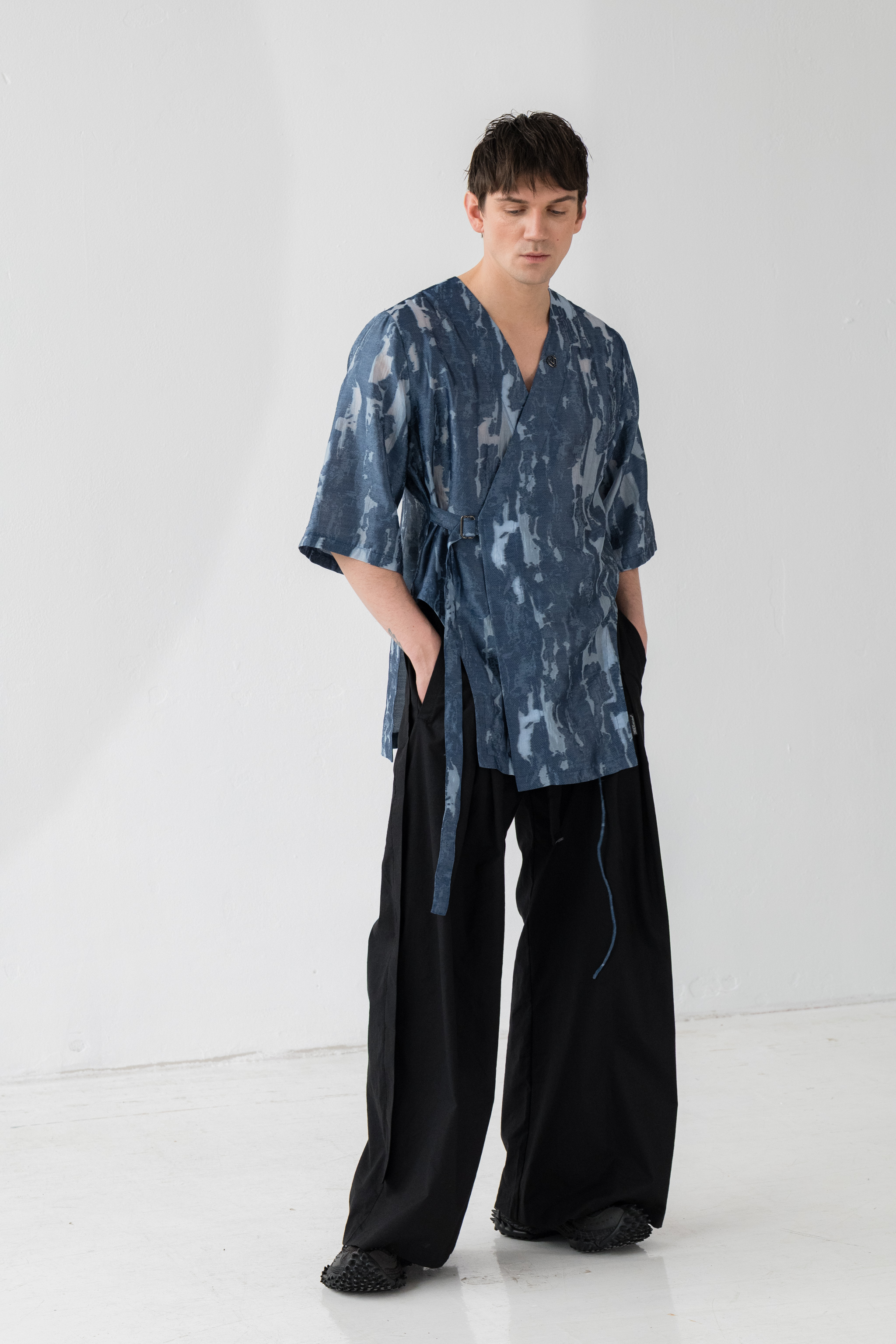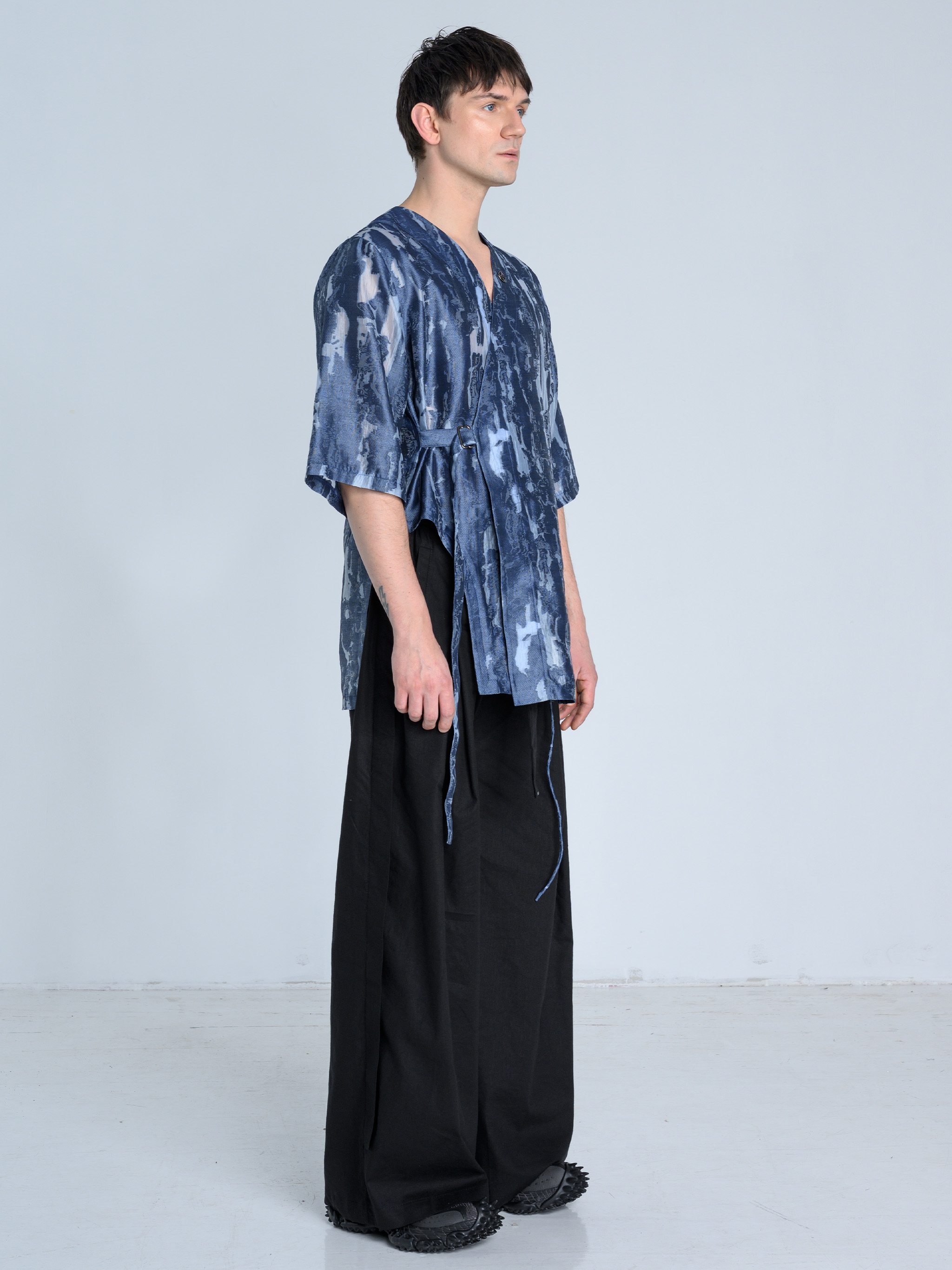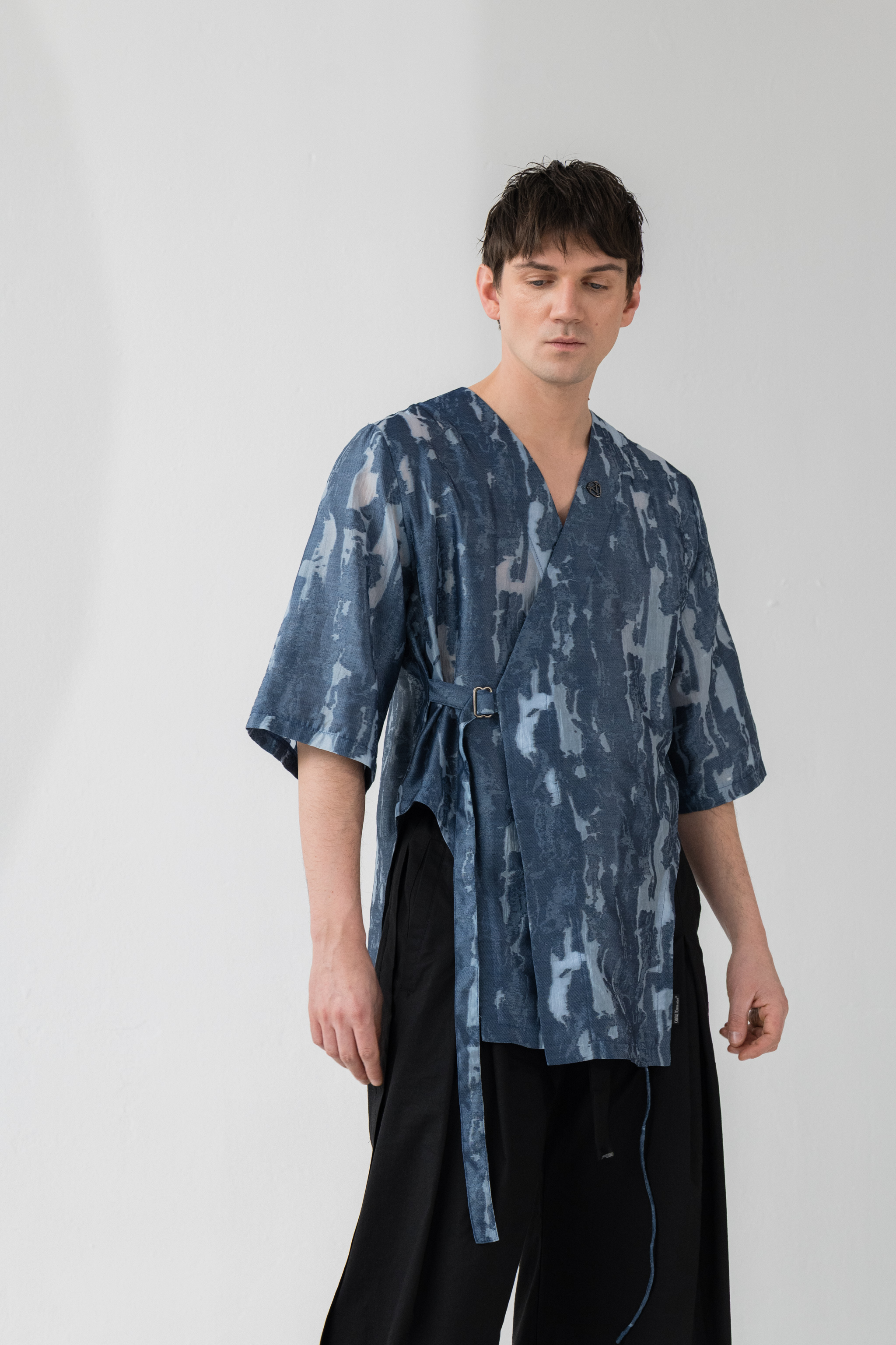 - Koszula wiązana kopertowo od środka oraz na zewnątrz za pomocą paska i metalowej klamry w kolorze ciemnego grafitu