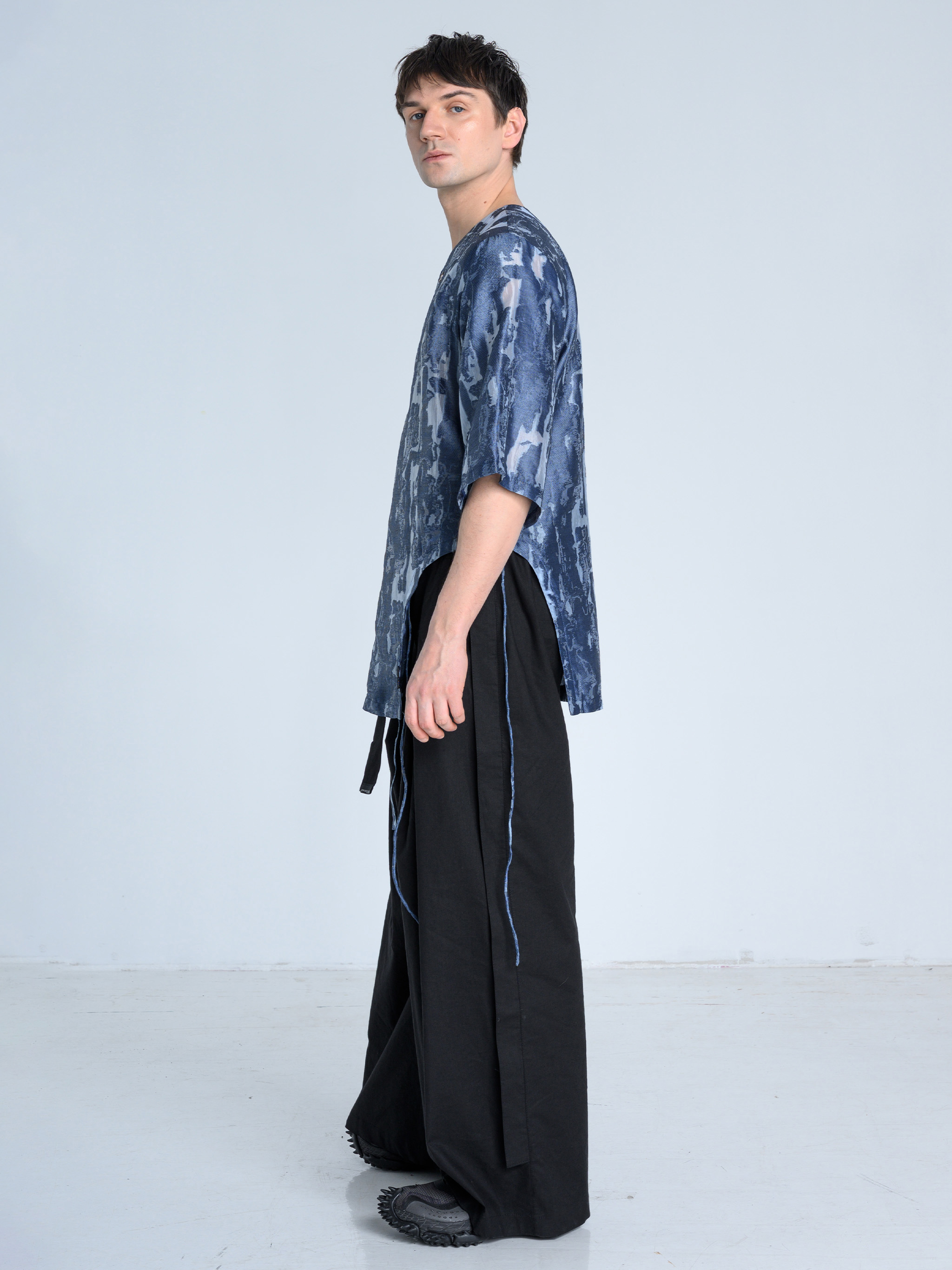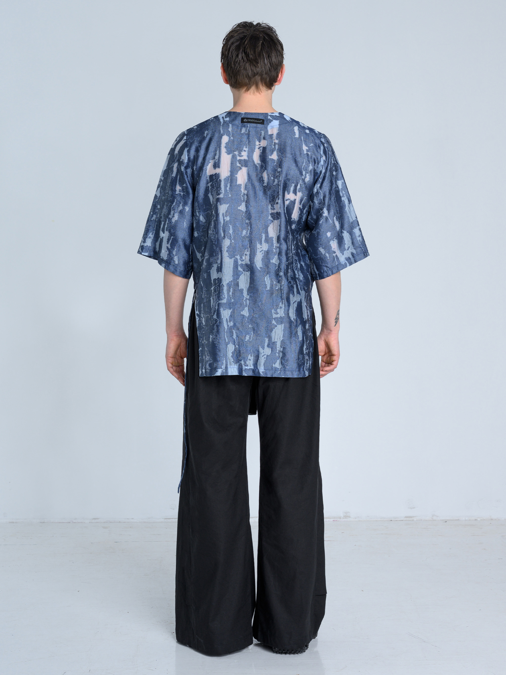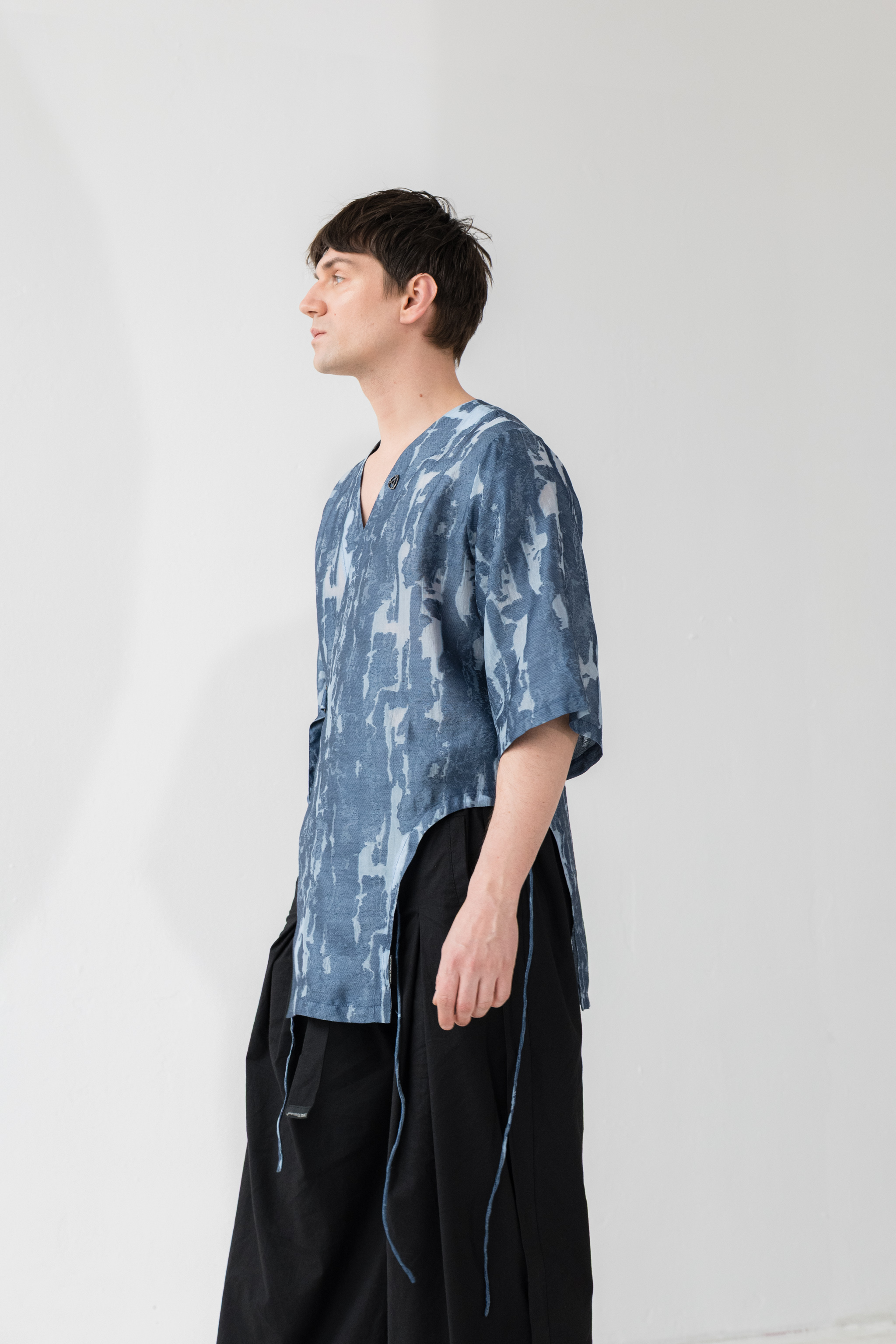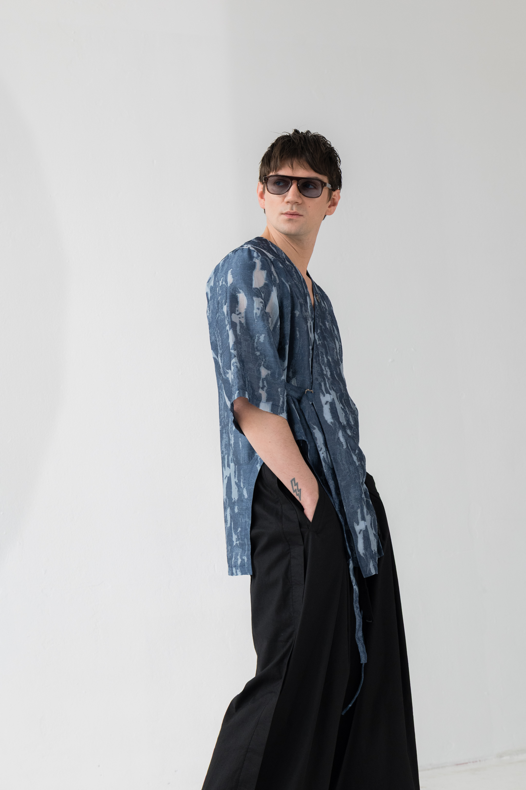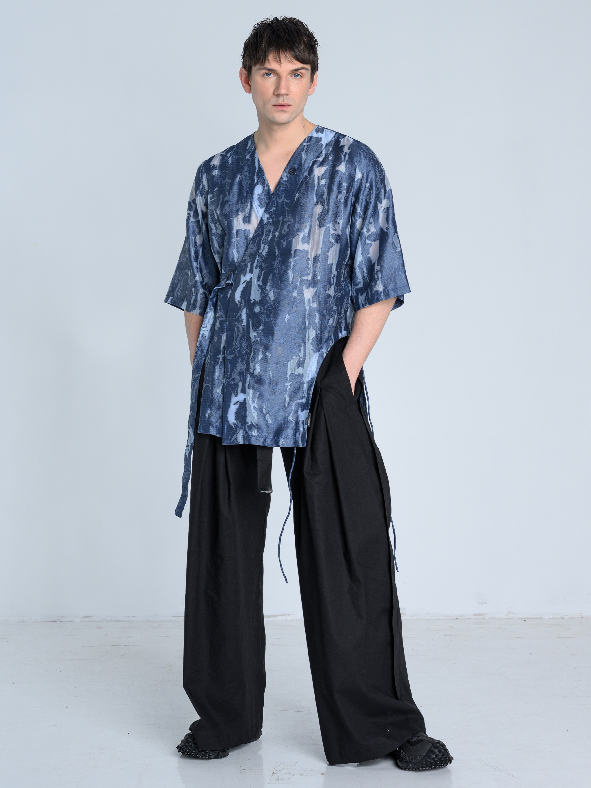 - Koszula wiązana kopertowo od środka oraz na zewnątrz za pomocą paska i metalowej klamry w kolorze ciemnego grafitu