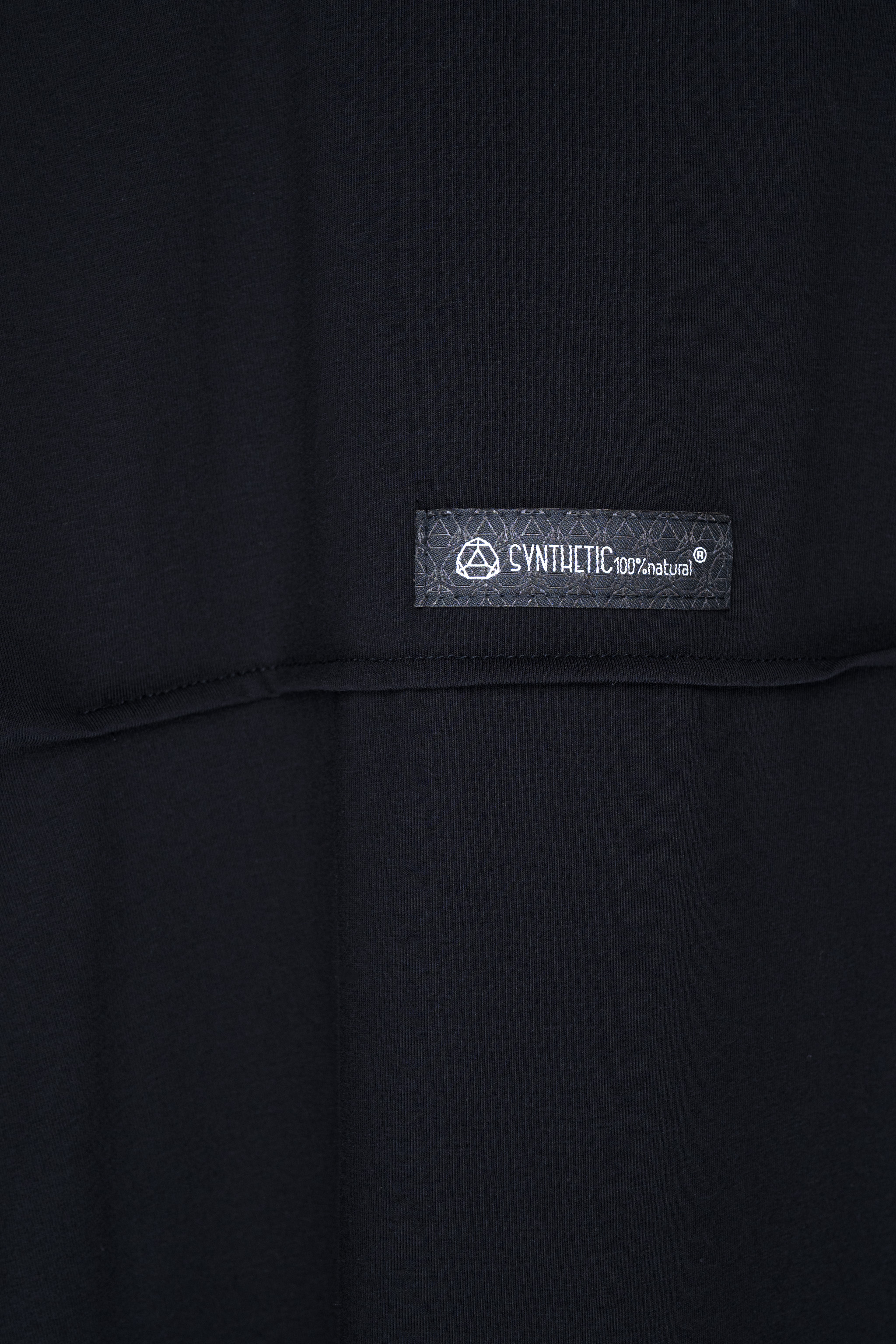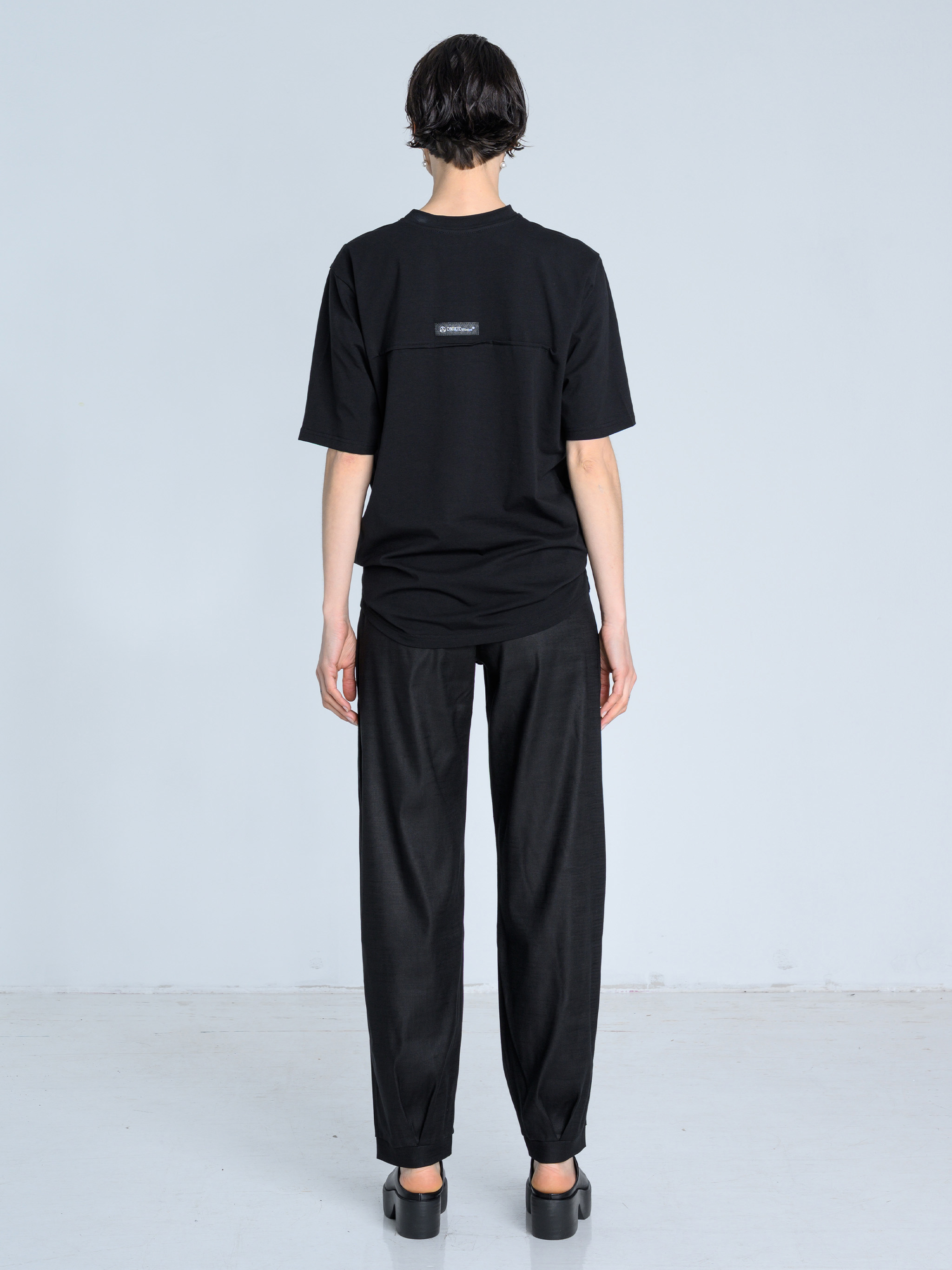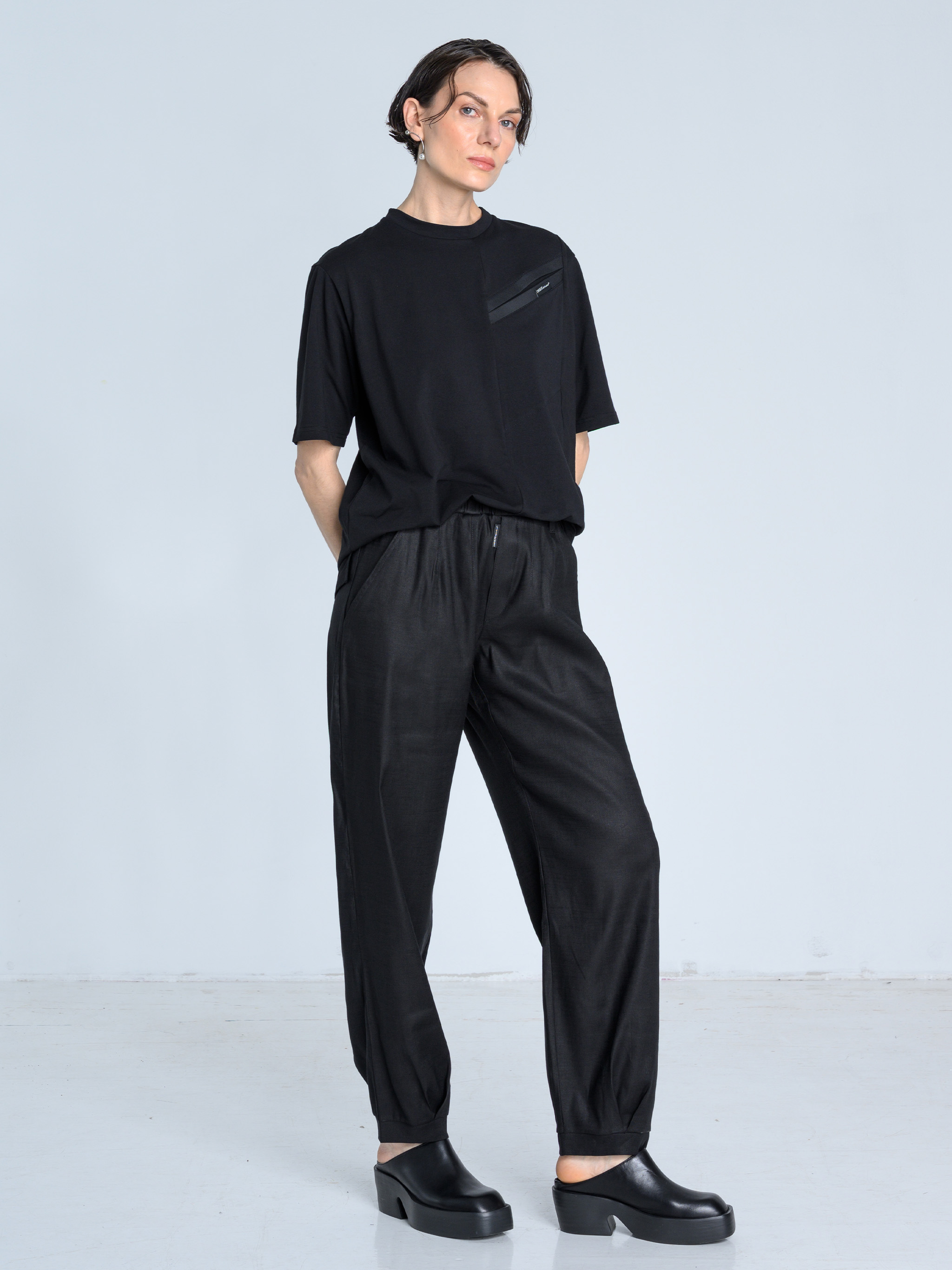 - Geometryczne cięcia na przodzie t-shirtu wydłużają linię sylwetki