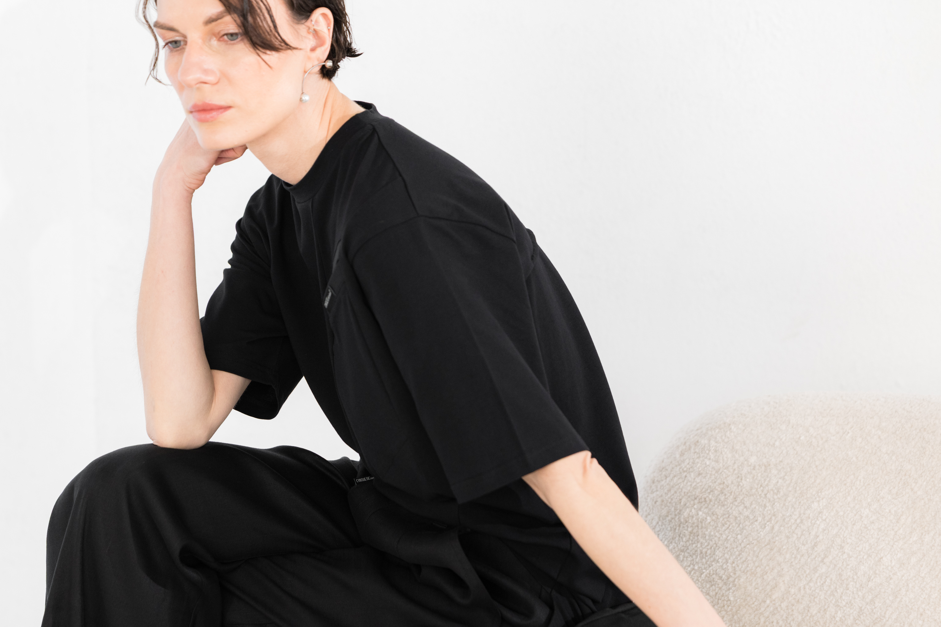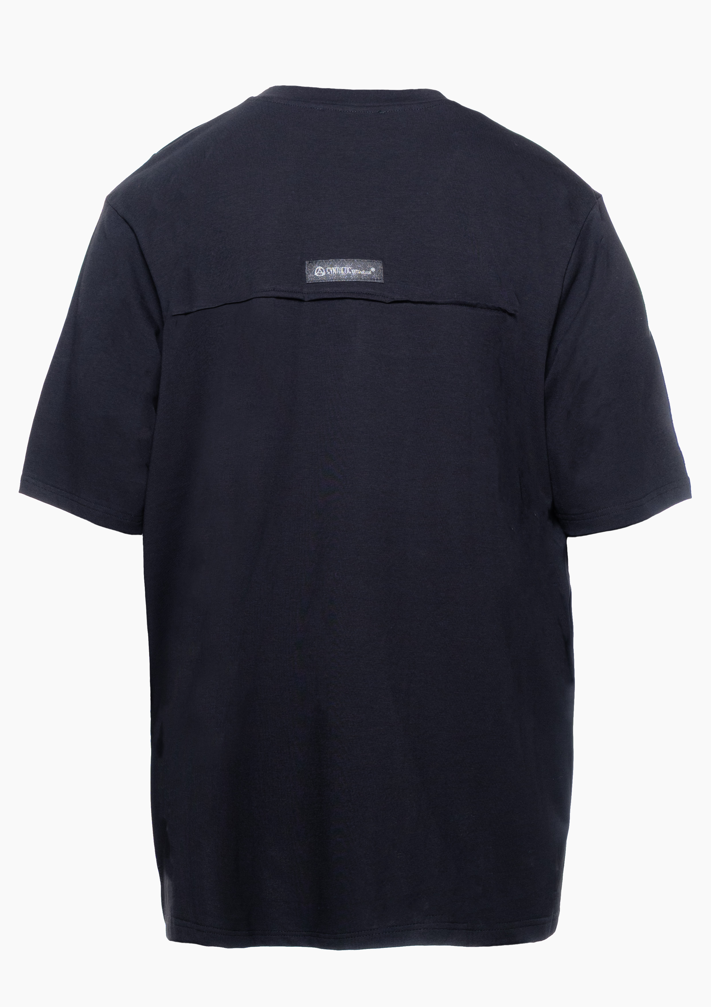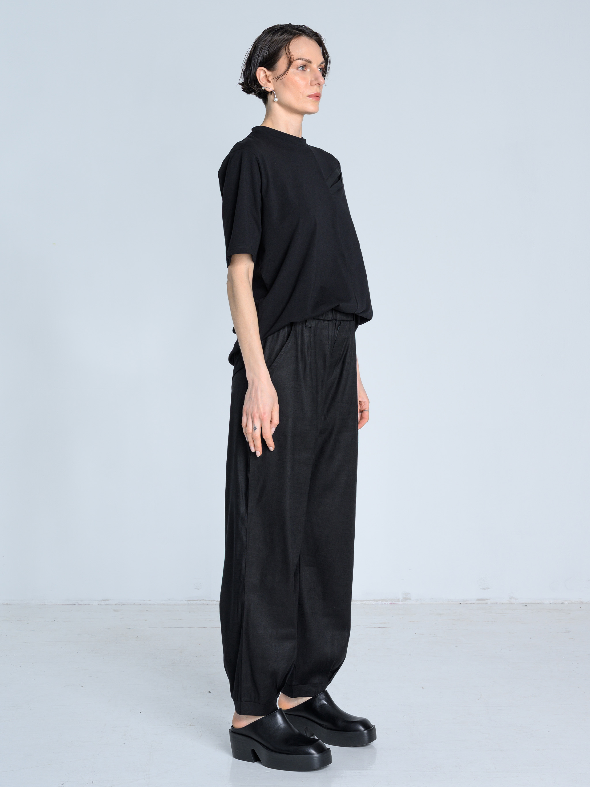 - Geometryczne cięcia na przodzie t-shirtu wydłużają linię sylwetki