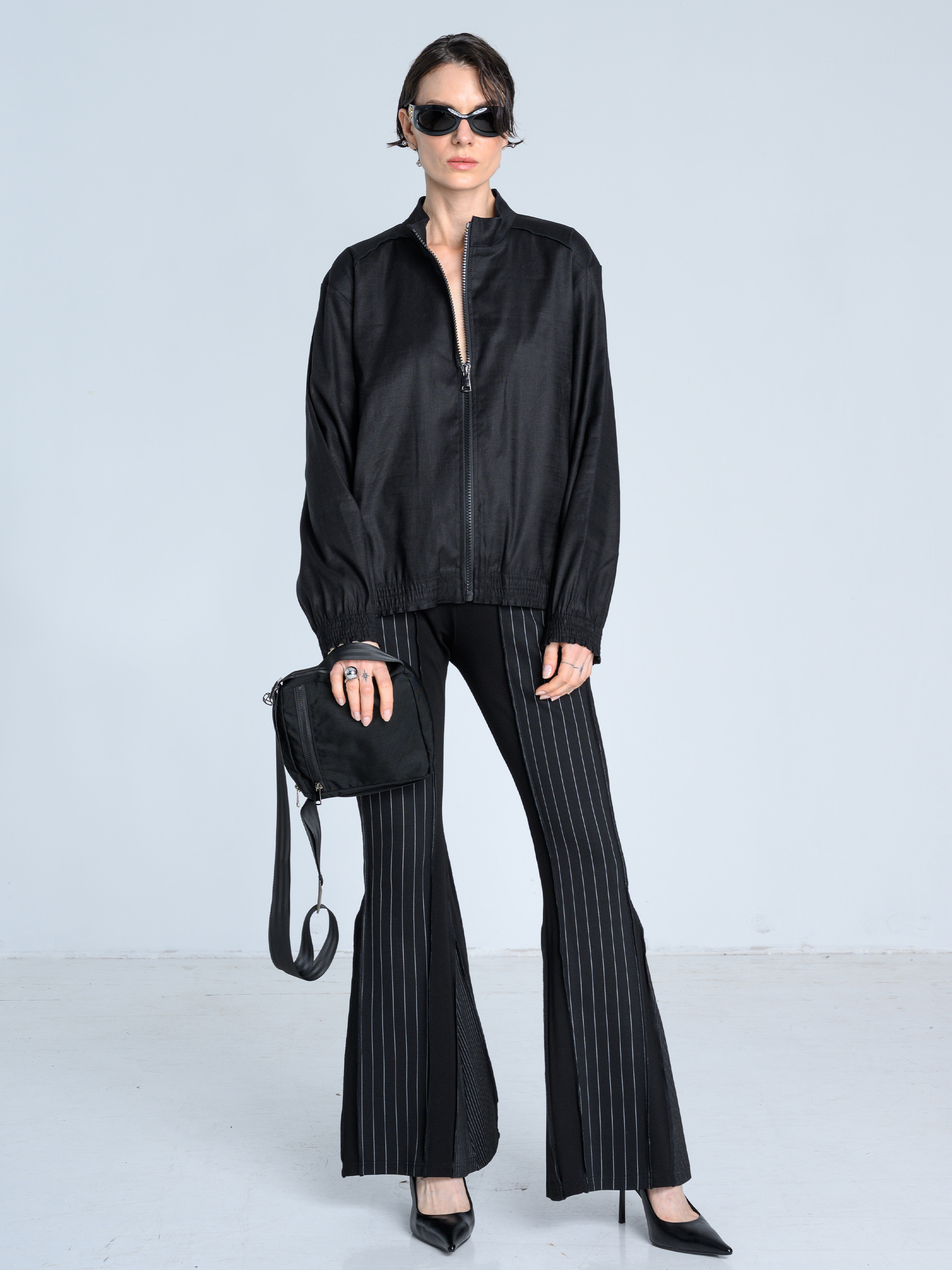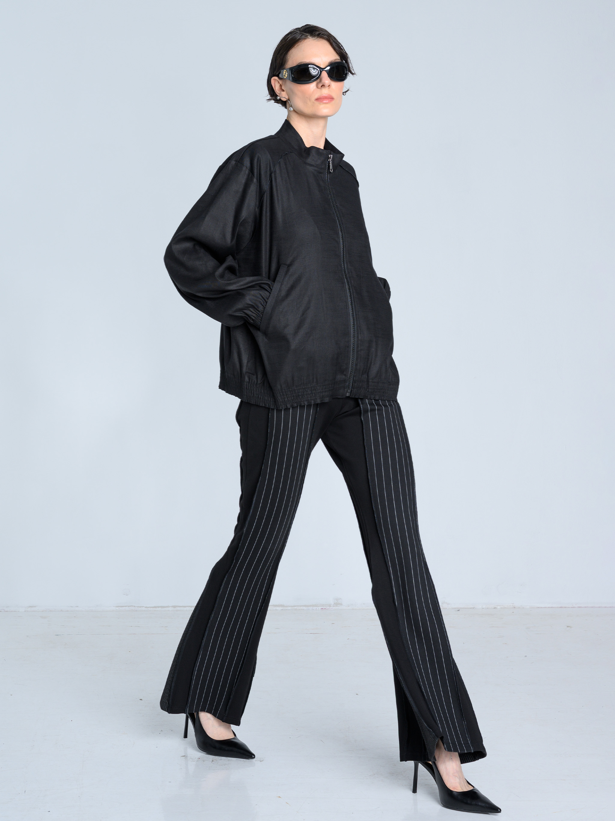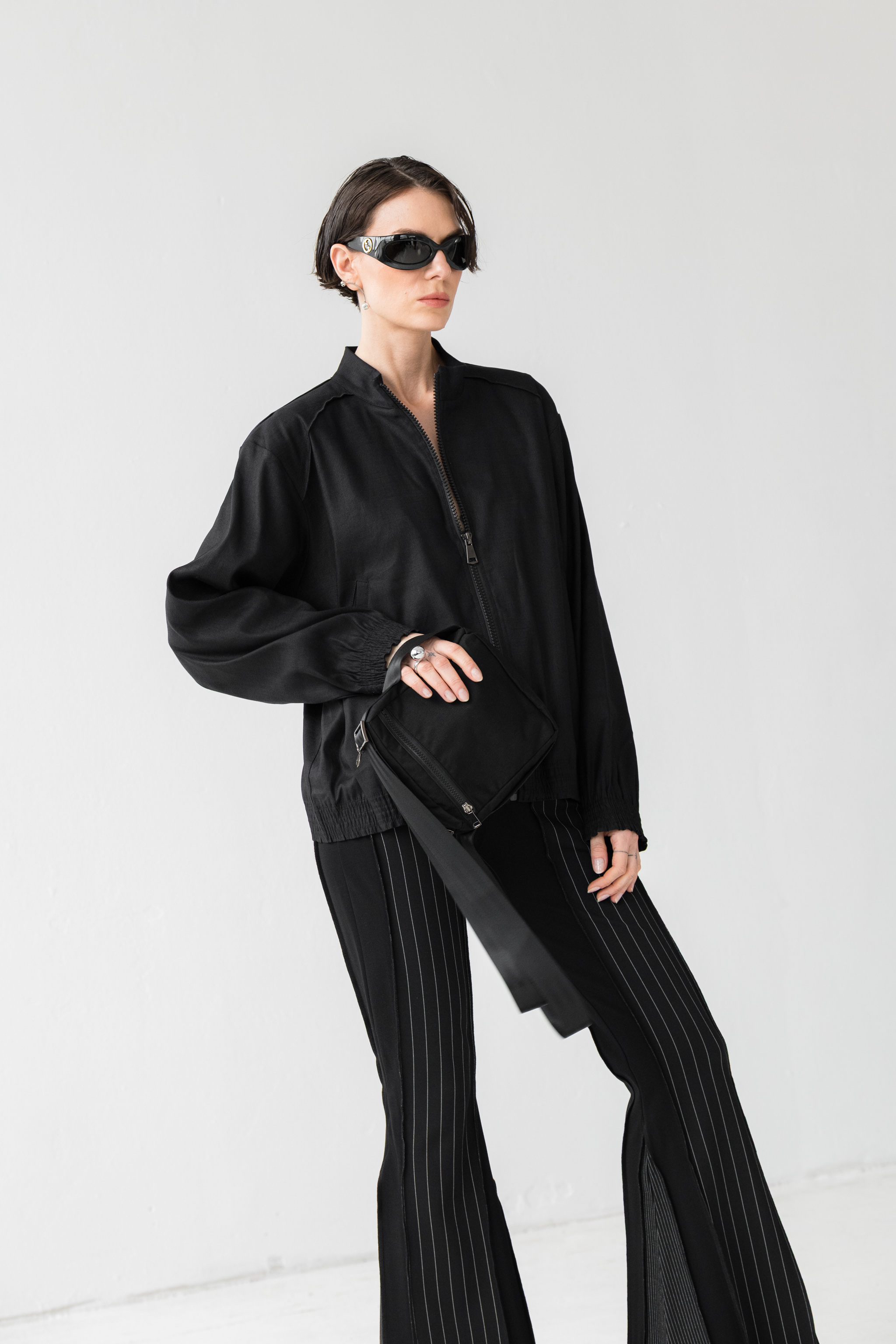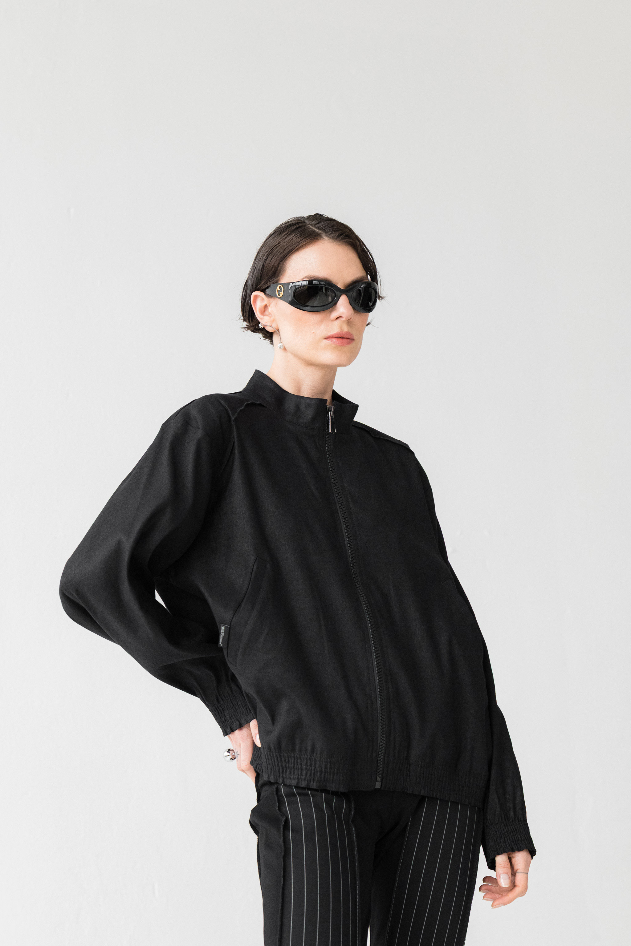 - Kurtka zapinana na masywny czarny zamek, rozświetlony zawieszką w kolorze ciemnego grafitu