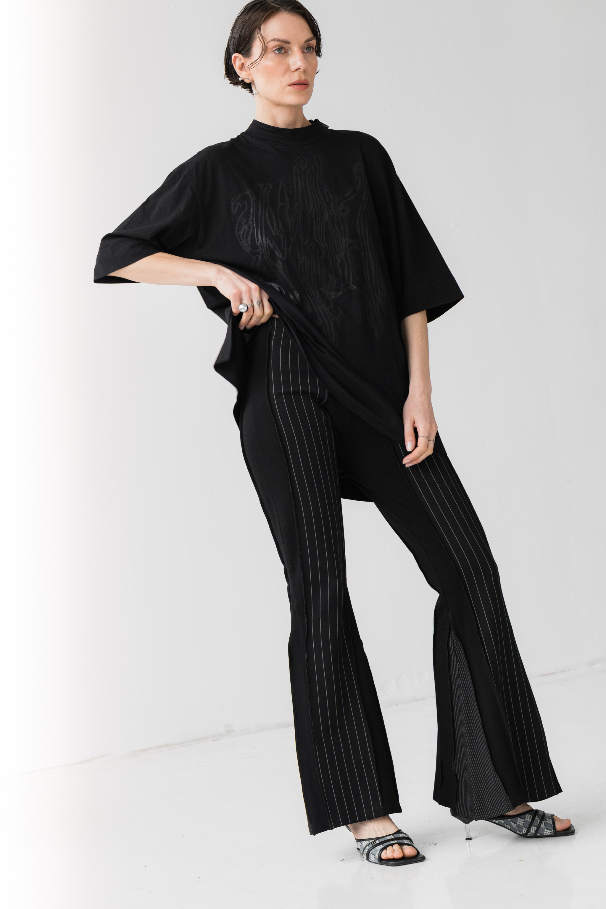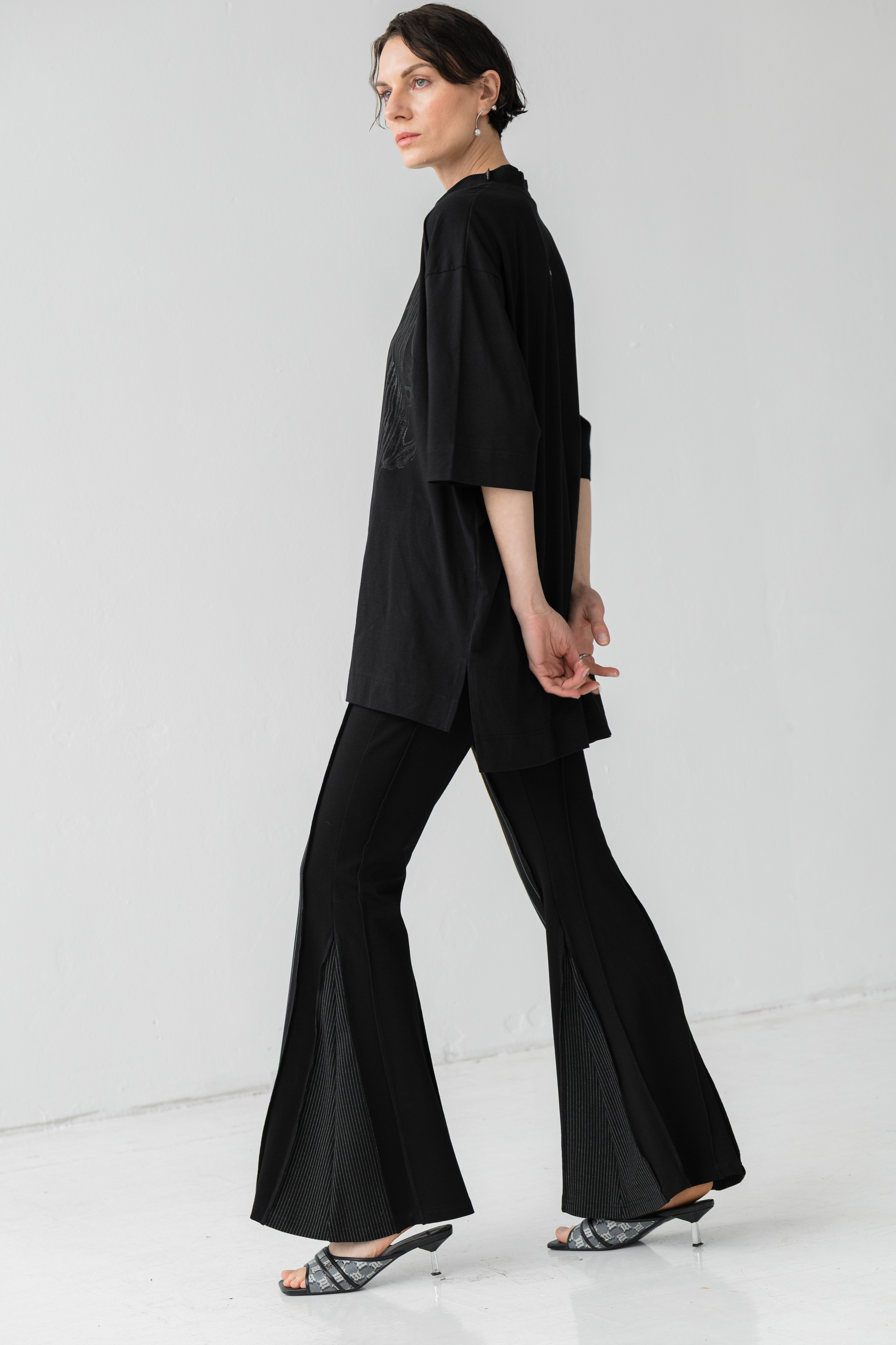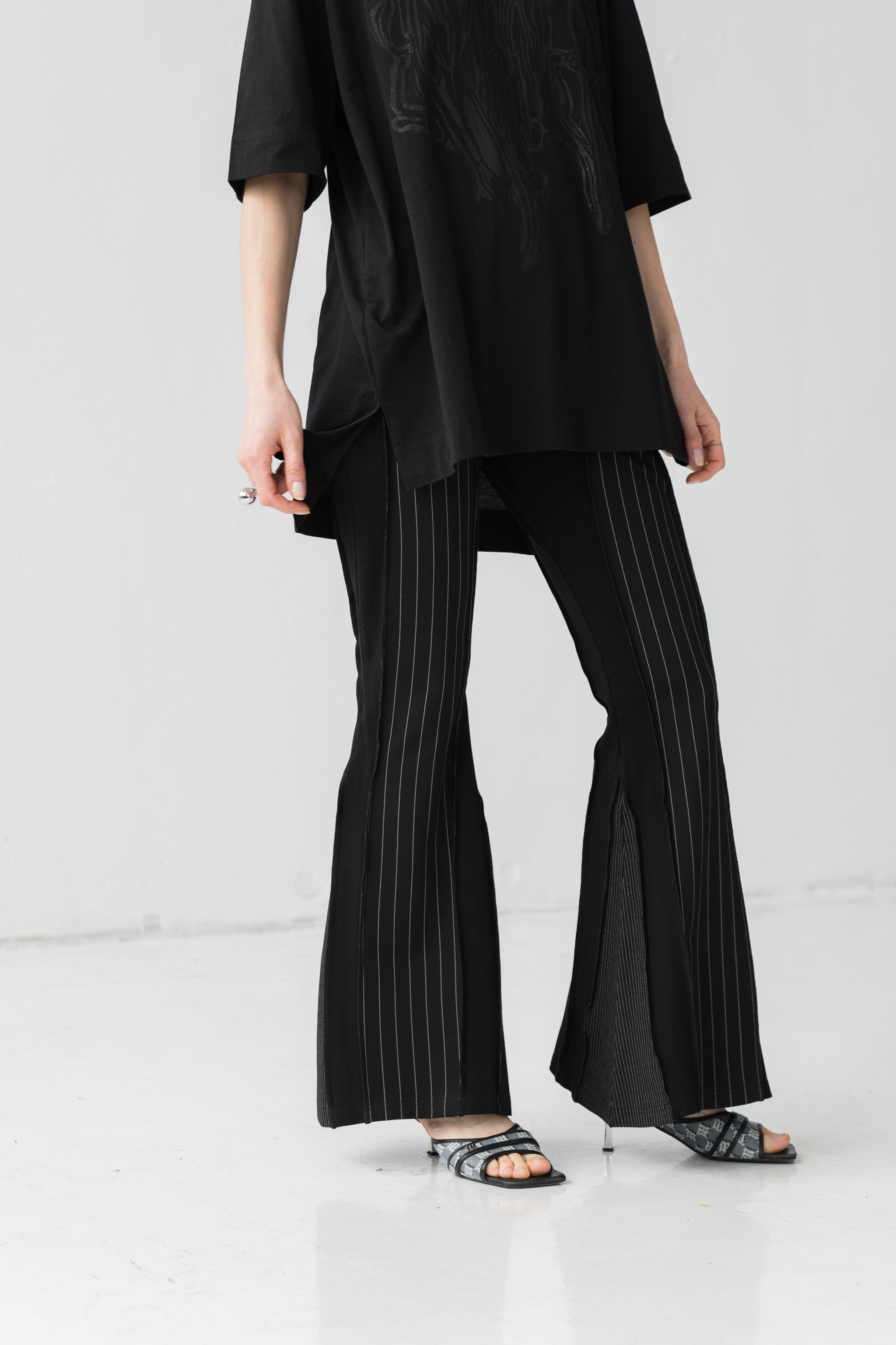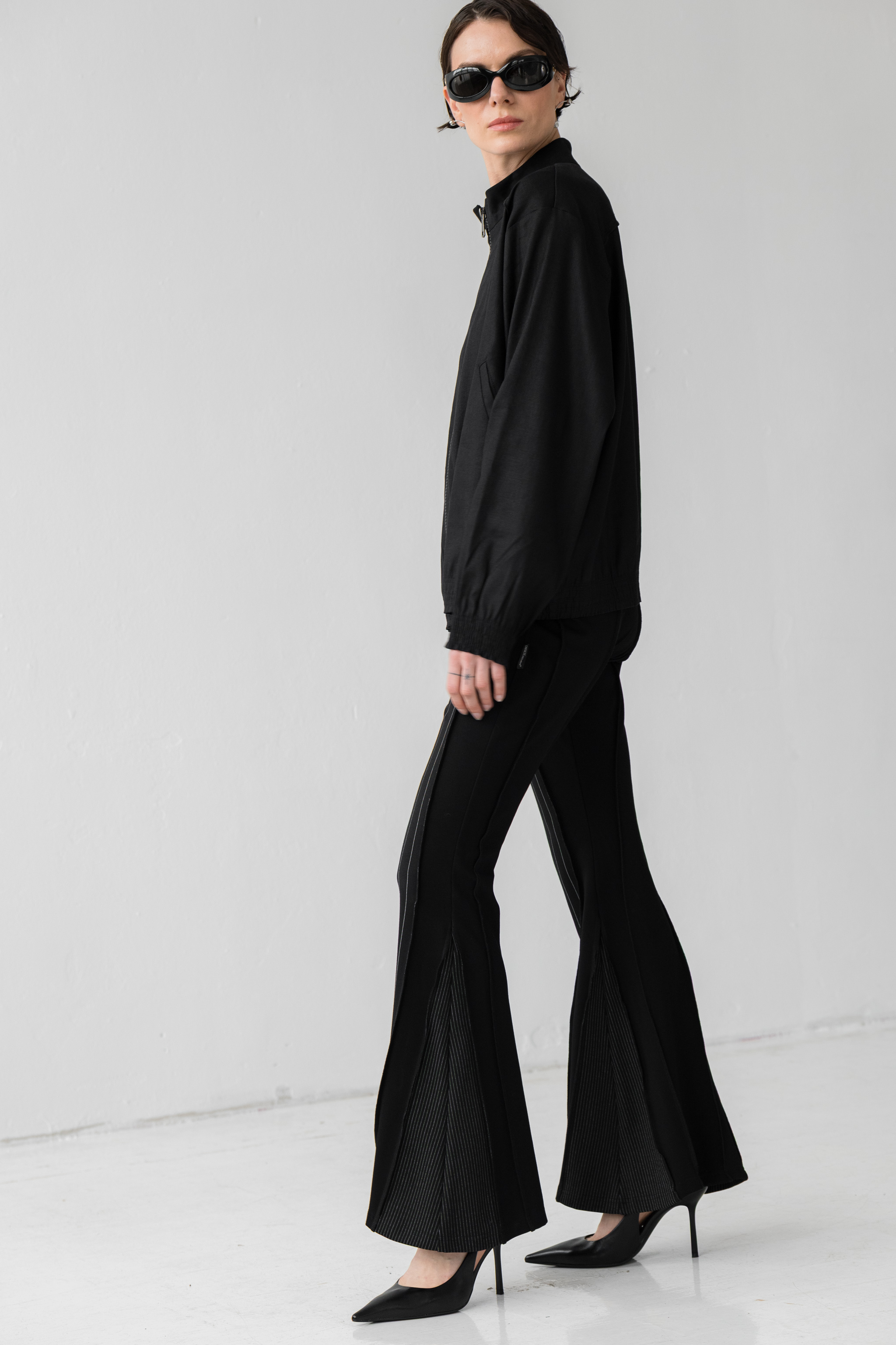 - Dopasowany fason z nogawką rozszerzającą się ku dołowi