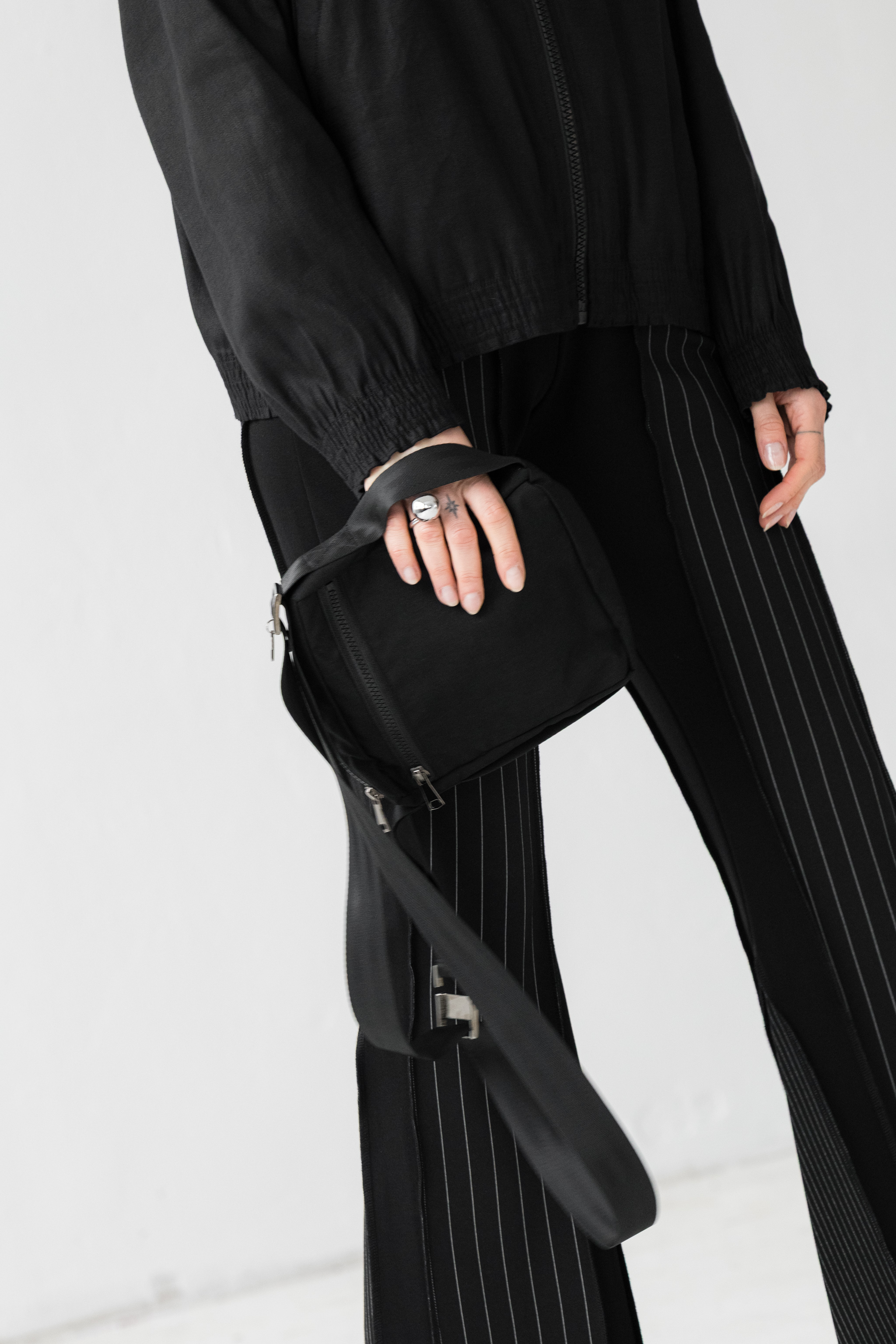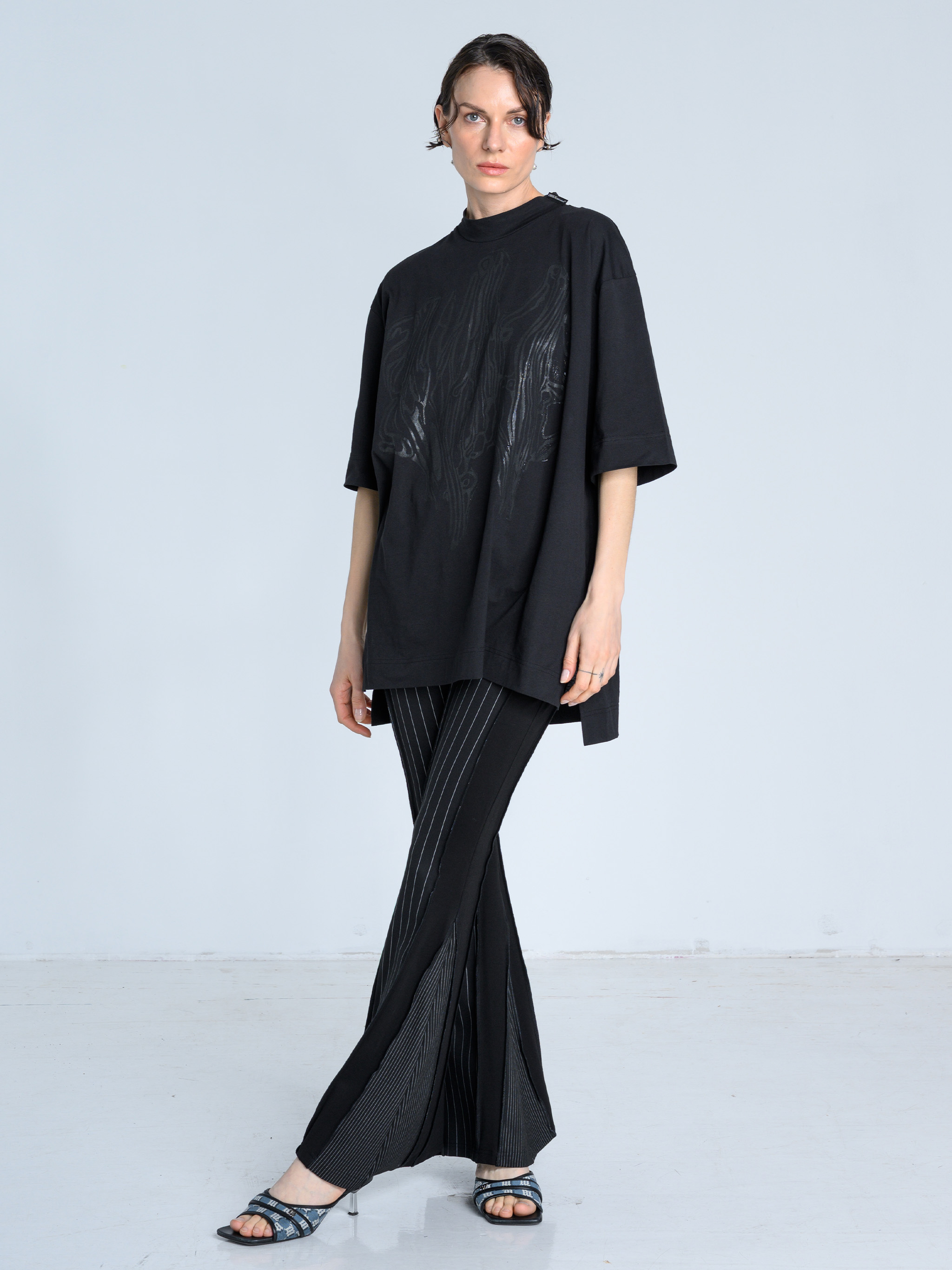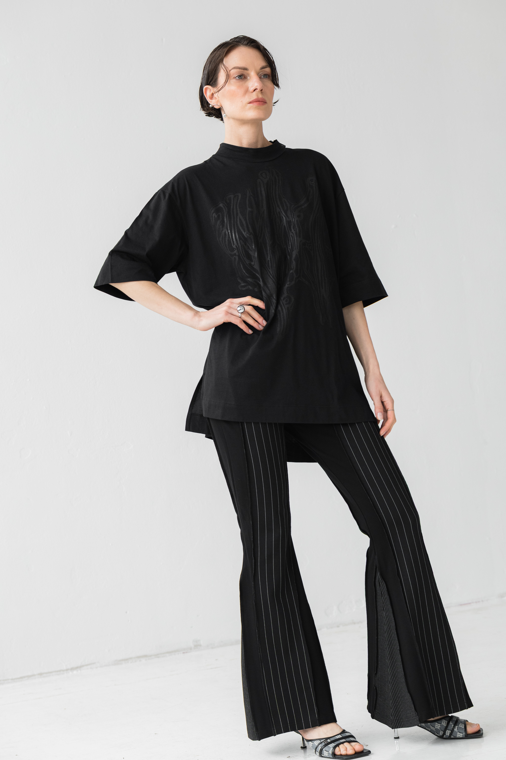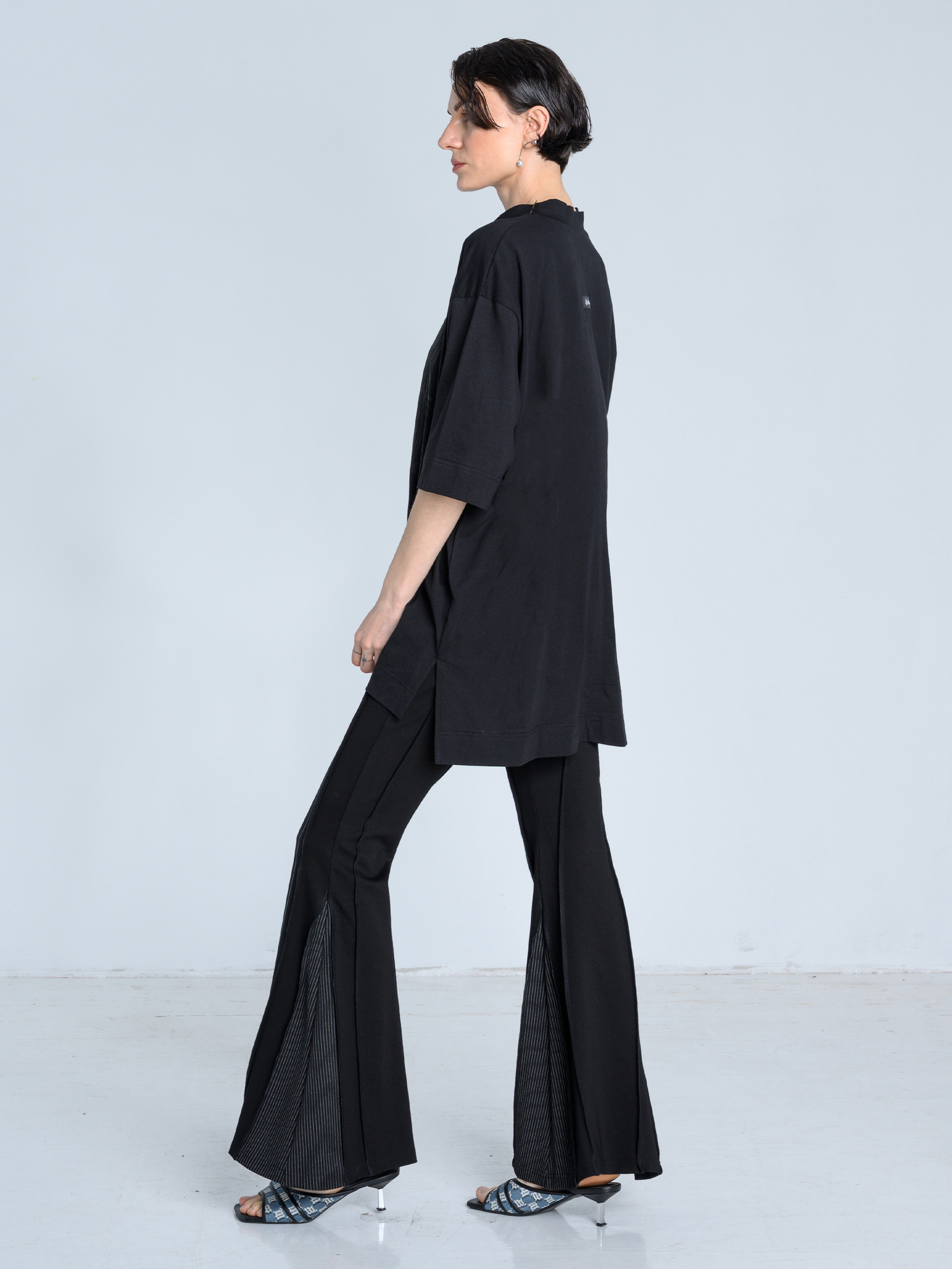 - Dopasowany fason z nogawką rozszerzającą się ku dołowi