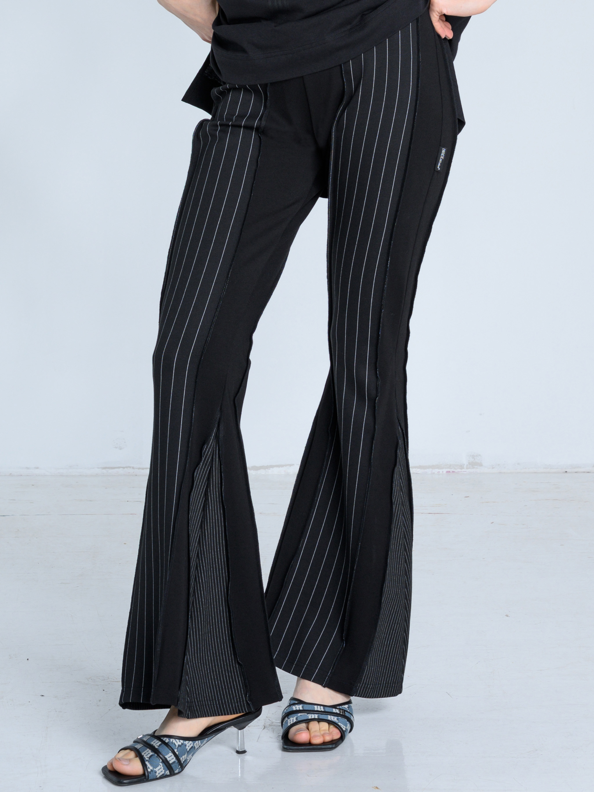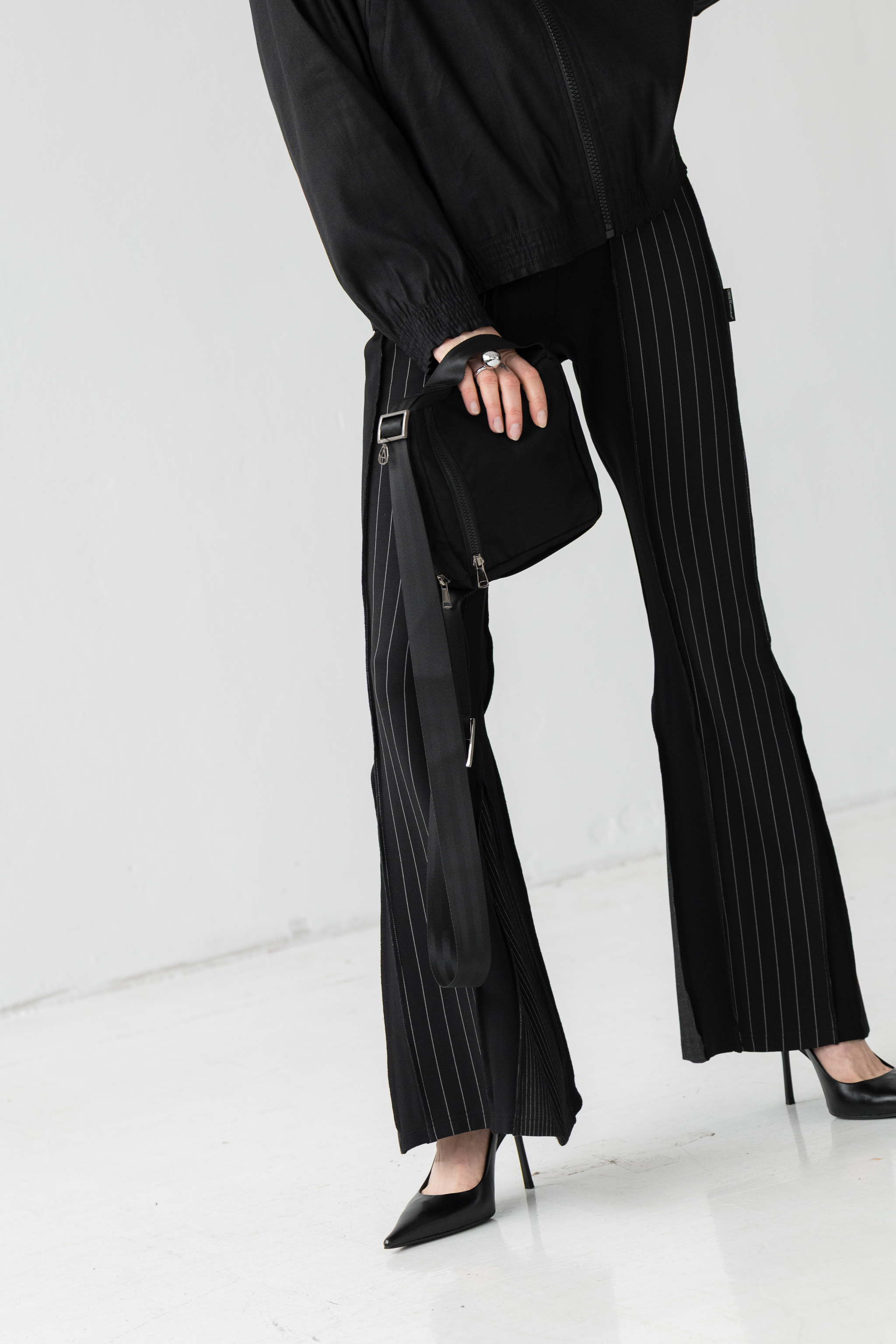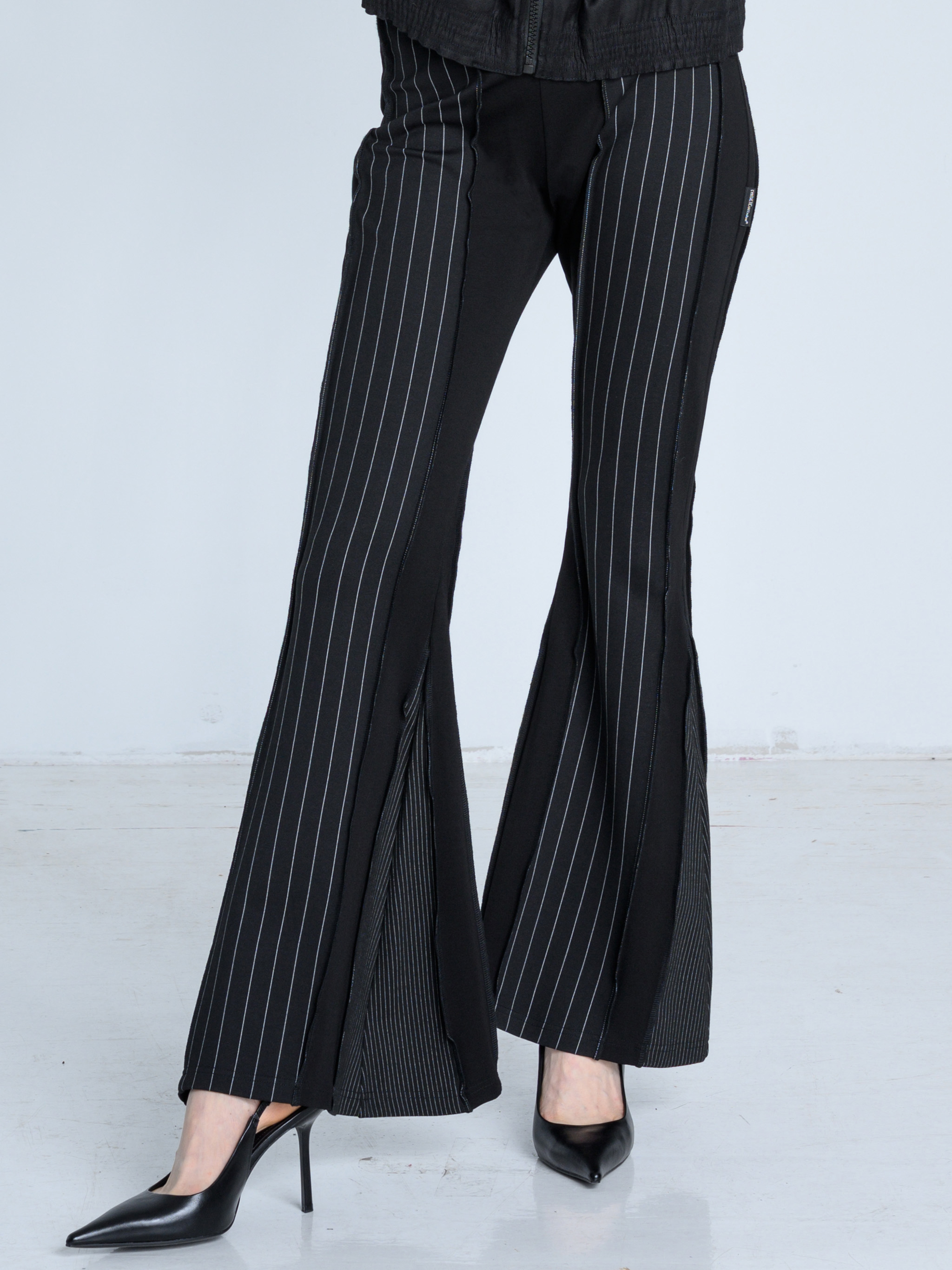 - Z przodu nogawki wstawka w pionowe szerokie pasy, po bokach nogawki w drobniejszy prążek