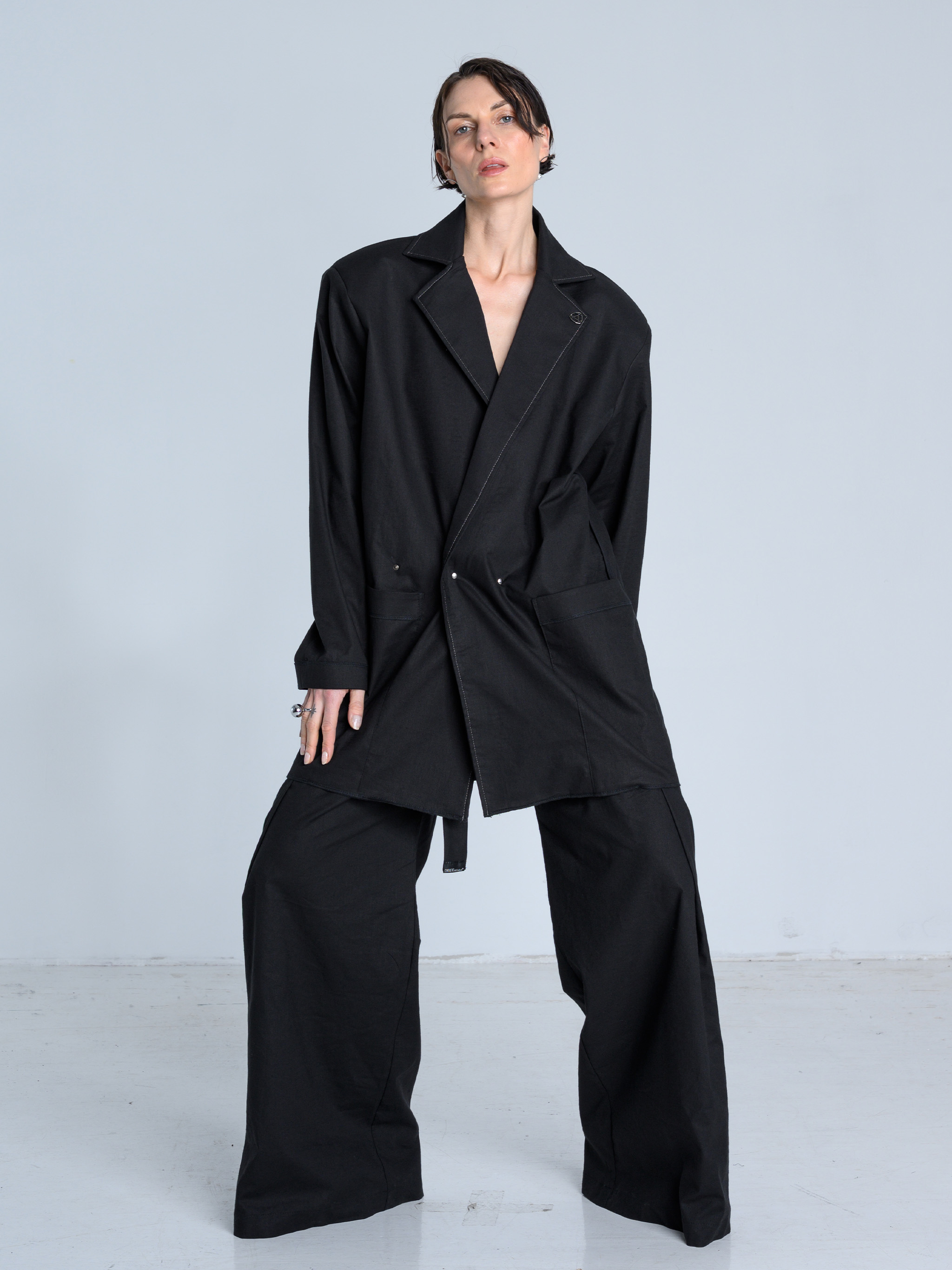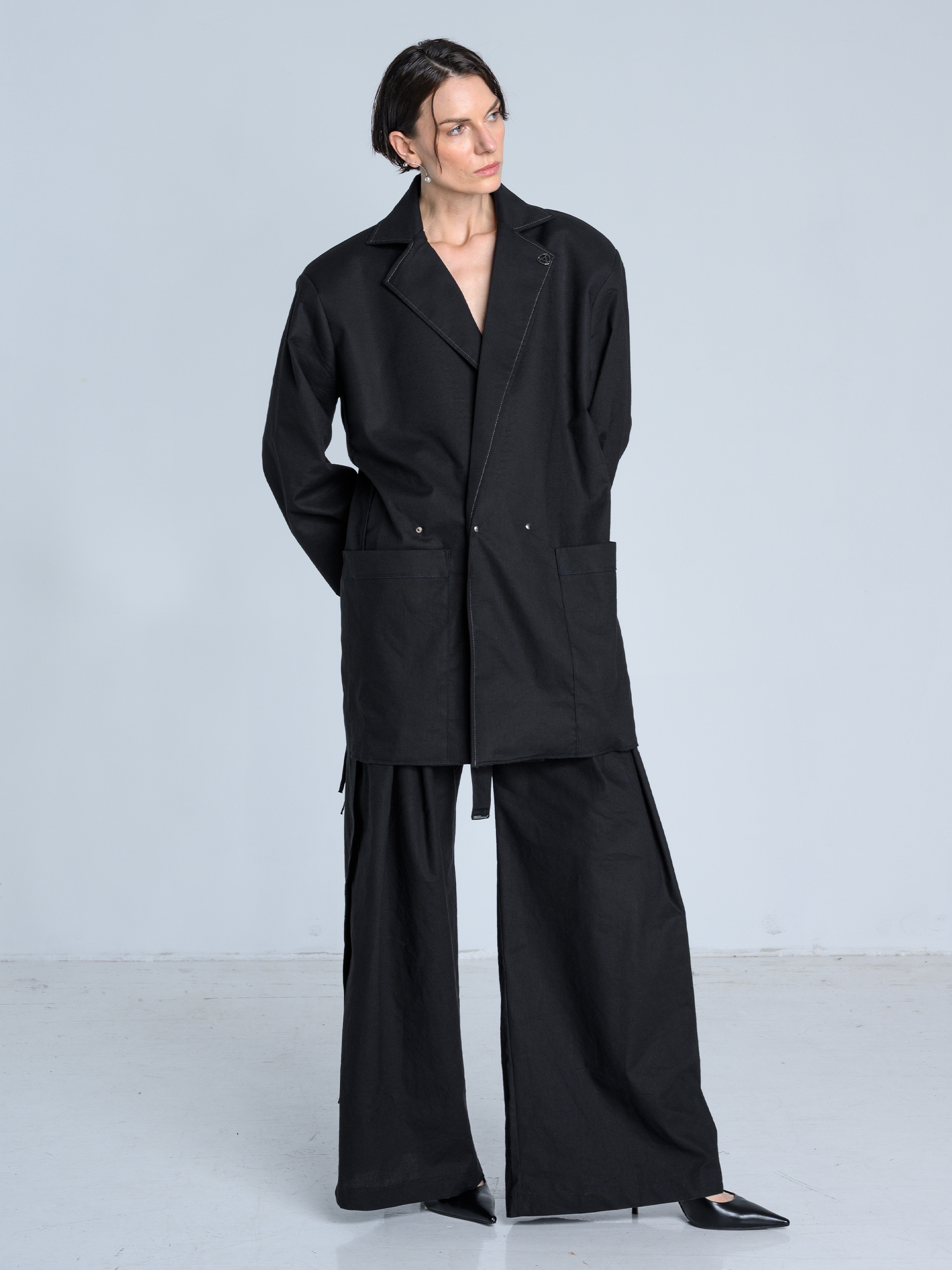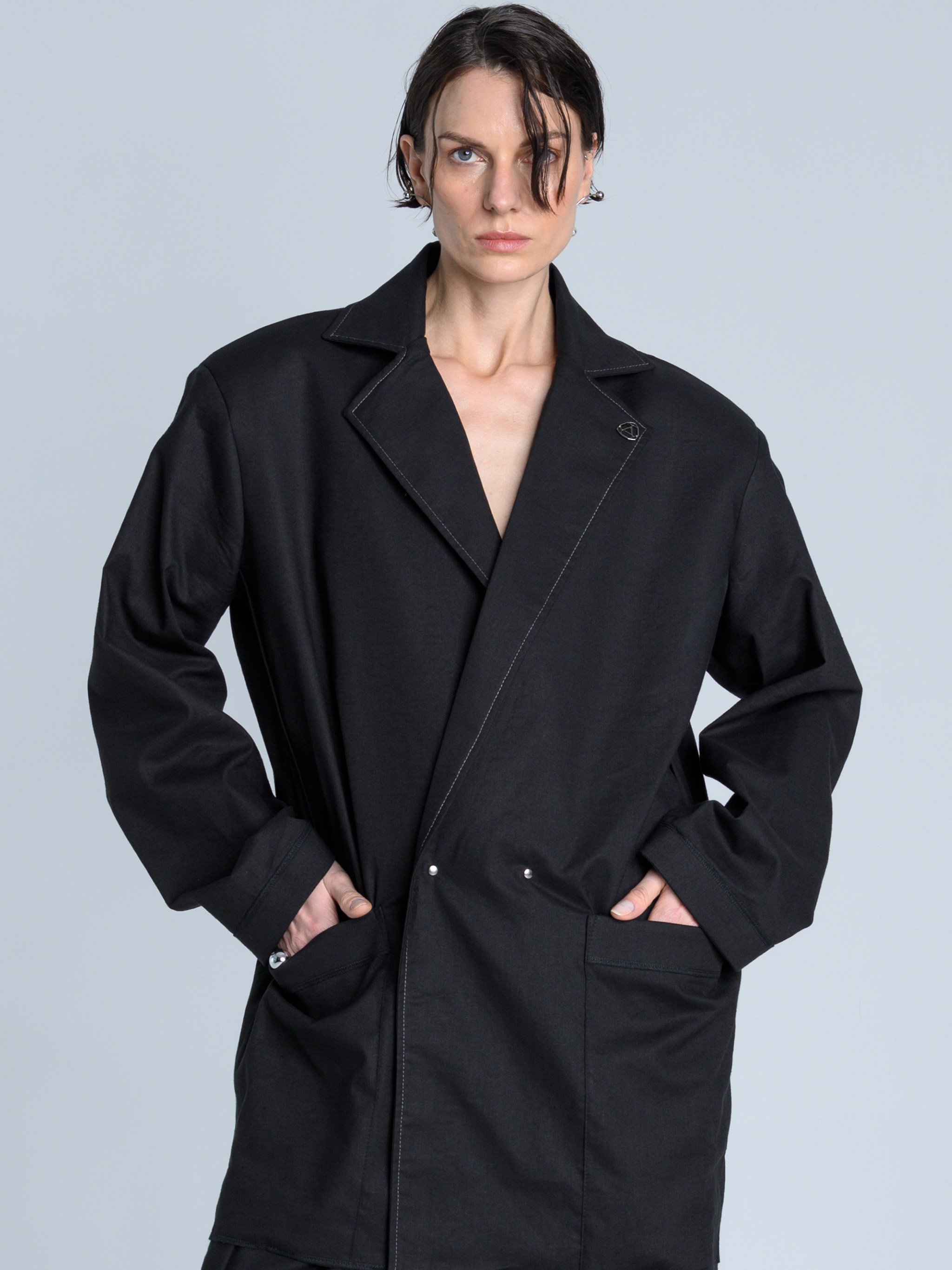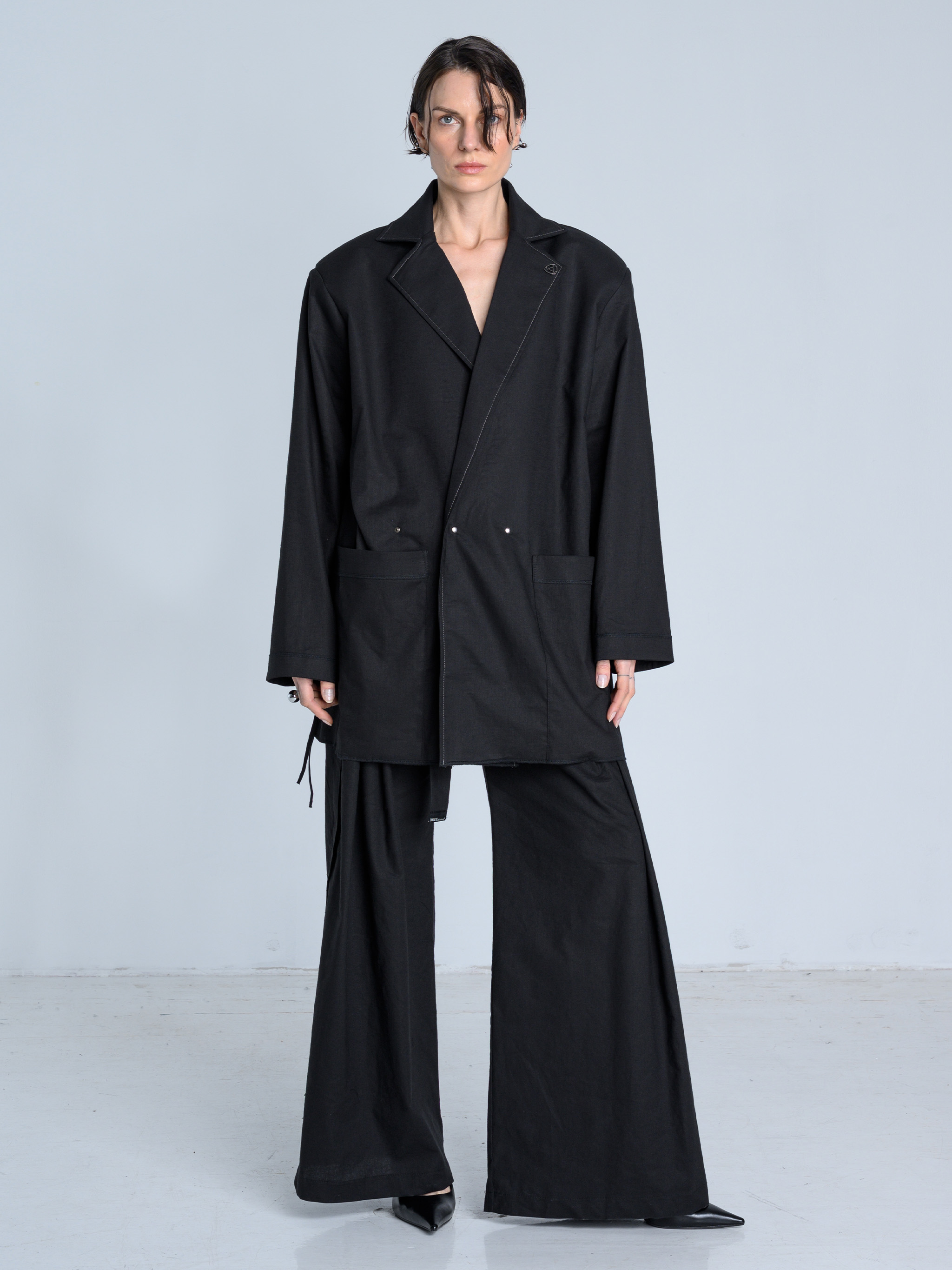 - Połączenie bryły i lekkości - tkanina wzmocniona na linii ramion specjalnym wkładem sprawia, że marynarka zachowuje swój pudełkowy fason, natomiast dół i rękawy marynarki są lejące