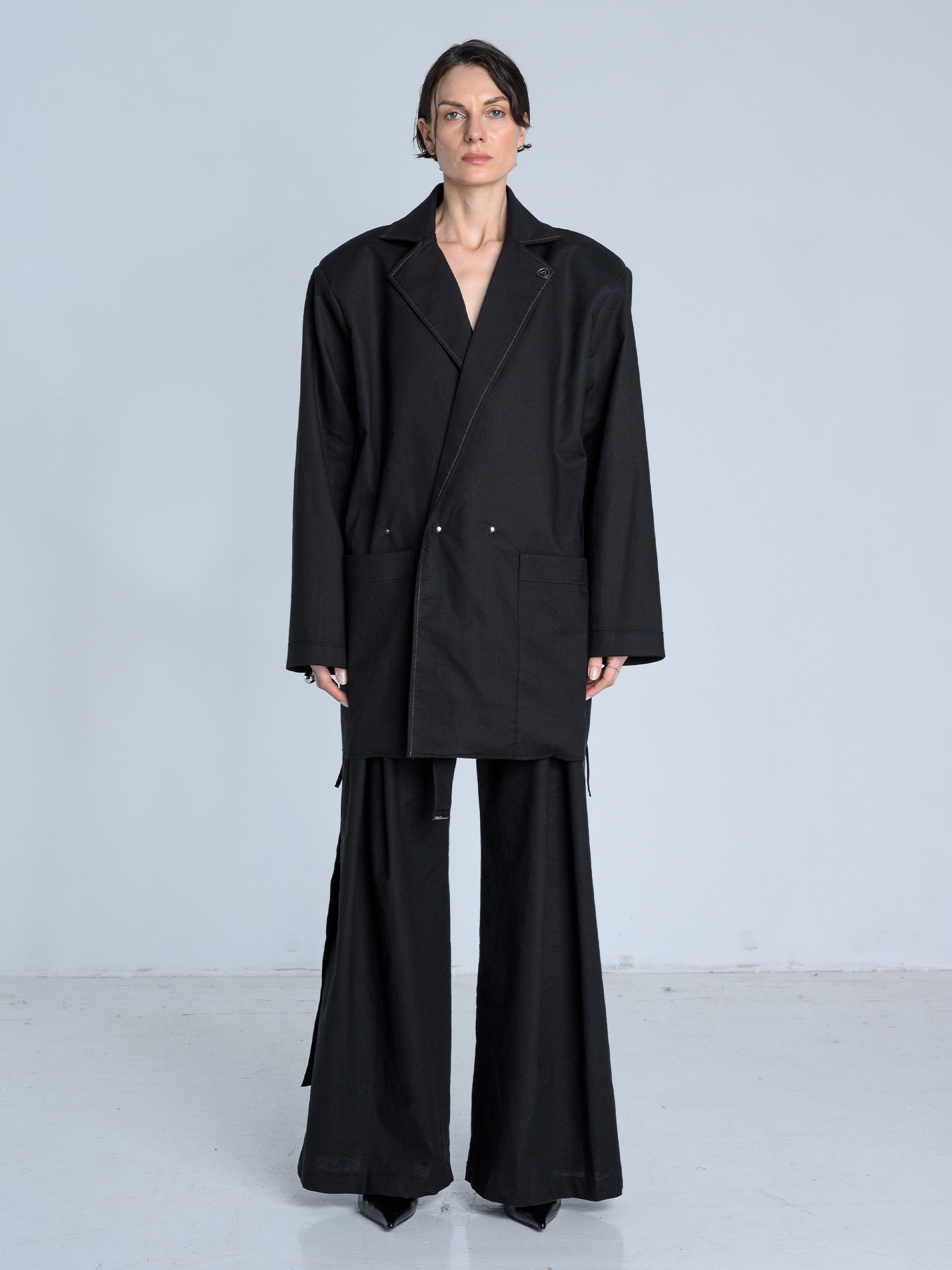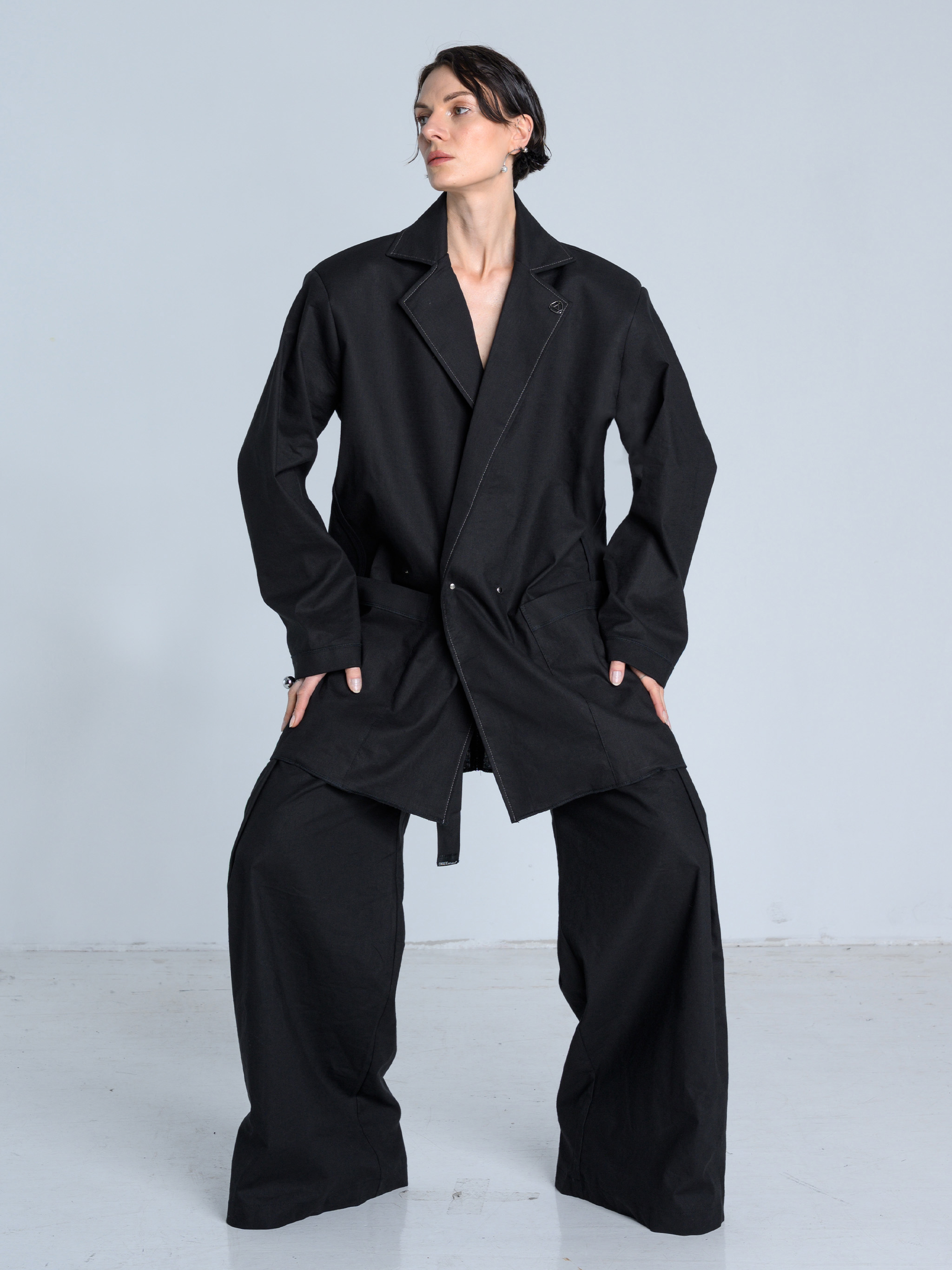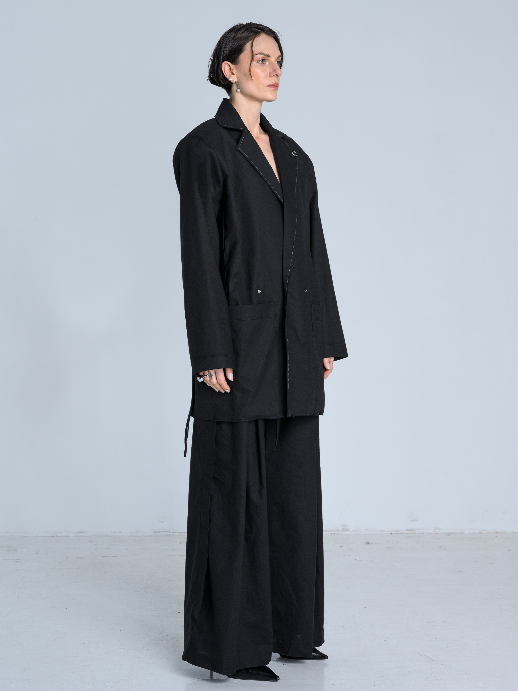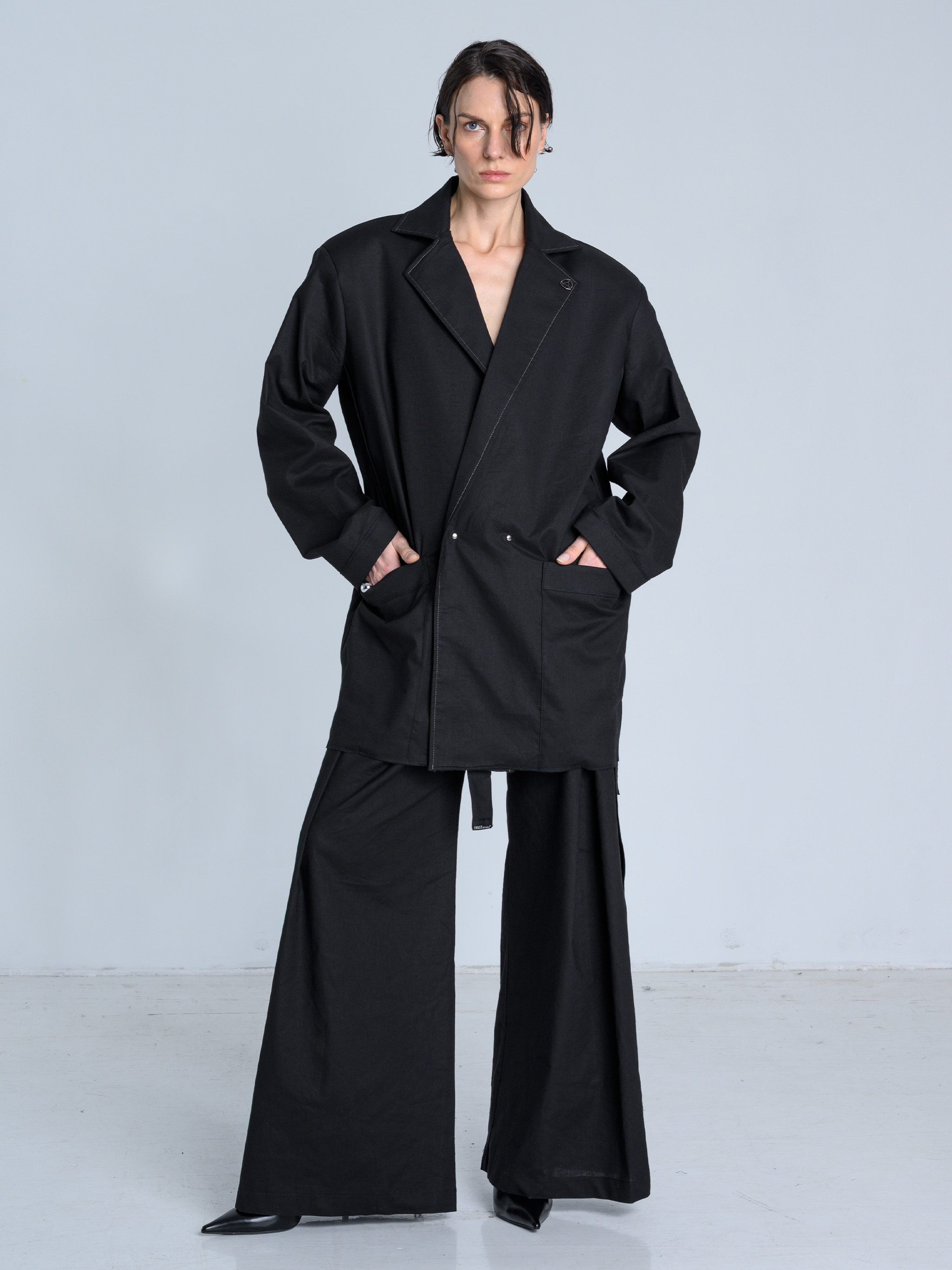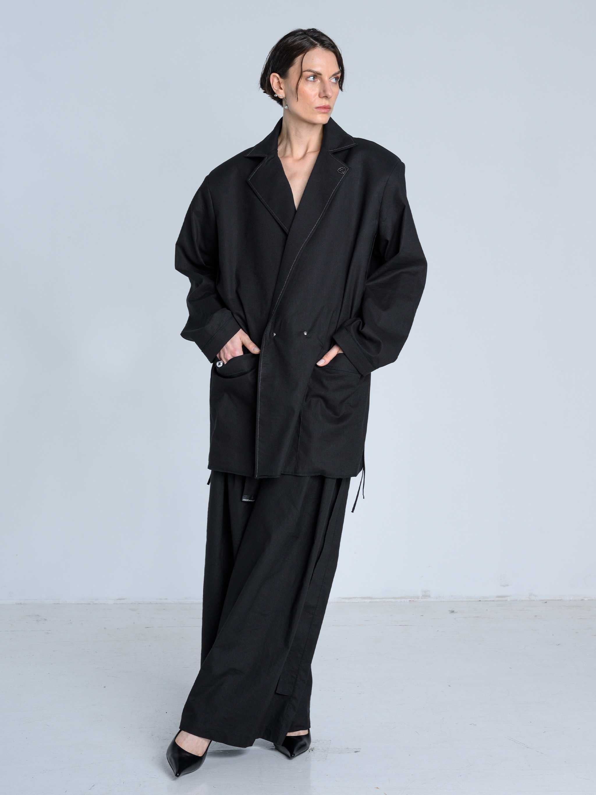 - Połączenie bryły i lekkości - tkanina wzmocniona na linii ramion specjalnym wkładem sprawia, że marynarka zachowuje swój pudełkowy fason, natomiast dół i rękawy marynarki są lejące