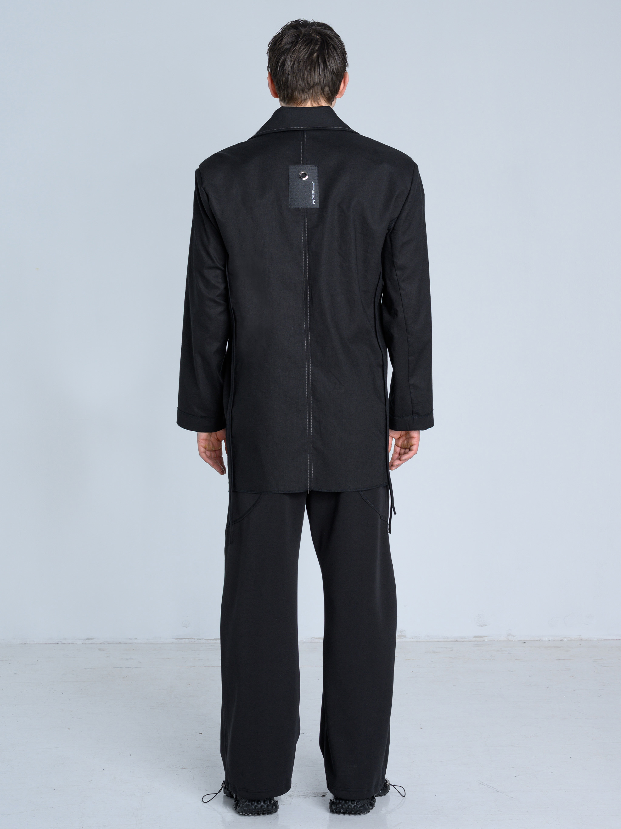 - Z tyłu marynarki pionowe cięcie z ozdobnym kontrastowym stebnowaniem w kolorze szarym