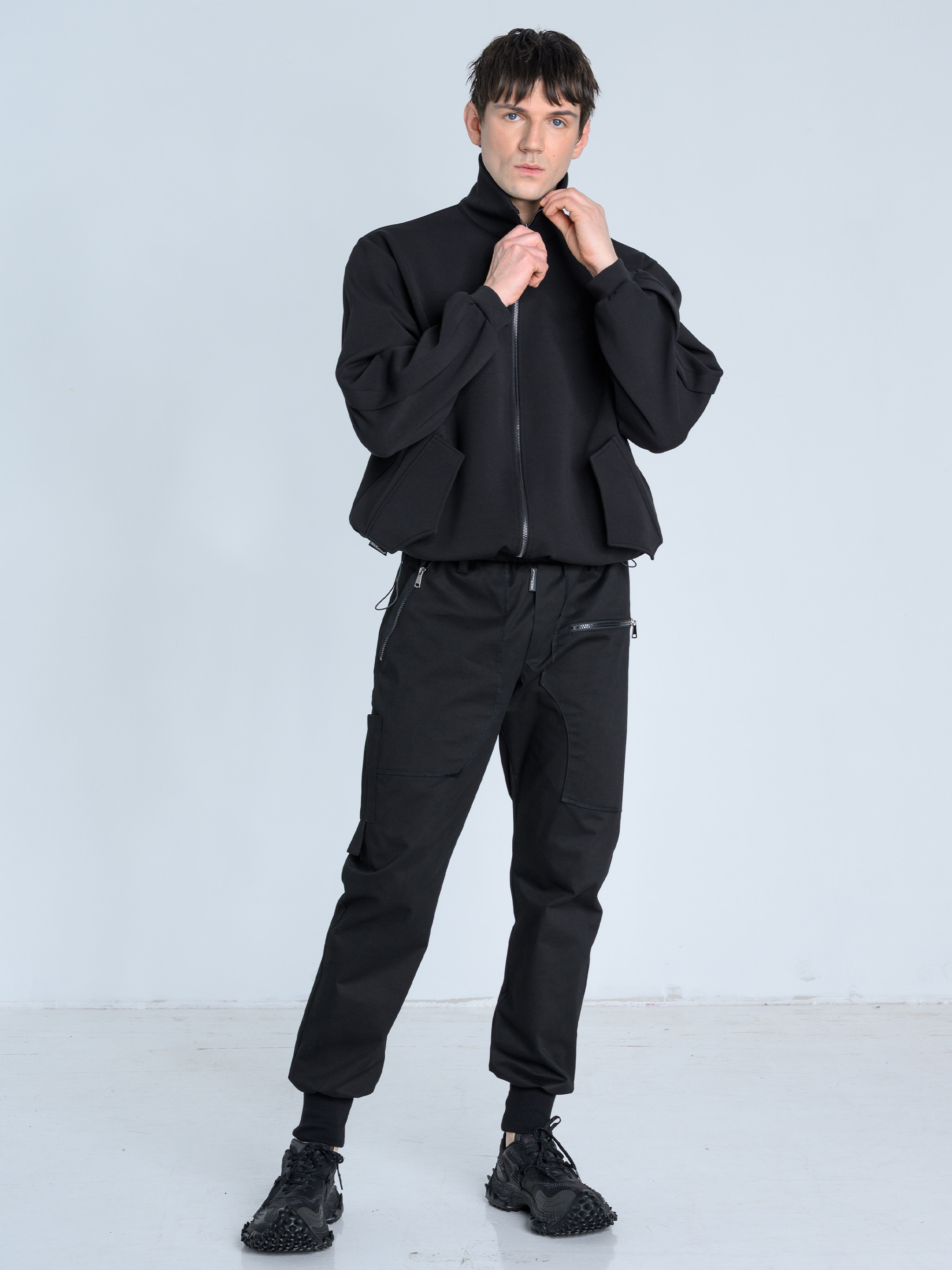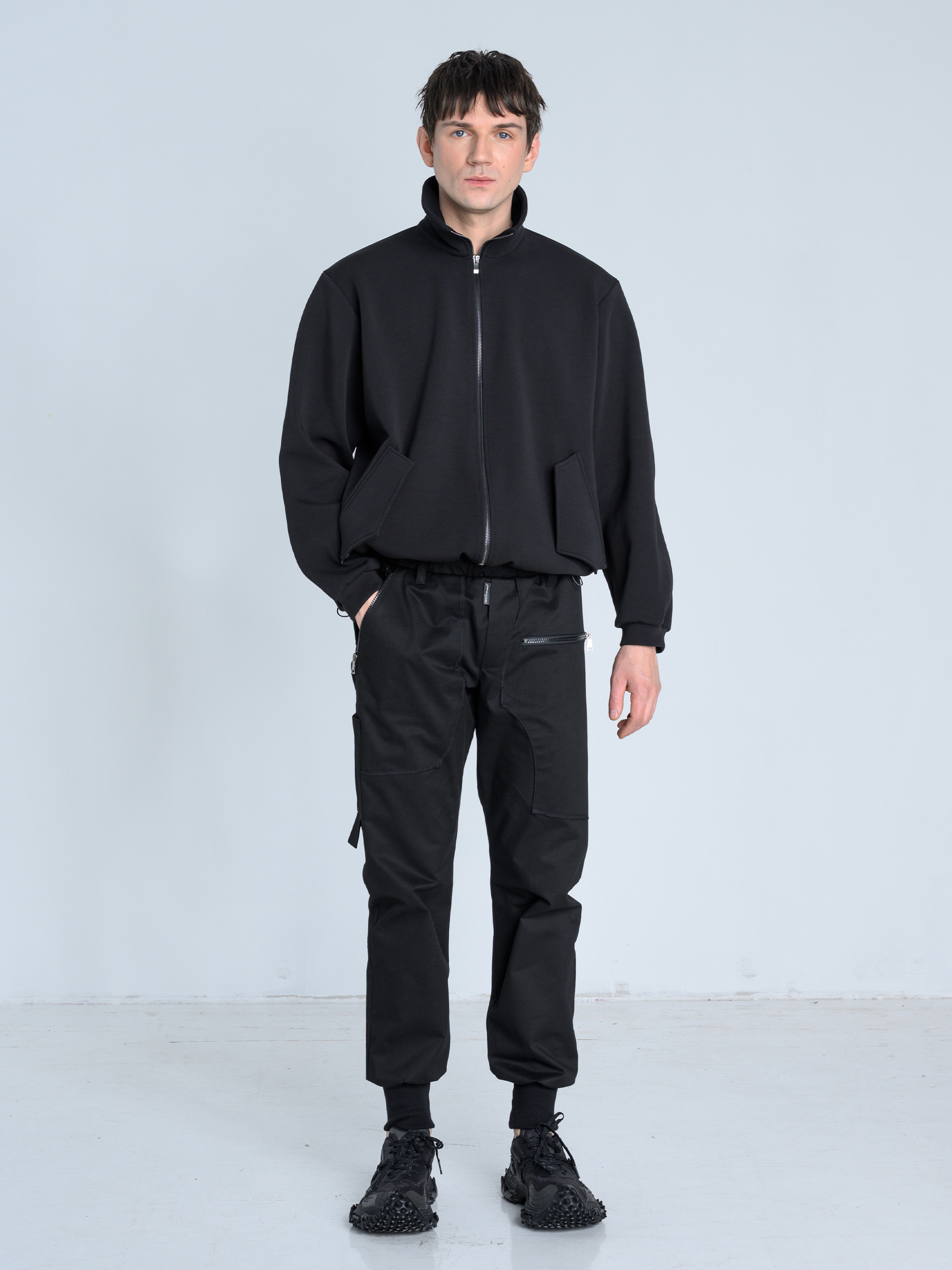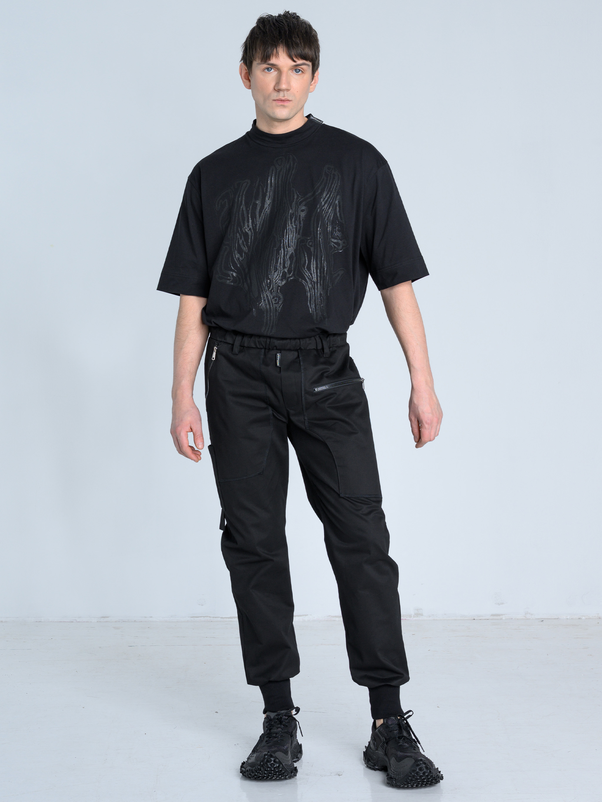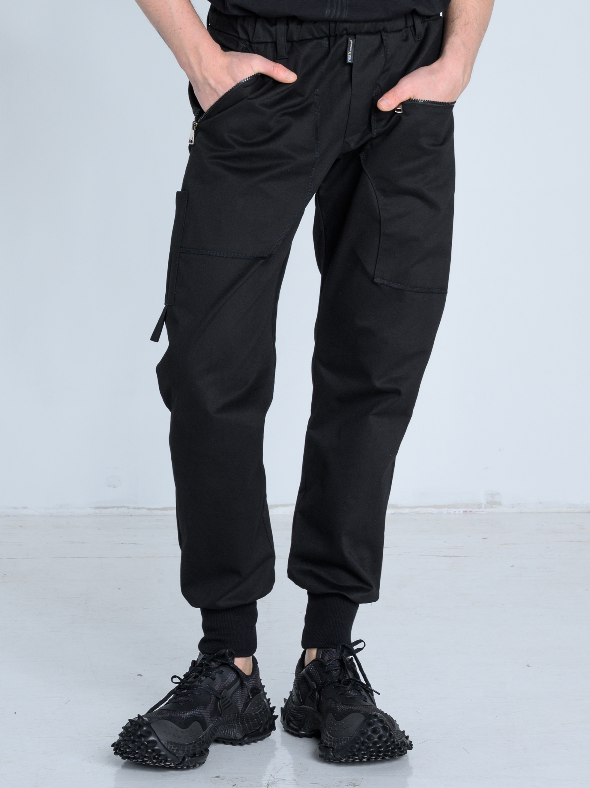 - Dół nogawek zakończony wysokim elastycznym ściągaczem