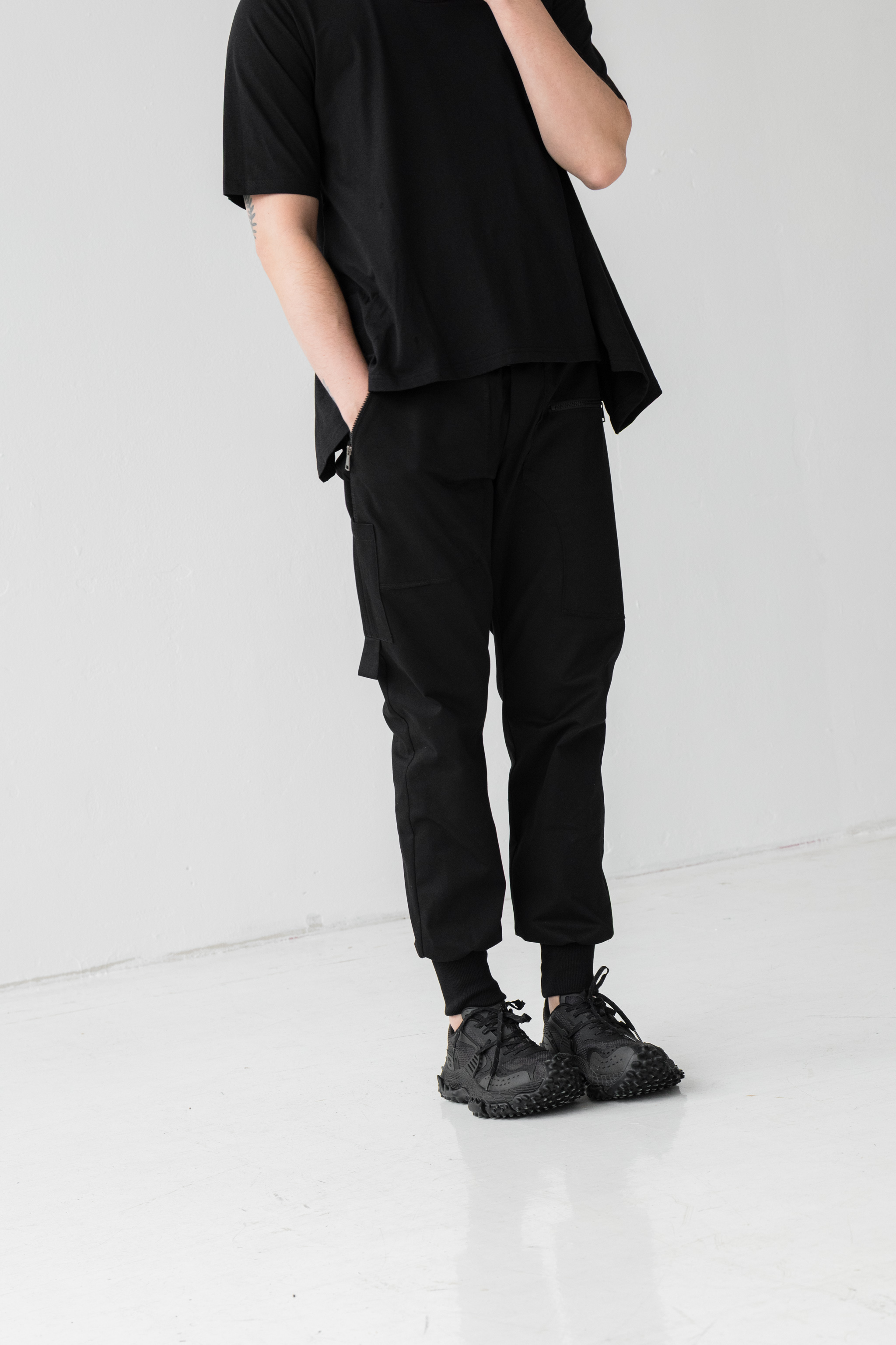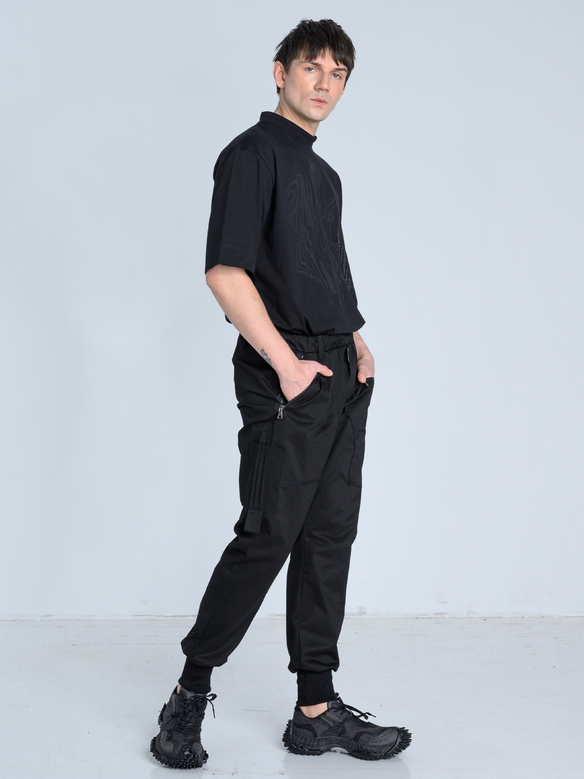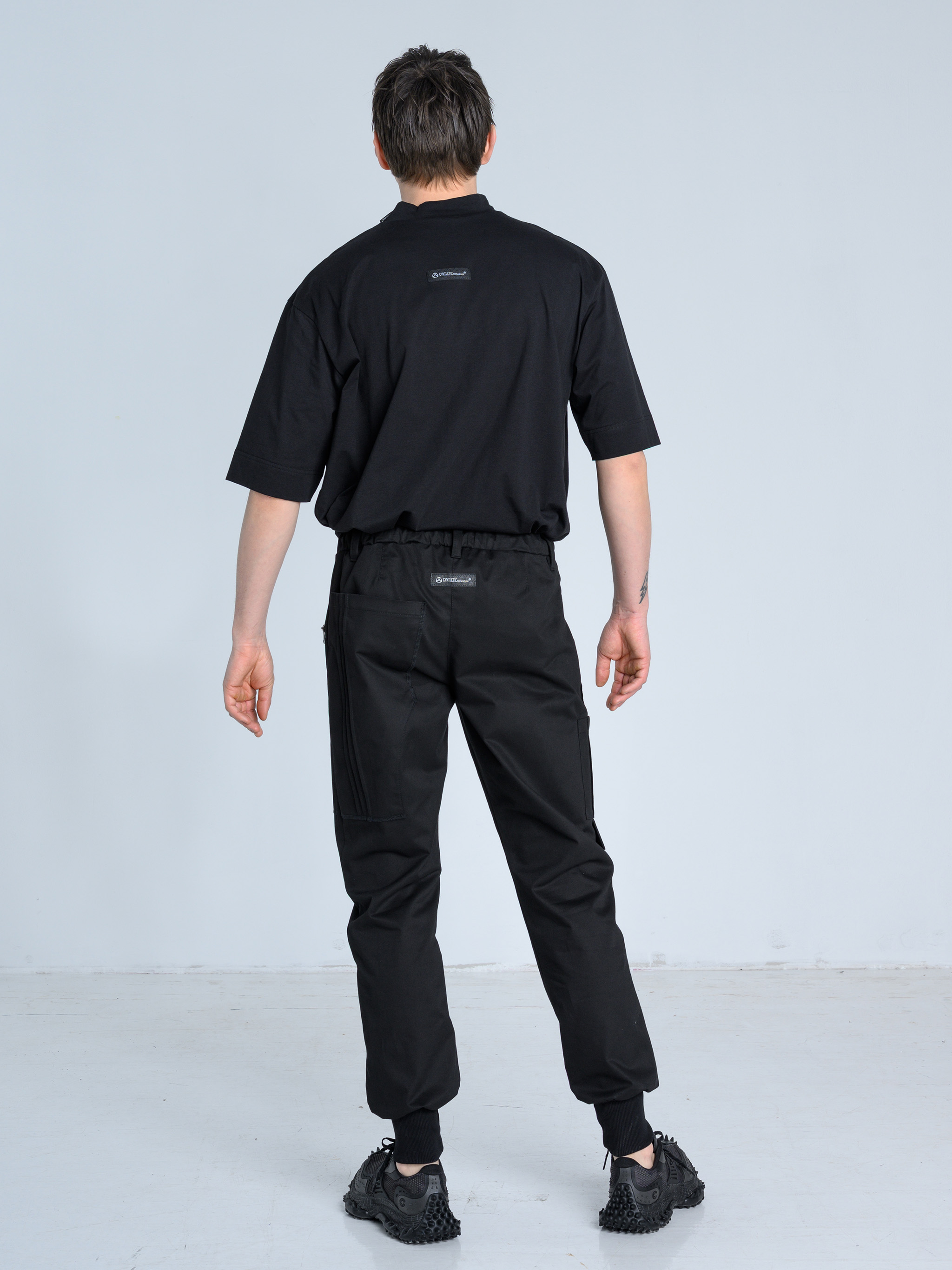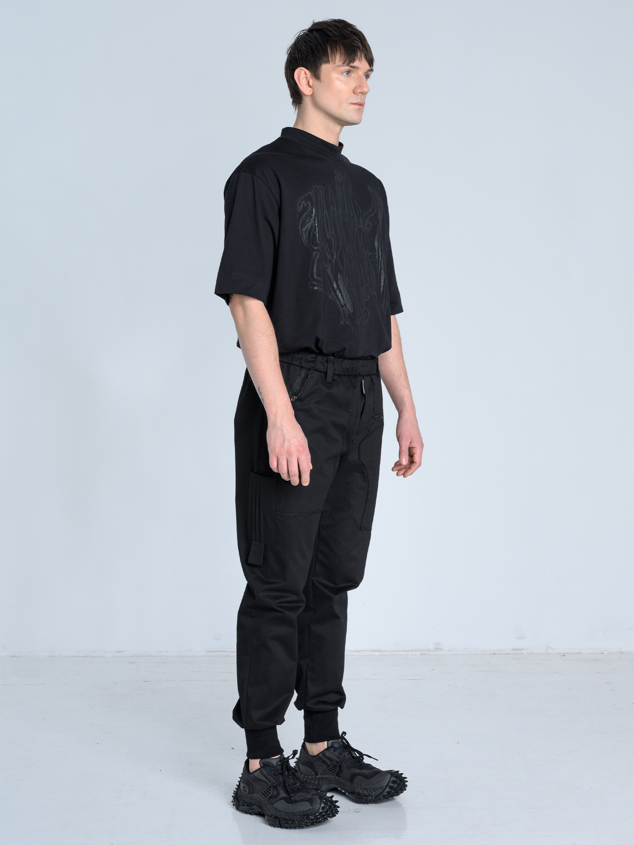 - Dół nogawek zakończony wysokim elastycznym ściągaczem