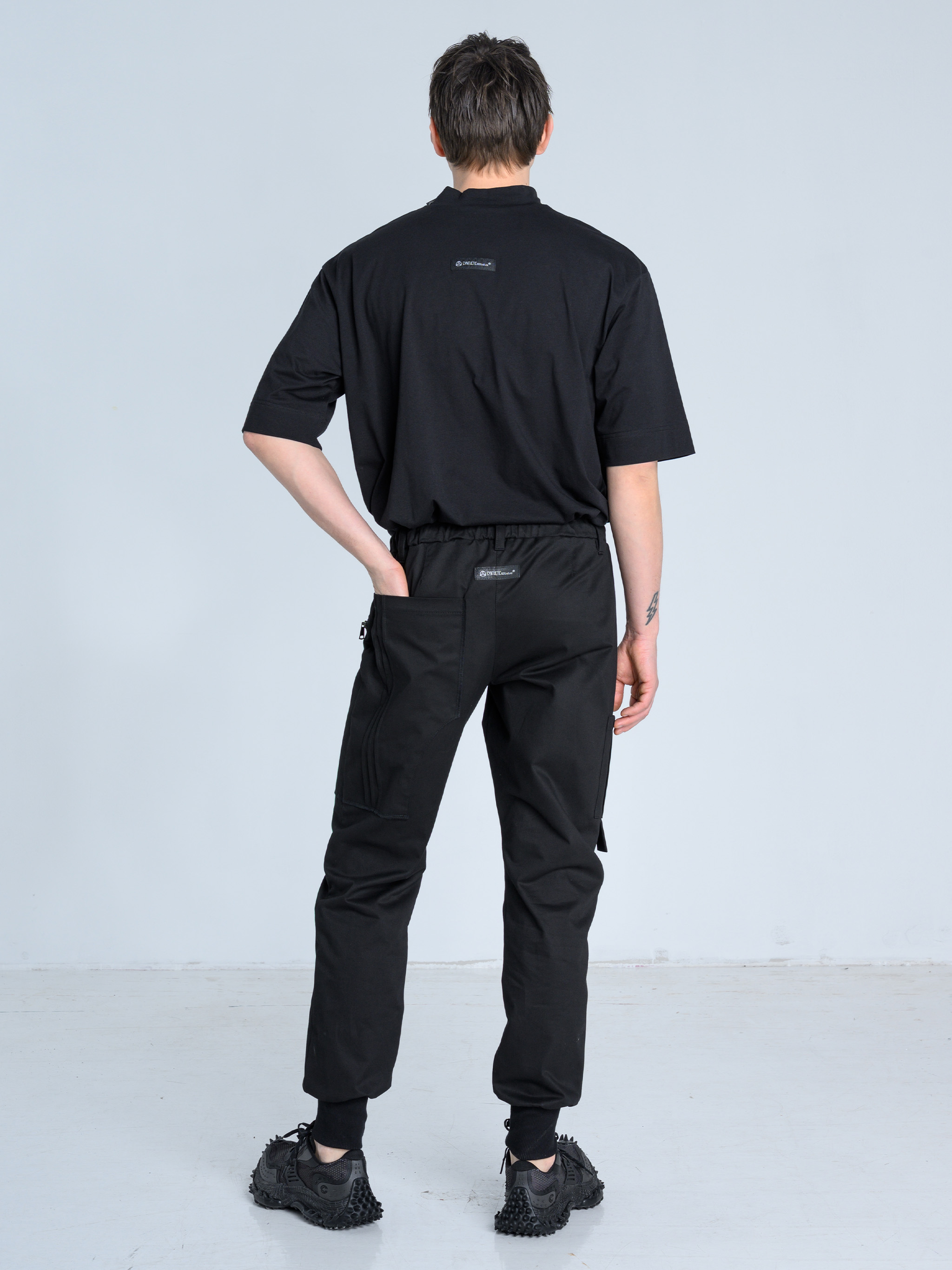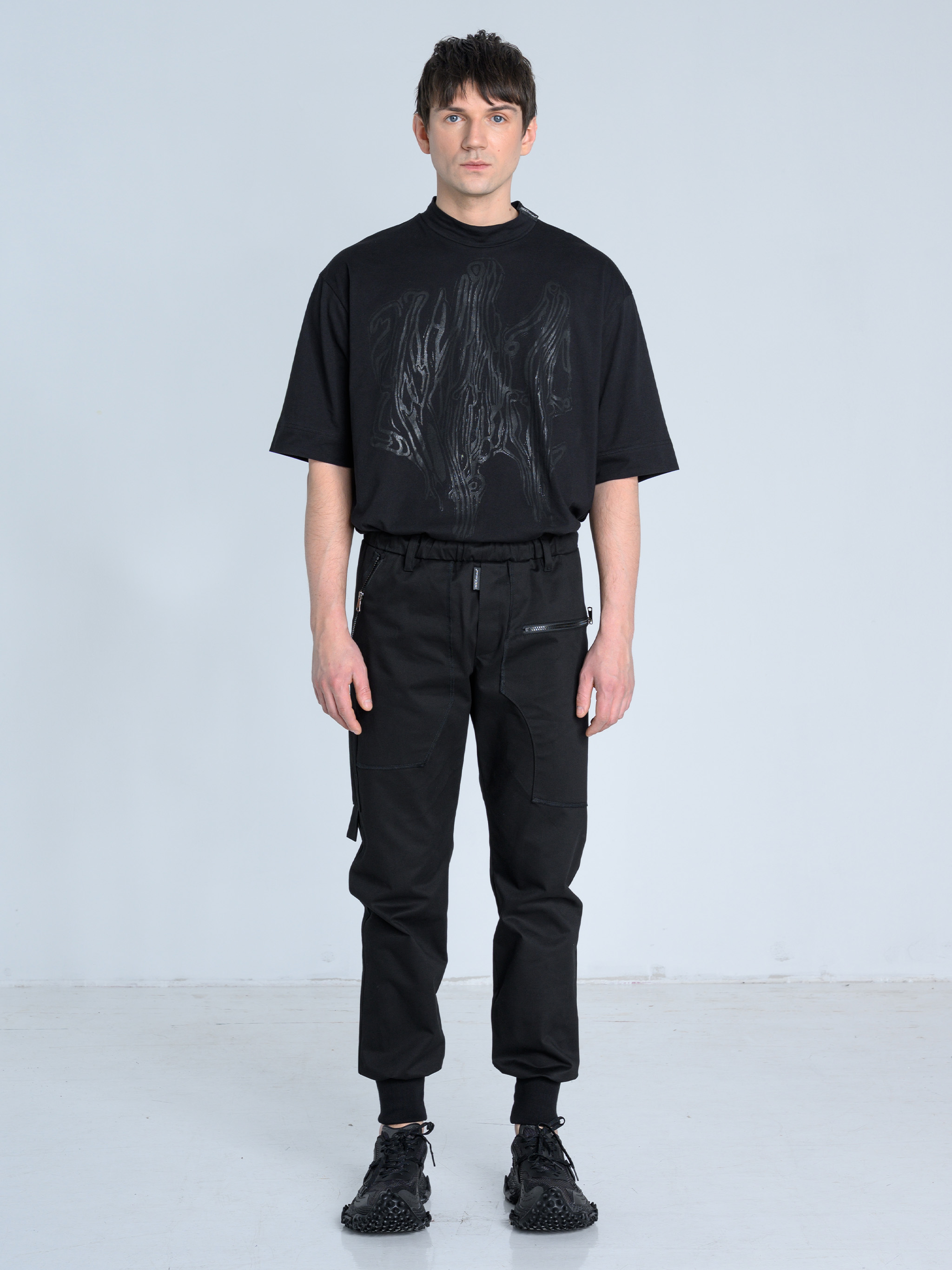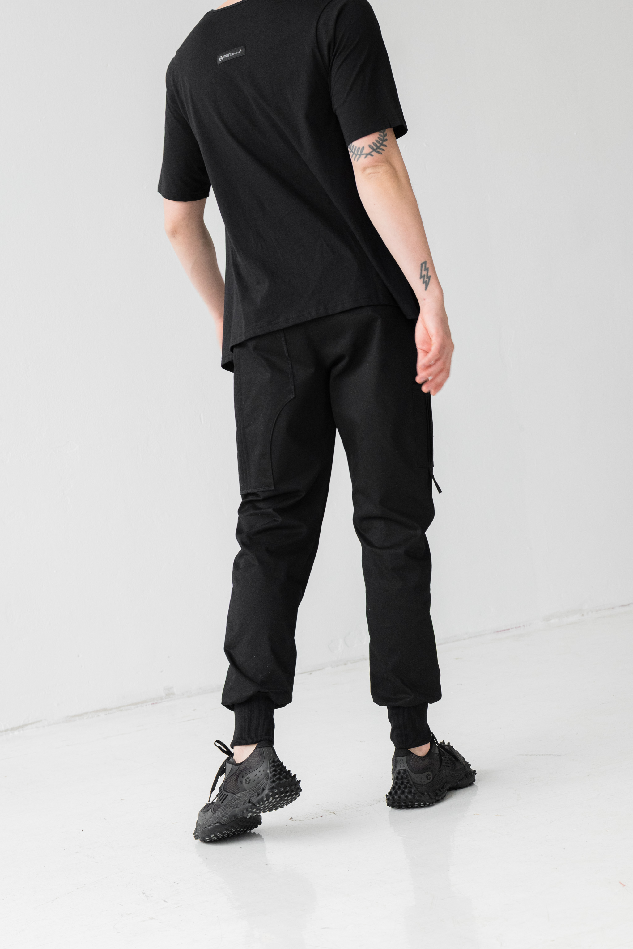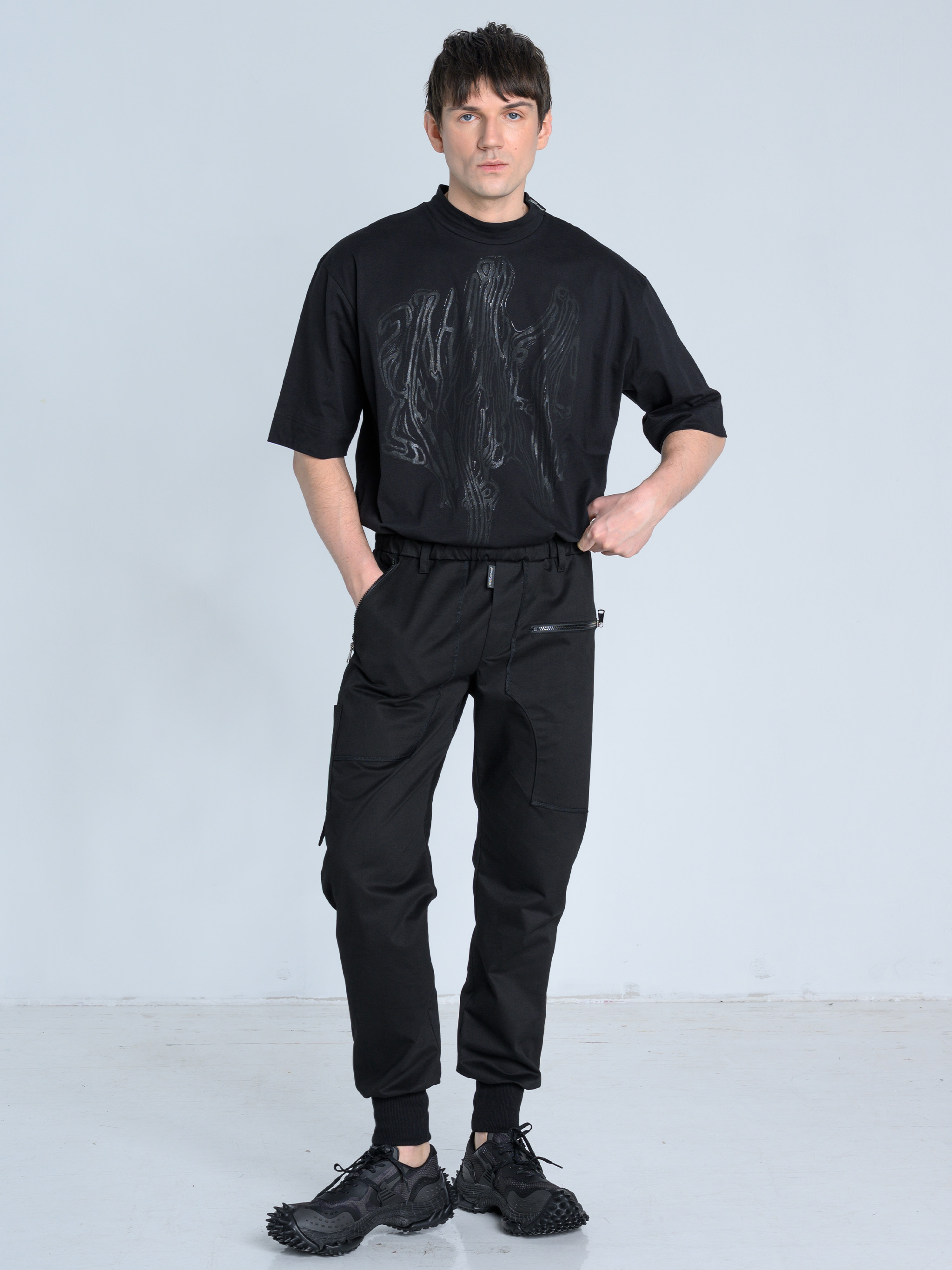 - Dół nogawek zakończony wysokim elastycznym ściągaczem