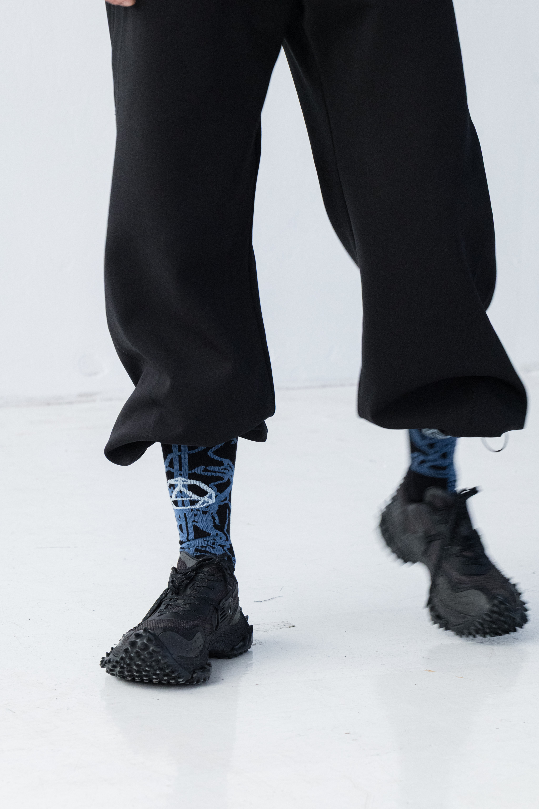 - Ręcznie nabijane oczka kaletnicze w kolorze ciemnego grafitu na dole nogawek
