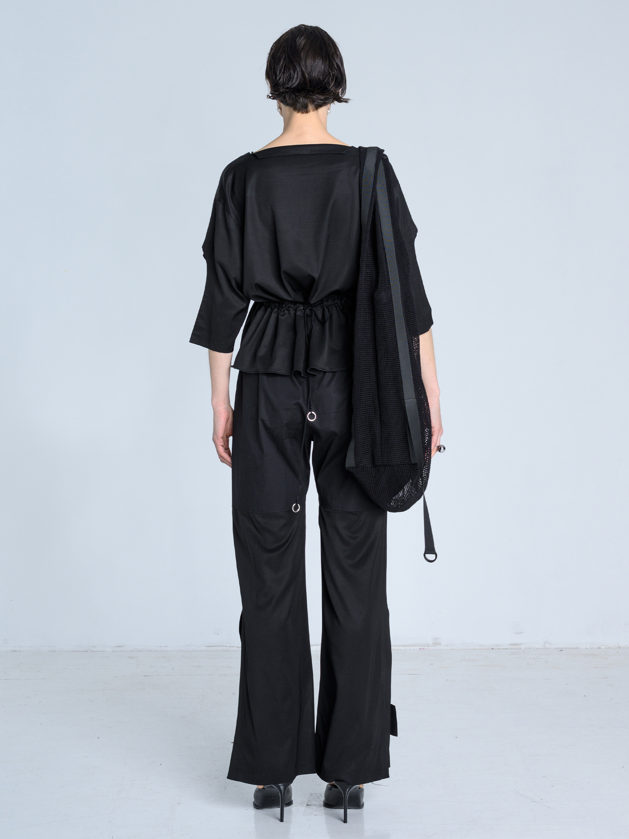 - Po bokach ozdobne taśmy zakończone przelotkami, brzegi torby estetycznie wykończone lamówką